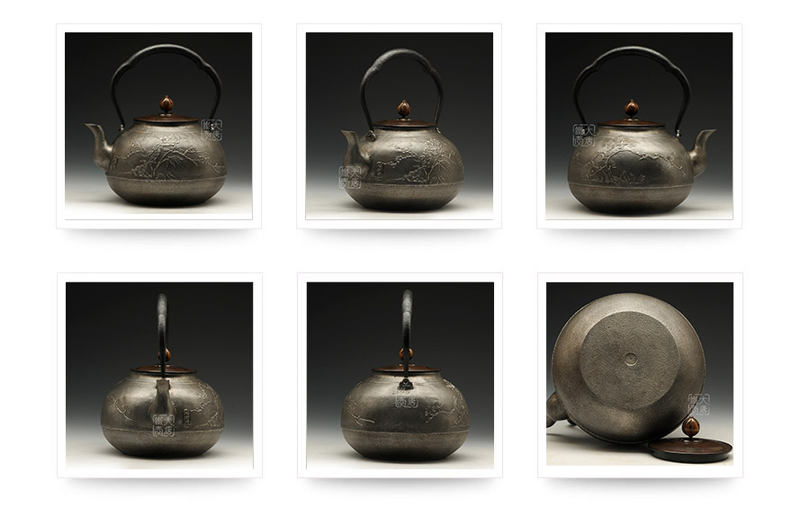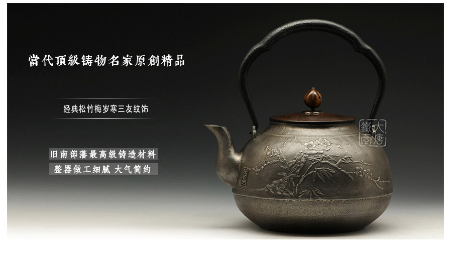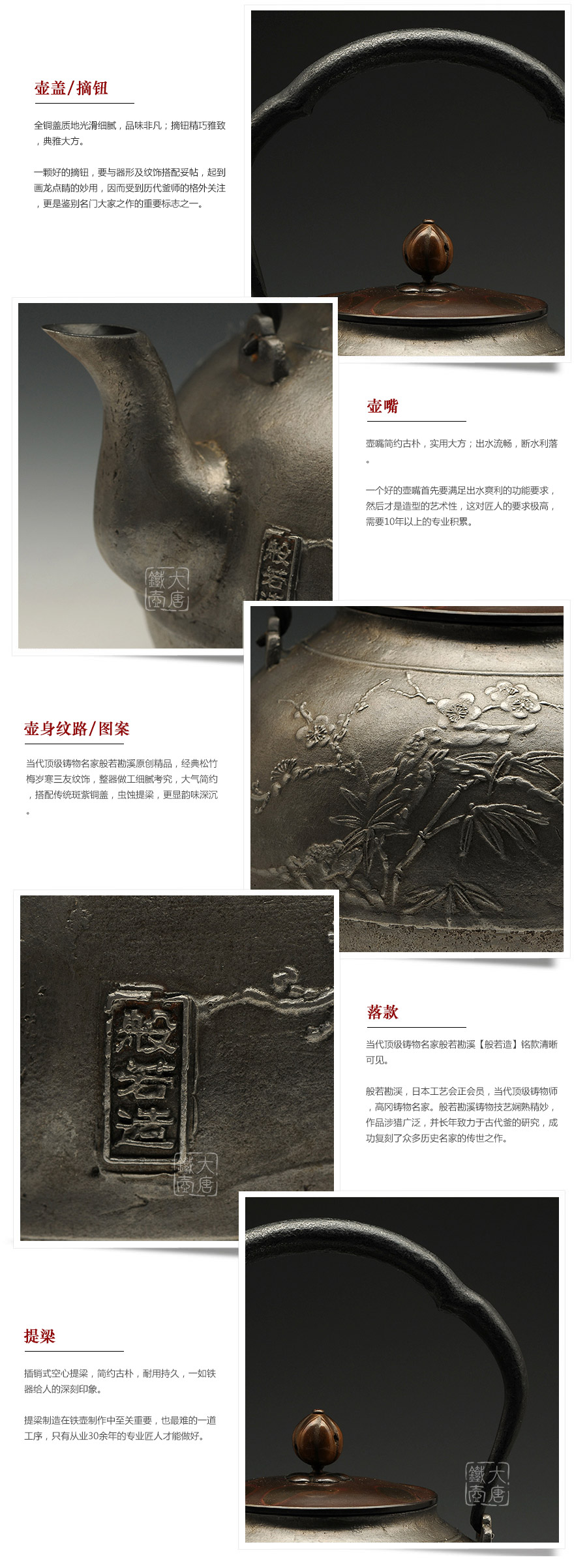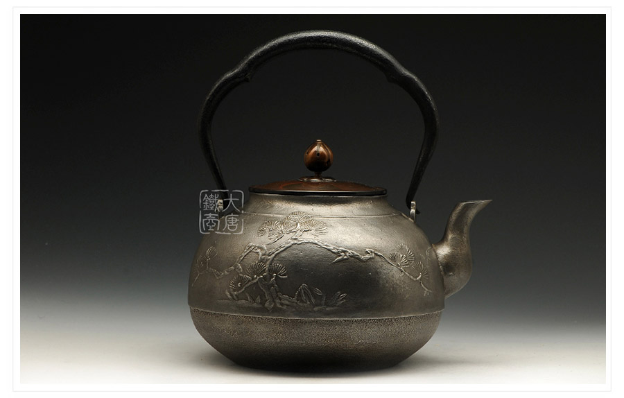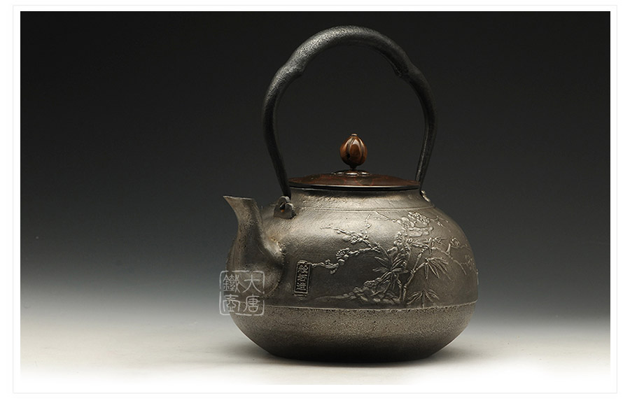 當代頂級鑄物名家般若勘溪原創(chuàng)精品,經(jīng)典松竹梅歲寒三友紋飾,整器做工細膩考究,大氣簡約,搭配傳統(tǒng)斑紫銅蓋,蟲蝕提梁,更顯韻味深沉。