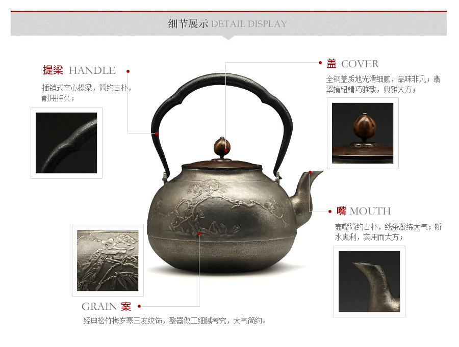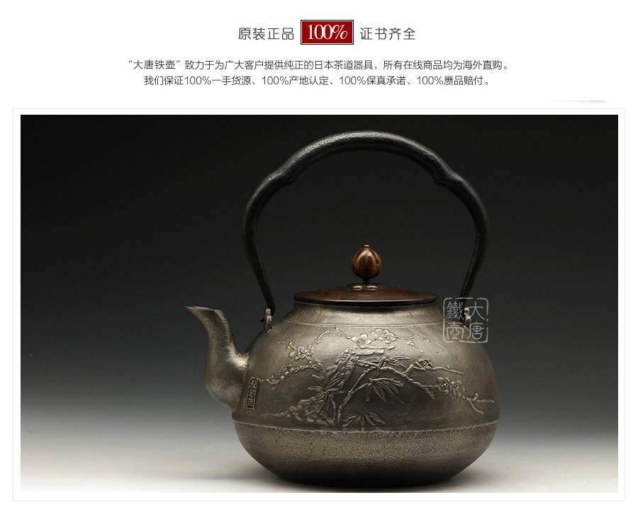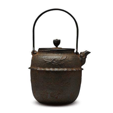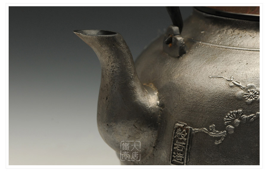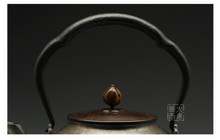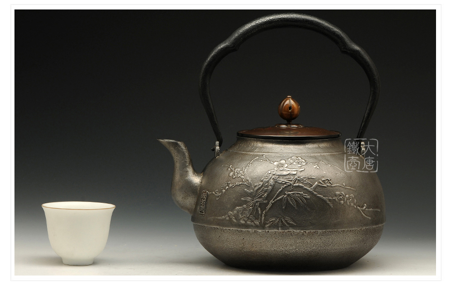 當代頂級鑄物名家般若勘溪原創(chuàng)精品,經(jīng)典松竹梅歲寒三友紋飾,整器做工細膩考究,大氣簡約,搭配傳統(tǒng)斑紫銅蓋,蟲蝕提梁,更顯韻味深沉。