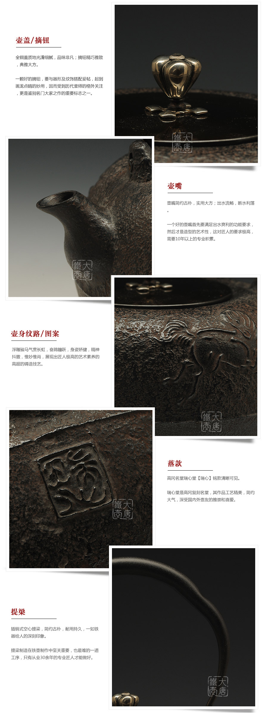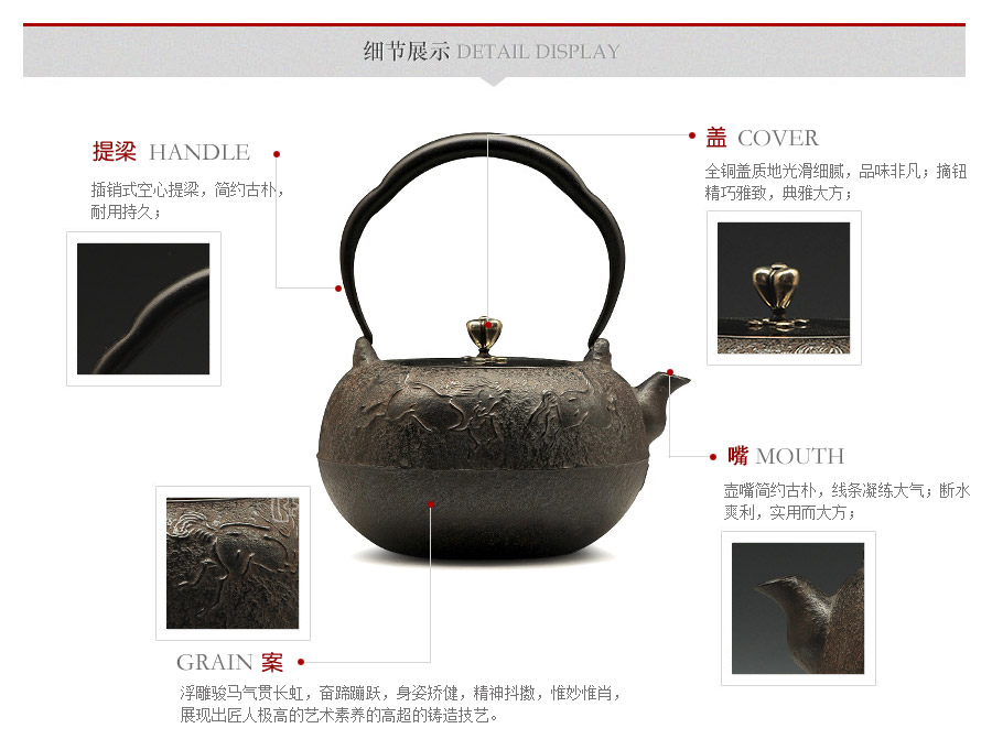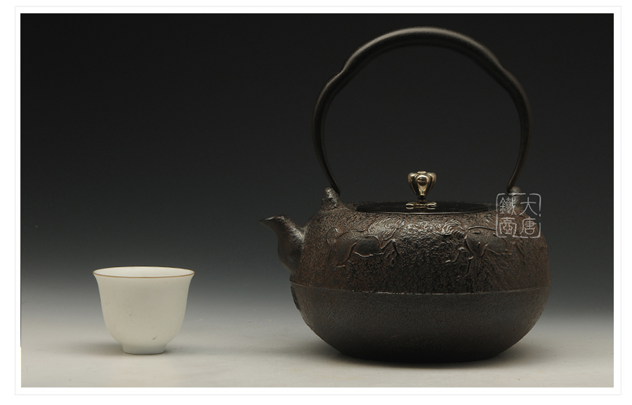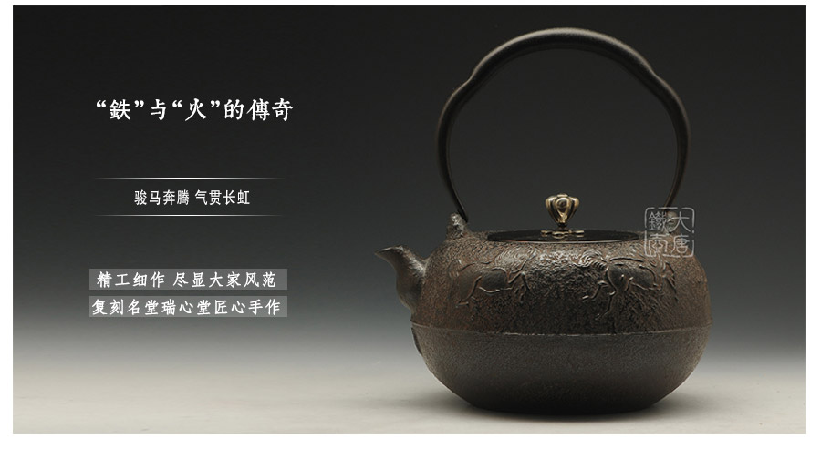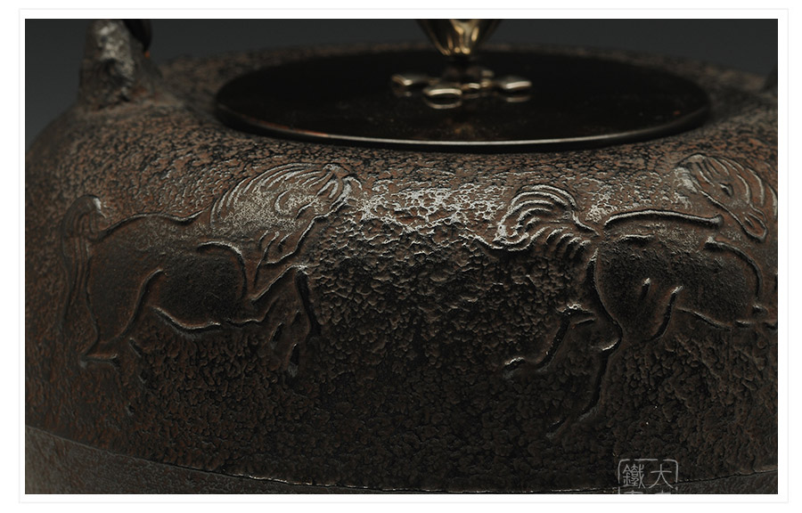 瑞心堂匠心手作,砂鐵肌理紋飾光鮮亮麗,浮雕駿馬氣貫長虹,奮蹄蹦躍,身姿矯健,精神抖擻,惟妙惟肖,展現(xiàn)出匠人極高的藝術素養(yǎng)的高超的鑄造技藝。