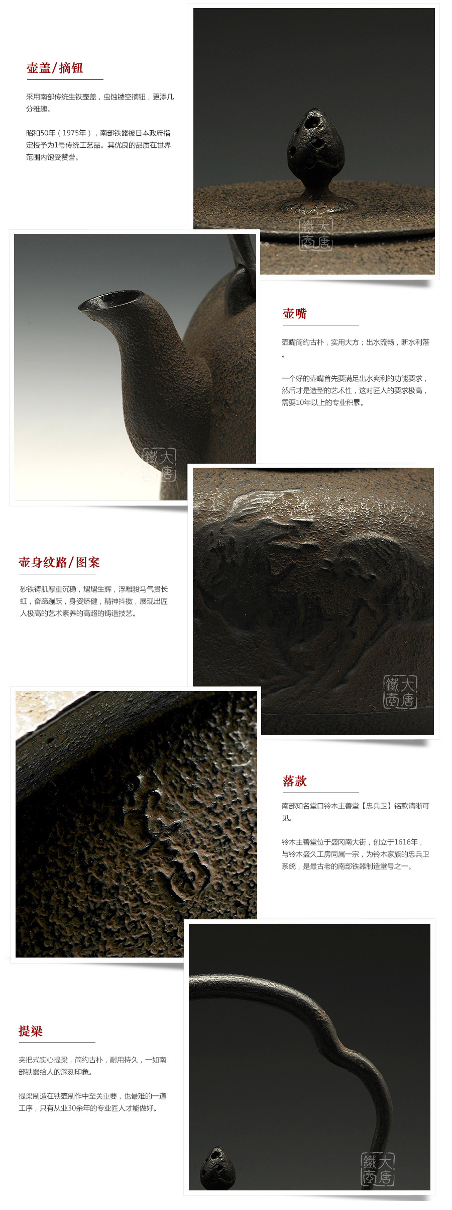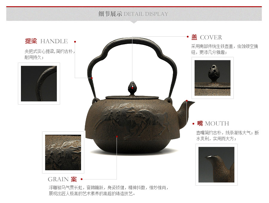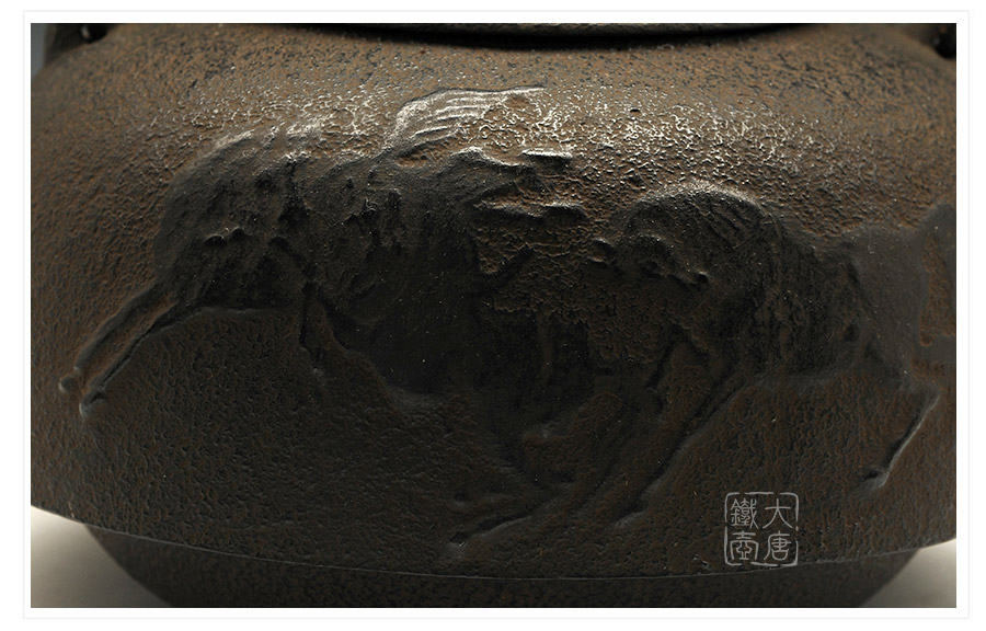 鈴木主善堂匠心之作,一模一具,純手工砂鑄成型。浮雕駿馬氣貫長虹,奮蹄蹦躍,身姿矯健,精神抖擻,惟妙惟肖,展現(xiàn)出匠人極高的藝術素養(yǎng)的高超的鑄造技藝。