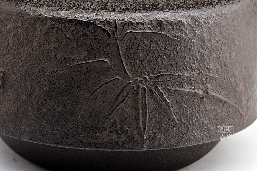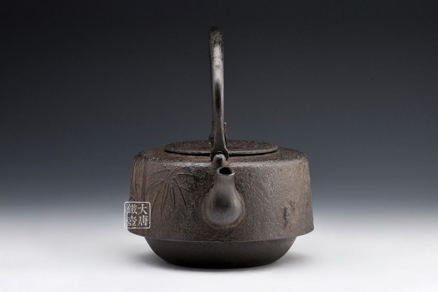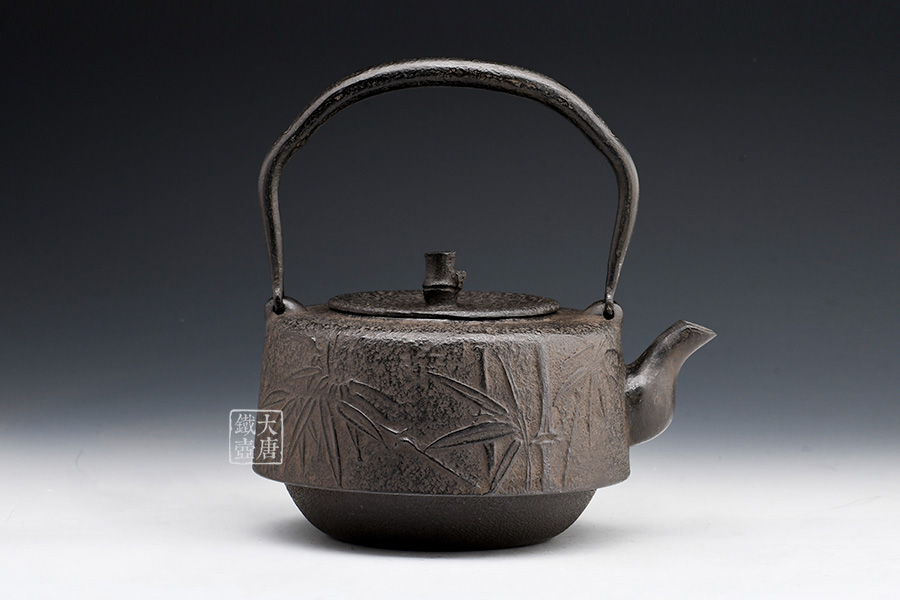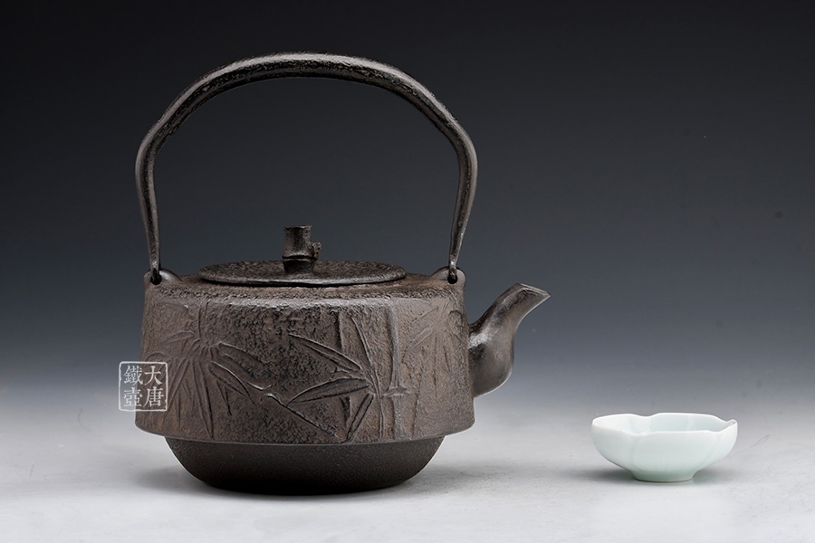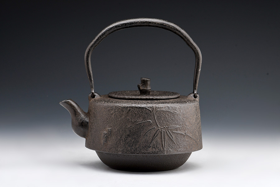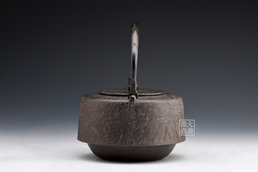 南部水澤名師巖戶賢一郎作品,傳統(tǒng)手工工藝,萬代型,造型端莊,著色質(zhì)樸;兩側(cè)竹紋雕琢細(xì)膩,惟妙惟肖;生鐵壺蓋,麒麟摘鈕,質(zhì)樸淳厚。