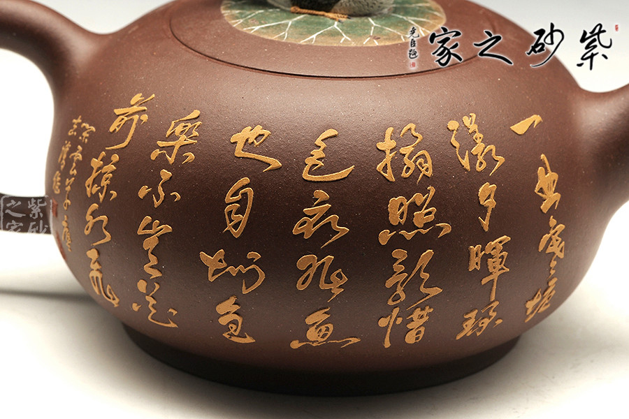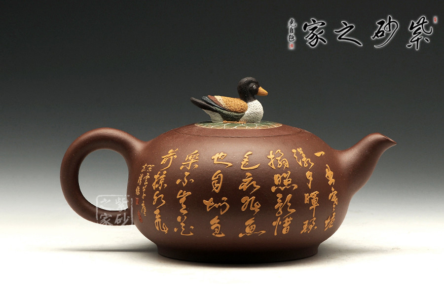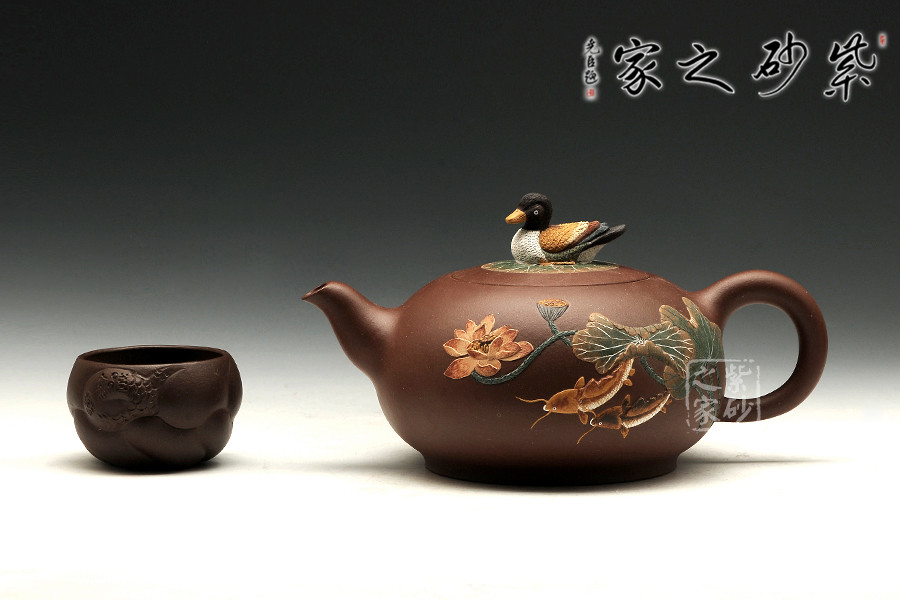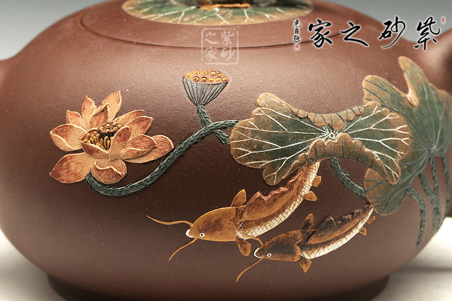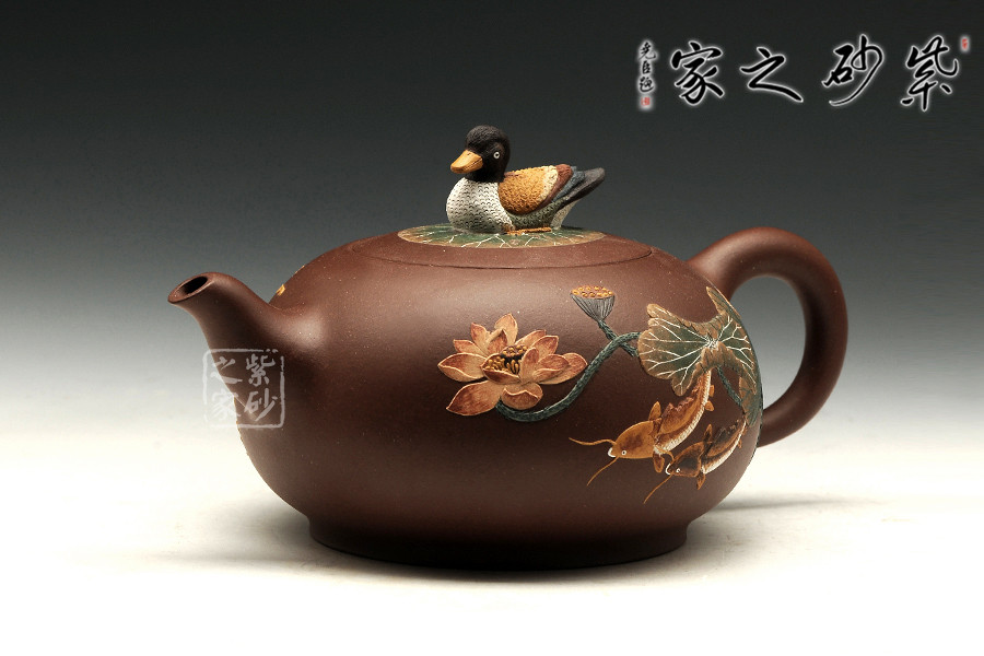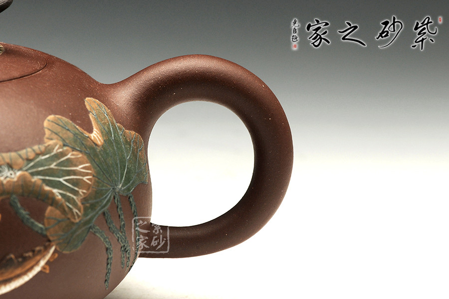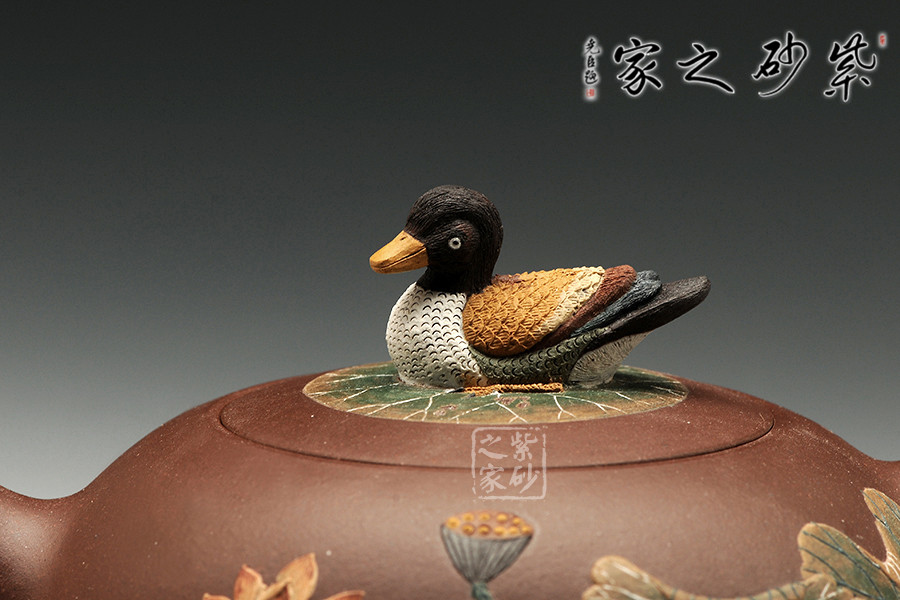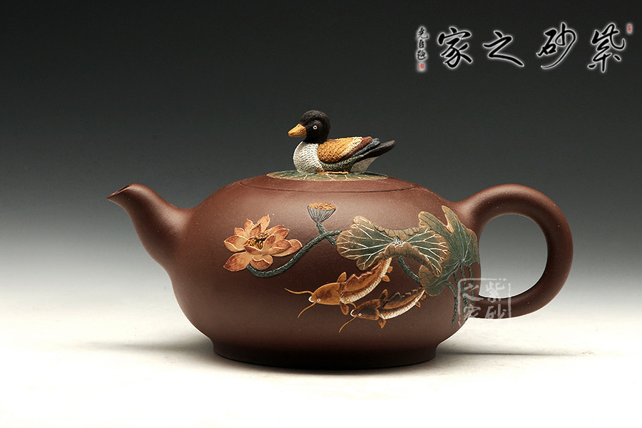 “荷香鴨肥”是中國(guó)傳統(tǒng)文化中吉利的代表,荷花自古有“予獨(dú)愛蓮之出淤泥而不染,濯清漣而不妖”,具有"花中君子"的美譽(yù),從這里可以看出詩人暗示人們學(xué)習(xí)蓮花潔身自好的高貴品質(zhì)。圖中“魚”的發(fā)音與“余”是同音,代表年年有余?!磅帯钡陌l(fā)音與“利”相同,所以鯉魚也用來象征生意中收益和盈利。“鴨肥”也說明日子過得自在。此把“荷香鴨肥”壺表達(dá)了作者對(duì)美好生活的向往和祝福!