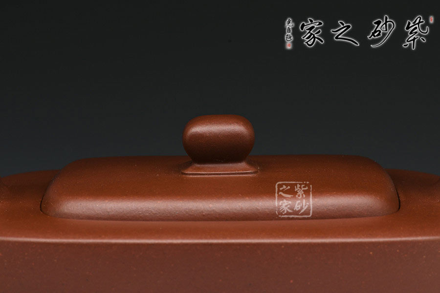 作品壺身四方為形,線條得體又挺括,十分有張力。提梁設(shè)計(jì)與整體形成虛實(shí)對(duì)比,轉(zhuǎn)折過(guò)渡自然。壺型簡(jiǎn)潔質(zhì)樸,卻嘴、蓋、鈕、底處處體現(xiàn)其精妙之處,足以證明老師過(guò)人的全手工制壺技藝。