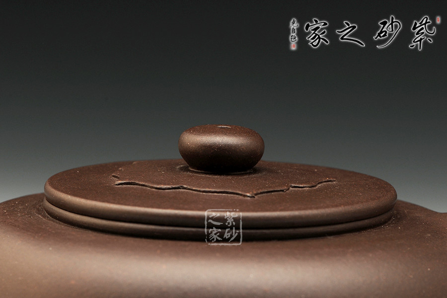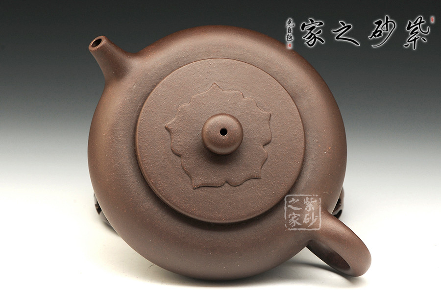此扁腹壺在壺身上極力體現(xiàn)了“扁”與“圓”,大口蓋也是突出了壺體的渾厚。壺身極扁,且壺肚大,壺底與壺口呼應(yīng),口徑一致,整個(gè)呈扁鼓形,耳形壺把也相應(yīng)更端正一些,壺嘴也更直爽精悍。最大的不同在于壺蓋的設(shè)計(jì),壺蓋為平蓋,且壺口高聳,壺蓋邊緣與壺肩并不接觸,蓋面還有一圈菱花紋飾,增添一絲別致。壺鈕與壺身呼應(yīng),同為扁圓。整壺精致干練,值得收藏。