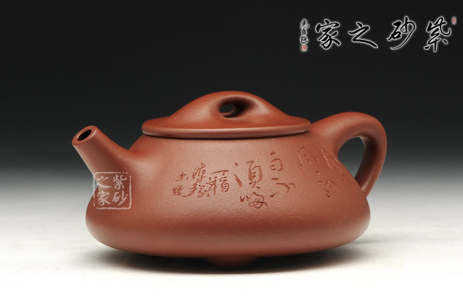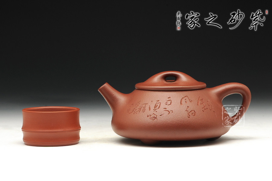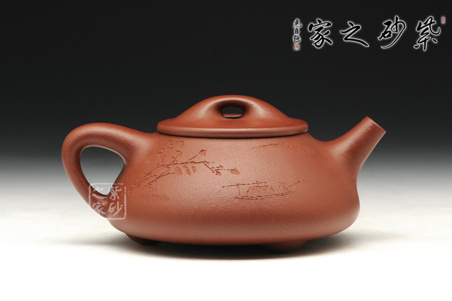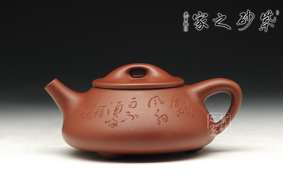 該壺造型簡(jiǎn)練,古樸大方,端莊穩(wěn)重,剛中有勁,敦實(shí)調(diào)和。闊口,短直流,環(huán)狀柄。壺蓋采用壓蓋式,橋形鈕,斜腹?jié)u收,圓底飾以三鼓釘為足。石瓢壺為光素器,制作難度大,全憑流、把、鈕及壺身的比例搭配來(lái)把握作品風(fēng)格。此壺造型挺拔,加之以上好朱砂泥制成,觀之光芒內(nèi)斂,韻味深沉。