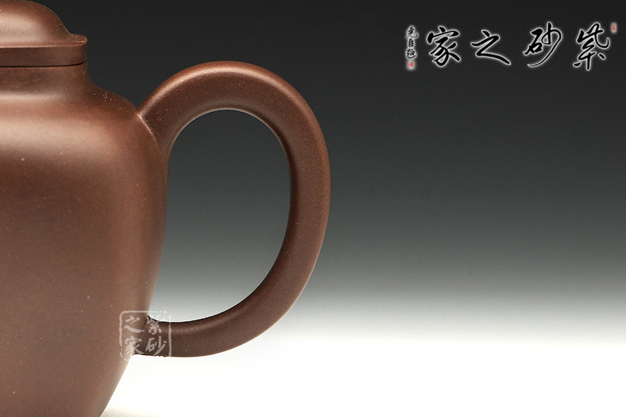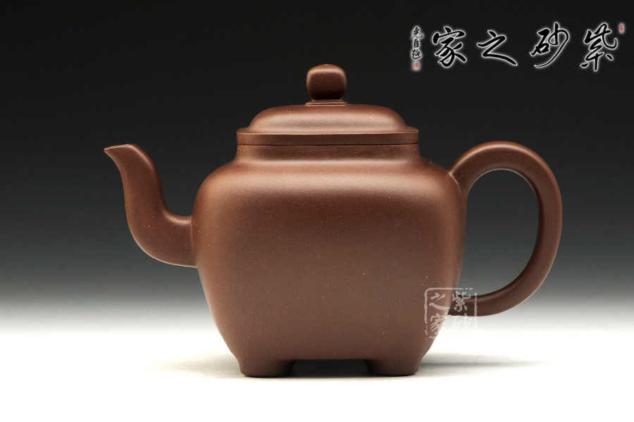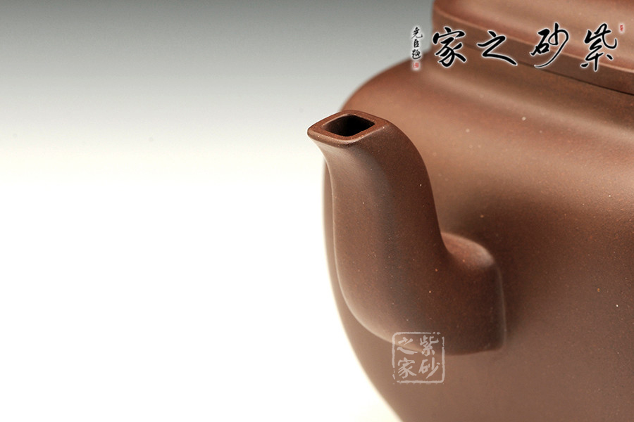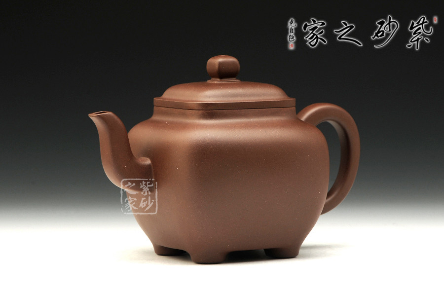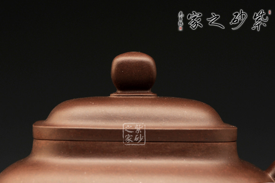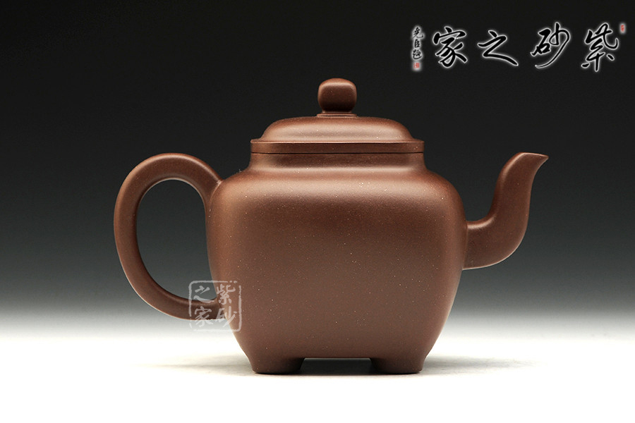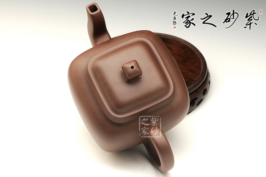 此壺壺面呈四方,鼓腹飽滿,棱角渾樸有致,三彎流式胥出,弧把昂揚(yáng),蓋呈方形圓角,唇邊厚實(shí),蓋面平弧微穹,中心鈕滴似如算珠,四足承平底。此壺器型方中有圓,圓中寓方,比例均勻,珠圓玉潤,如此技藝名至實(shí)歸。