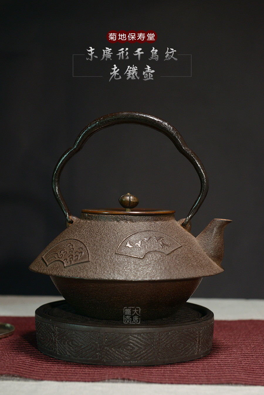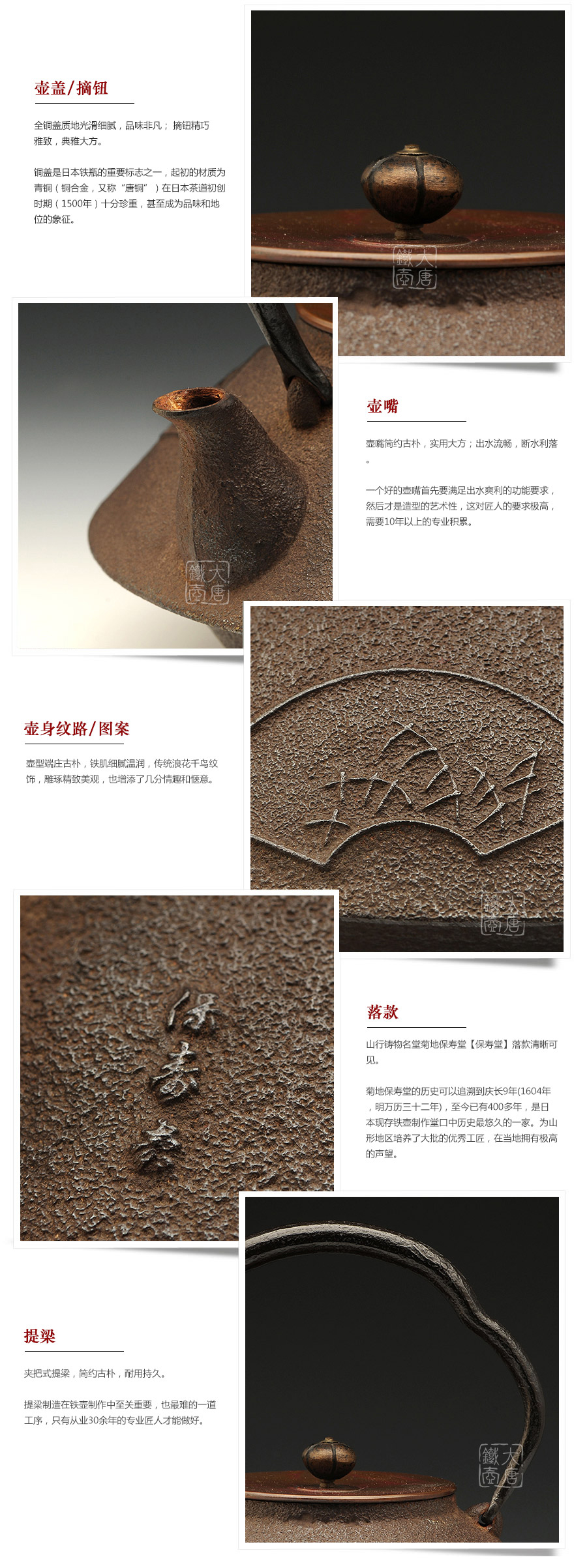 菊地保壽堂的歷史可以追溯到慶長9年(1604年)。當時的山形城主最上義光將初代喜平治聘請為御用鑄物師,開始鐵瓶和茶釜的鑄造。后來,由于冶煉技術的 進步,日本傳統(tǒng)“和銑”逐步被“洋銑”所取代,到昭和初年 “和銑”技術在日本徹底消失失。為了恢復這一日本傳統(tǒng)技藝,菊地保壽堂經(jīng)過十三和十四代菊地正直二十多年的研制,成功恢復了“和銑”技術,并一直獨自保存 傳延續(xù)至今。現(xiàn)在,日本國寶級的鐵瓶、釜的修繕工作一直由“菊地保壽堂”承擔,幾代皇室,也數(shù)次收藏菊地保壽堂作品。