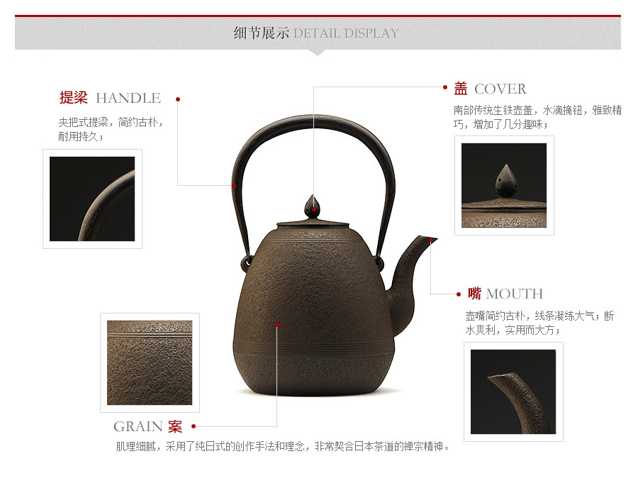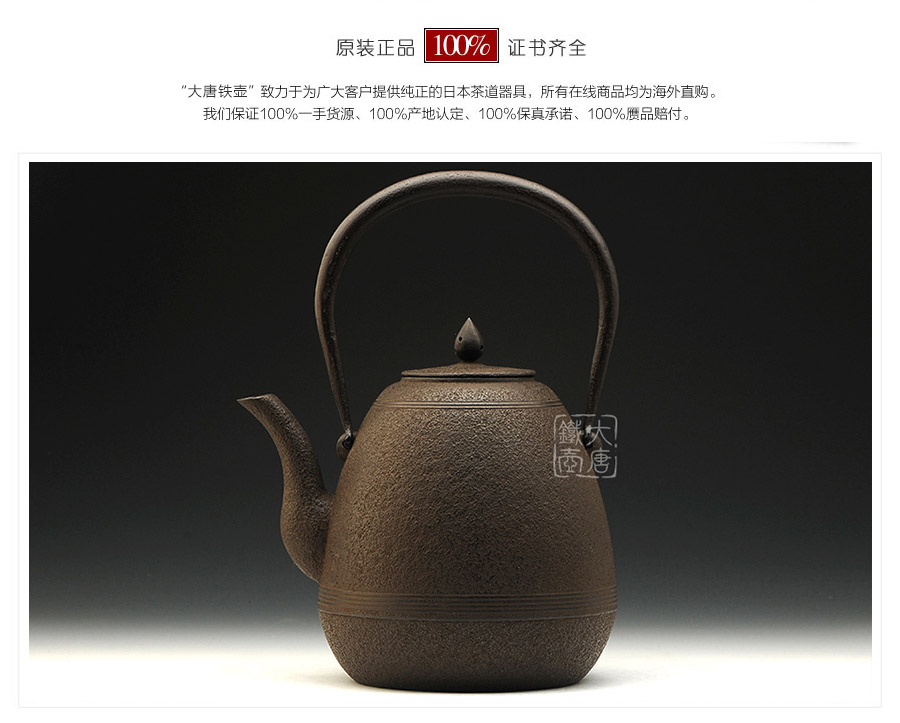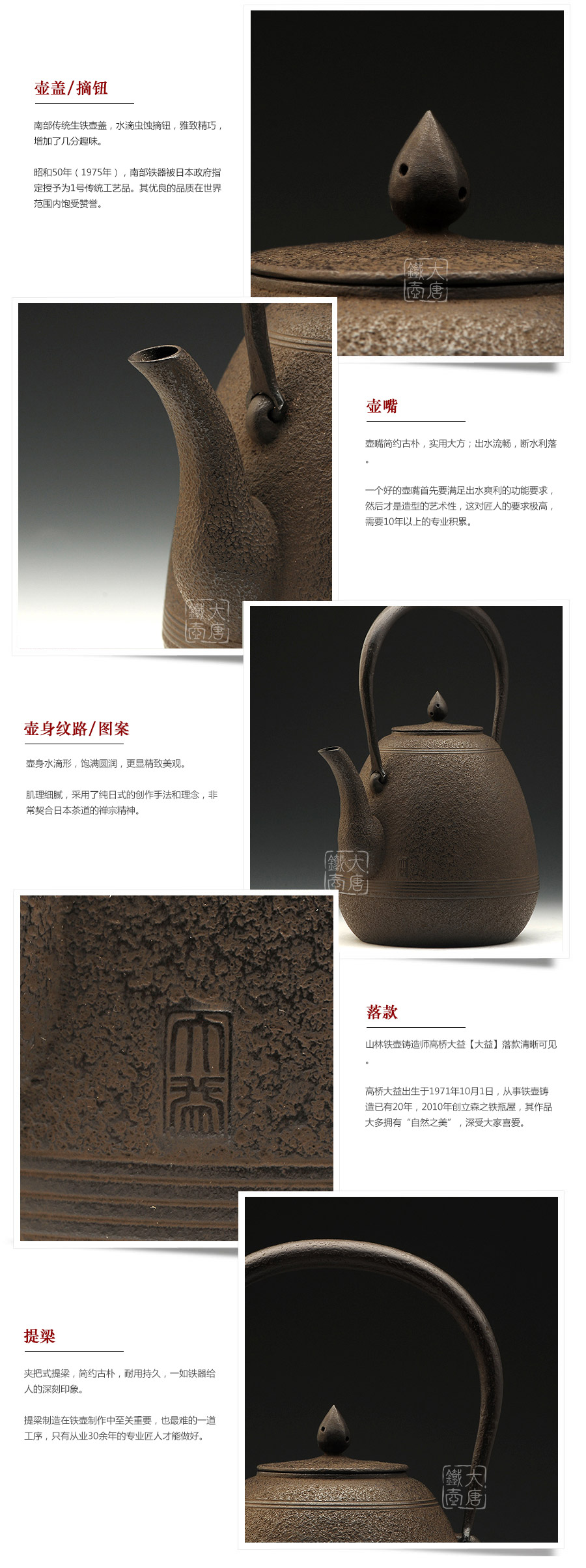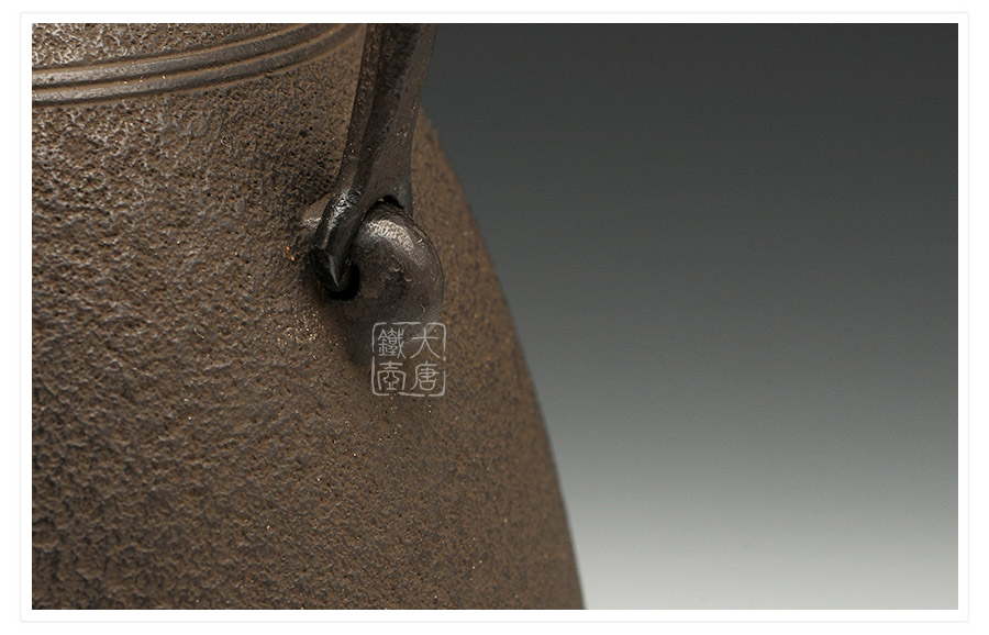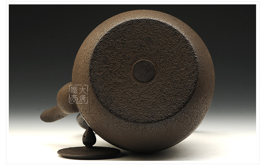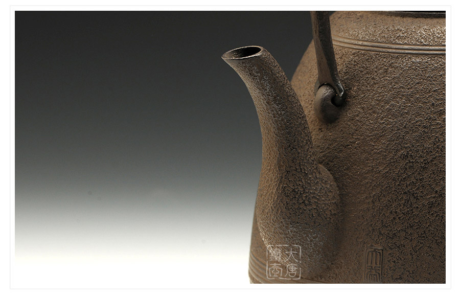 山林鐵壺鑄造師高橋大益作品,高橋大益的作品喜歡追求自然之美,肌理細(xì)膩,采用了純?nèi)帐降膭?chuàng)作手法和理念,非常契合日本茶道的禪宗精神。壺身水滴形,飽滿圓潤(rùn),更顯精致美觀。
