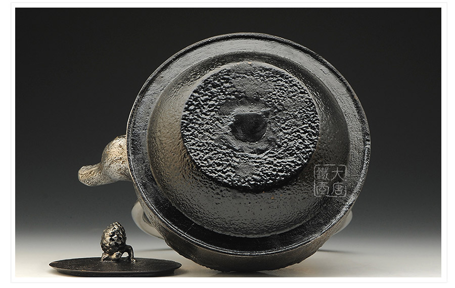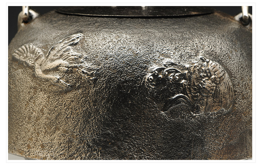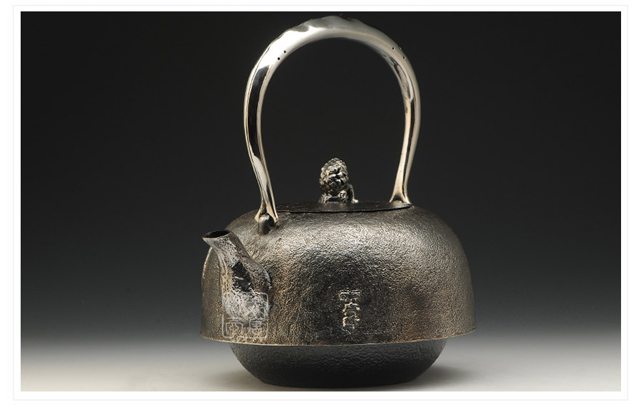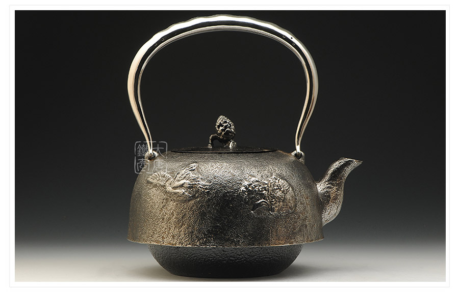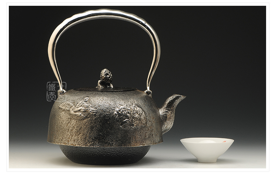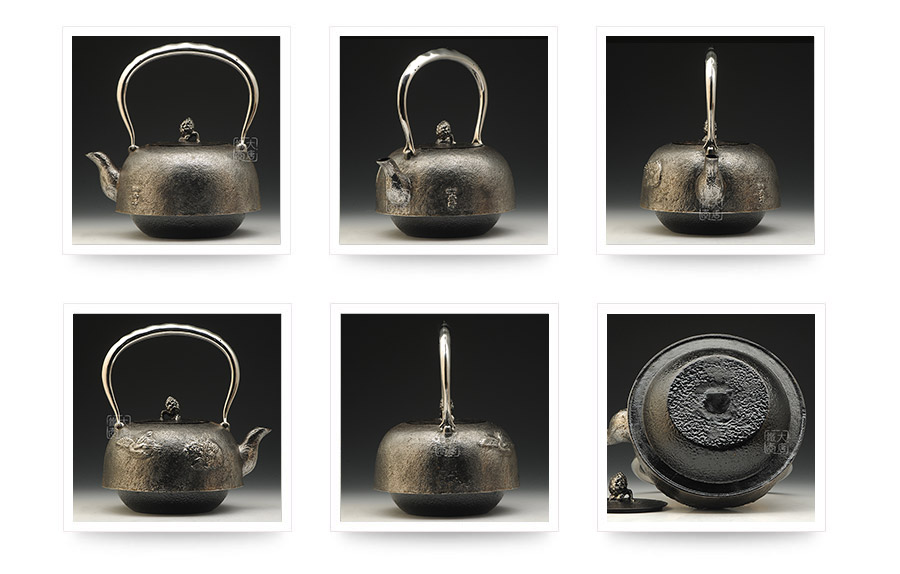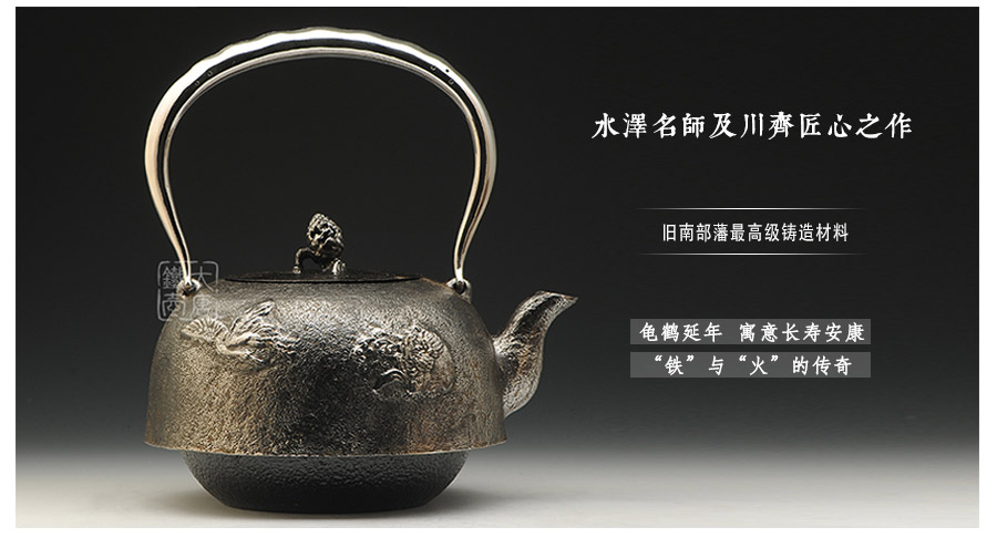 南部水澤名師及川齊作品,日本最高級砂鐵原料,傳統(tǒng)手工砂鑄工藝,經(jīng)典龜鶴延年紋飾,搭配夾把式空心提梁,整器簡約大方,寓意長壽安康,堪稱典范之作。