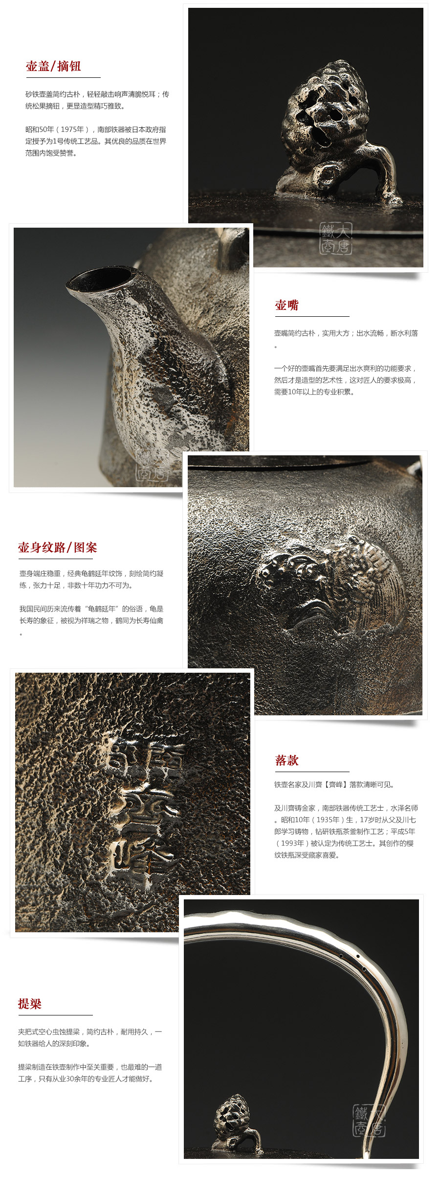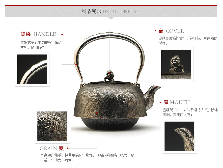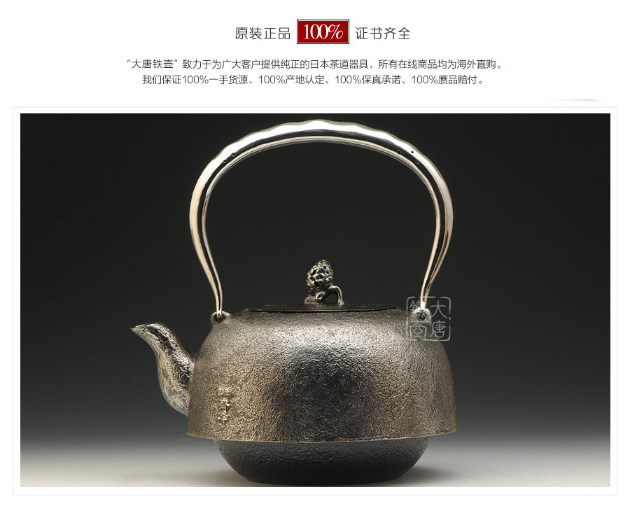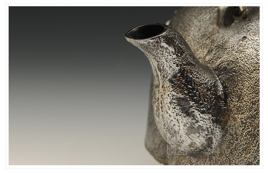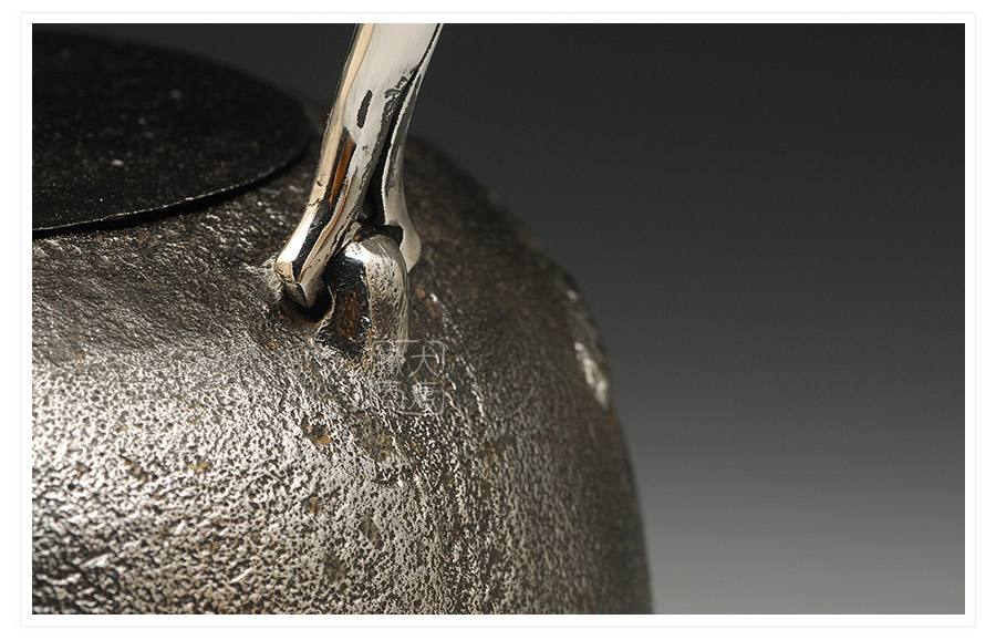 南部水澤名師及川齊作品,日本最高級砂鐵原料,傳統(tǒng)手工砂鑄工藝,經(jīng)典龜鶴延年紋飾,搭配夾把式空心提梁,整器簡約大方,寓意長壽安康,堪稱典范之作。