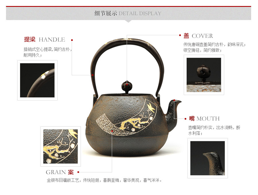 平安松壽堂匠心之作,京都鐵瓶嫡傳正宗,金銀布目鑲嵌工藝,傳統(tǒng)短冊(cè),喜鵲登梅,奢華美觀,喜氣洋洋。