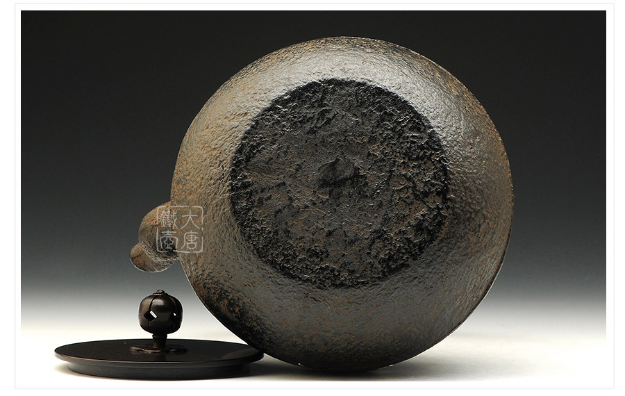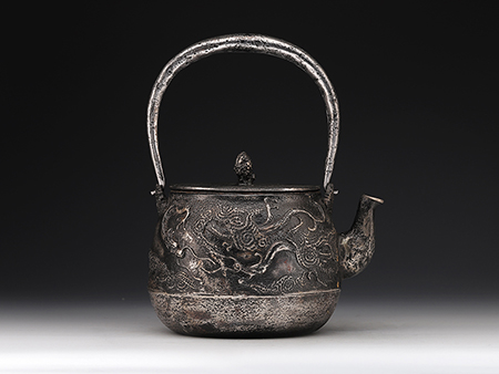 平安松壽堂(即松壽堂、西村松壽堂)是京都鐵瓶(也叫關(guān)西鐵壺)的典型代表,明治18年(1885年)由初代西村勝在京都寺町創(chuàng)建。平安松壽堂制作的鐵壺采用銅質(zhì)壺蓋,壺底內(nèi)側(cè)底部有板狀突起的“鳴金”,壺身或者提梁伴有金銀貴金屬鑲嵌的各式圖案或花紋,與京都寺町附近的龍文堂、雨宮金壽堂、云色堂等共同形成了獨(dú)特的京都鑲嵌特色。