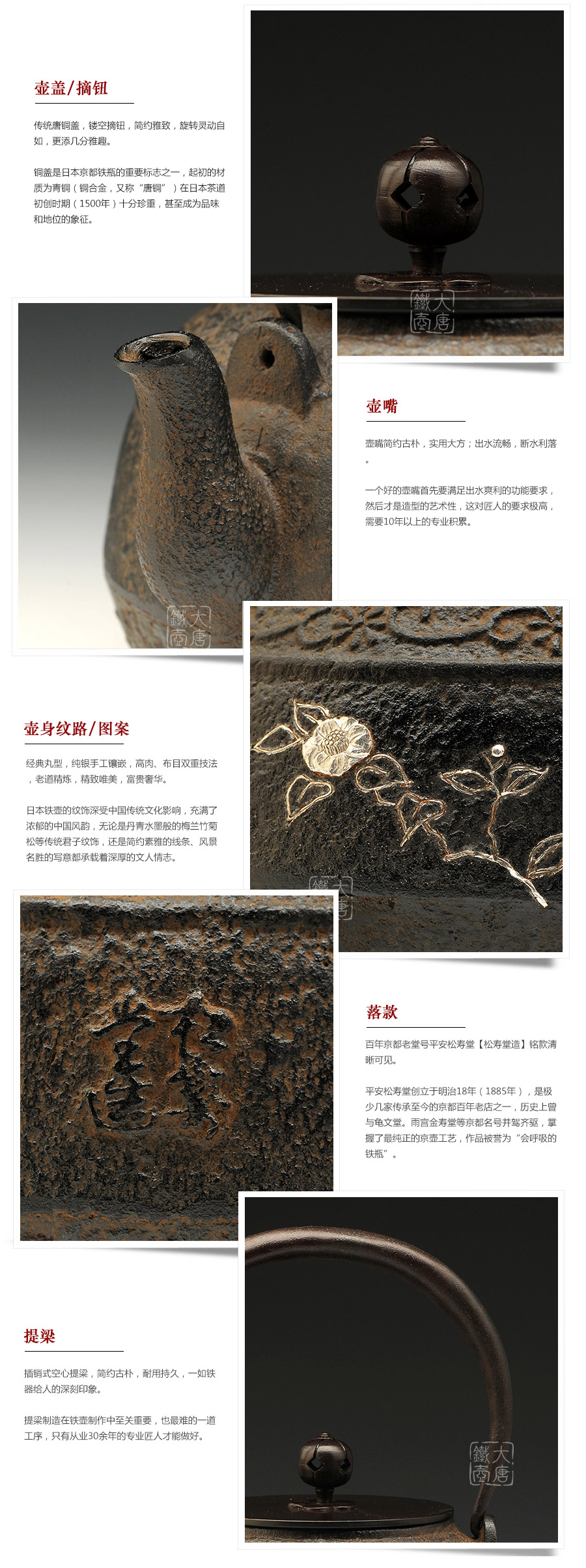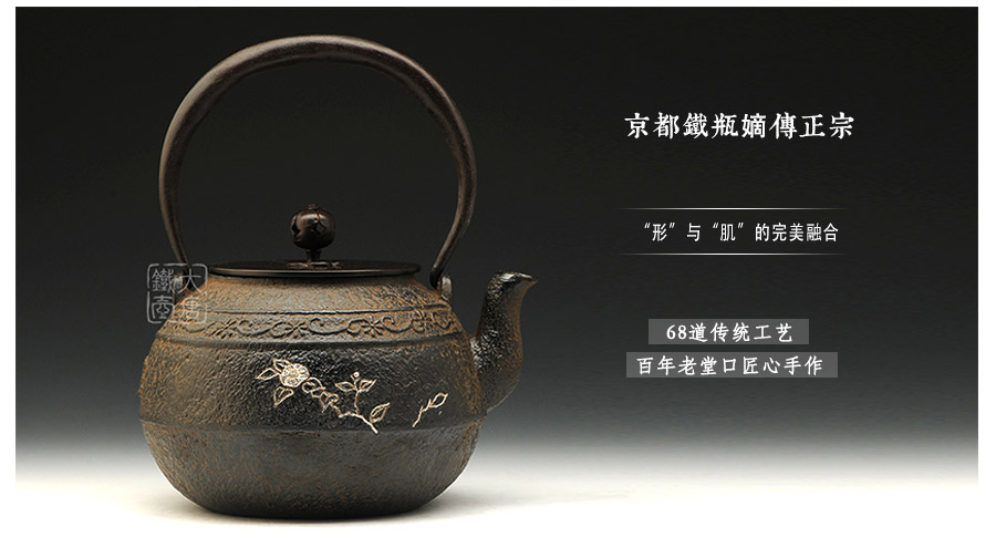 現(xiàn)在平安松壽堂已傳為4代目,致力于京都鐵瓶的制作和表面鑲嵌工藝的研究。