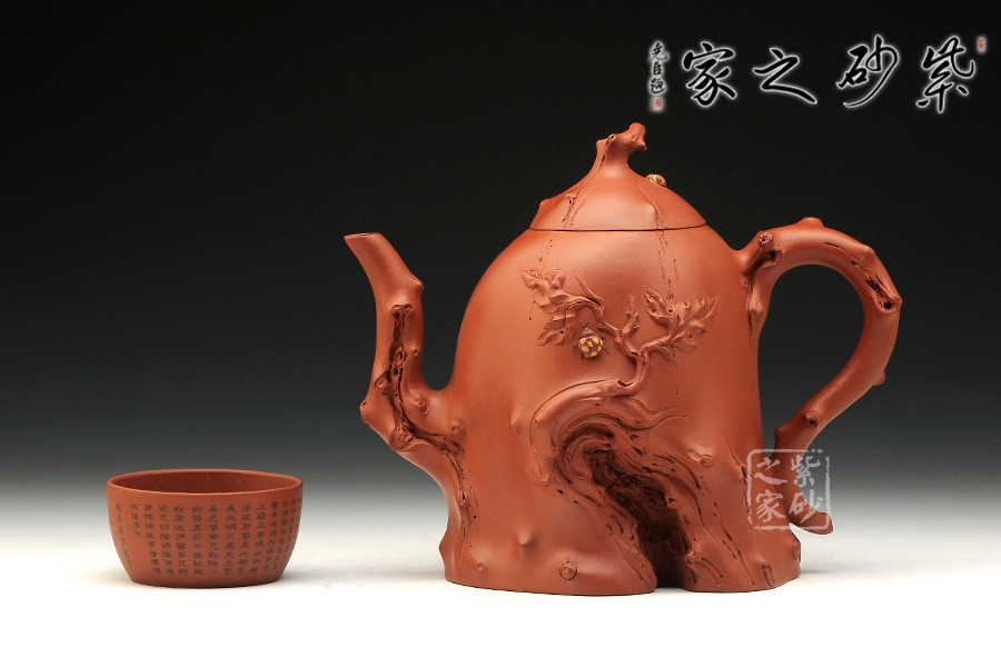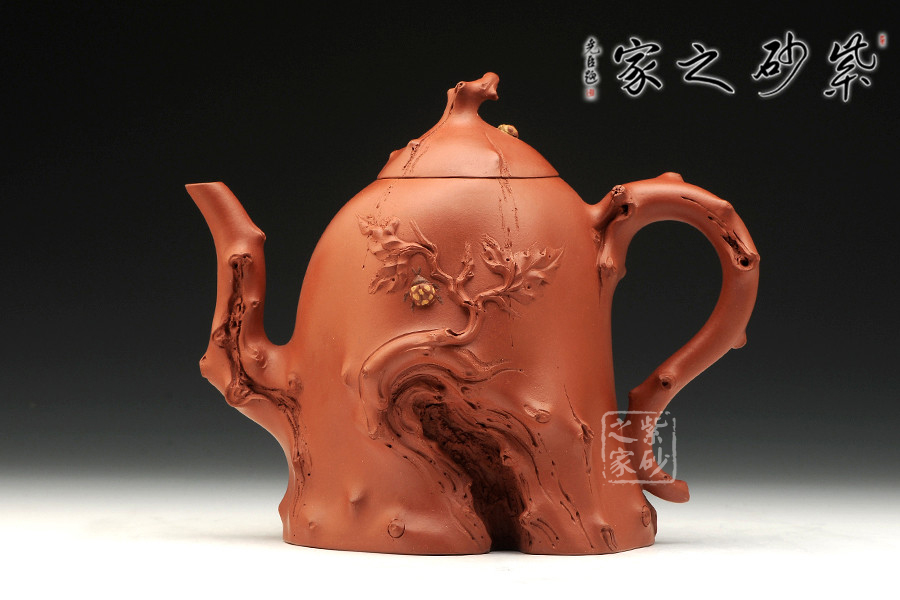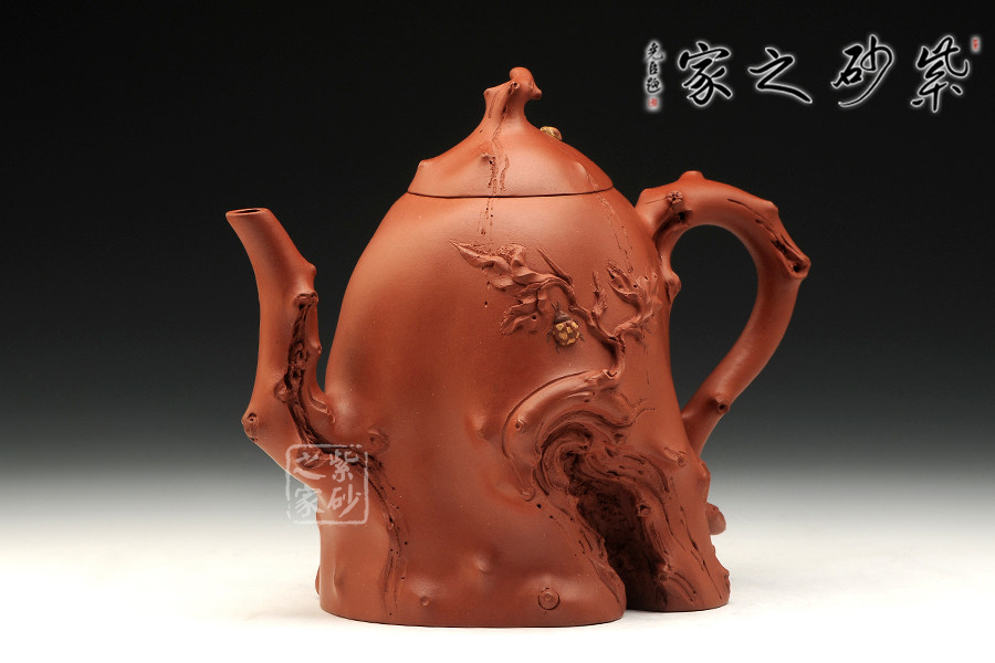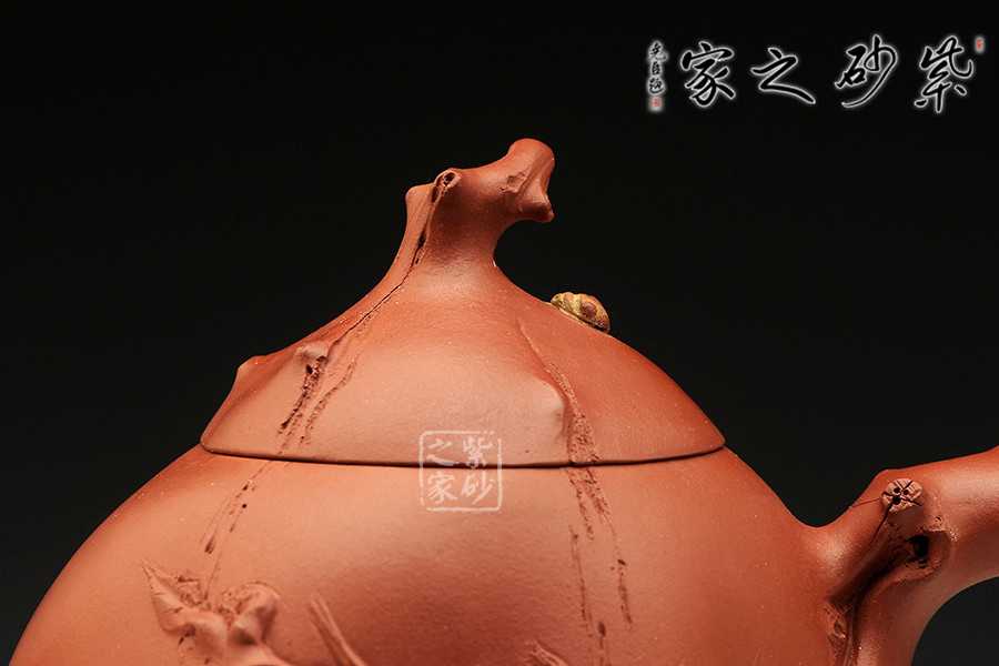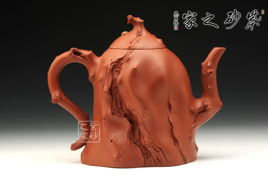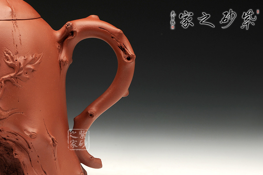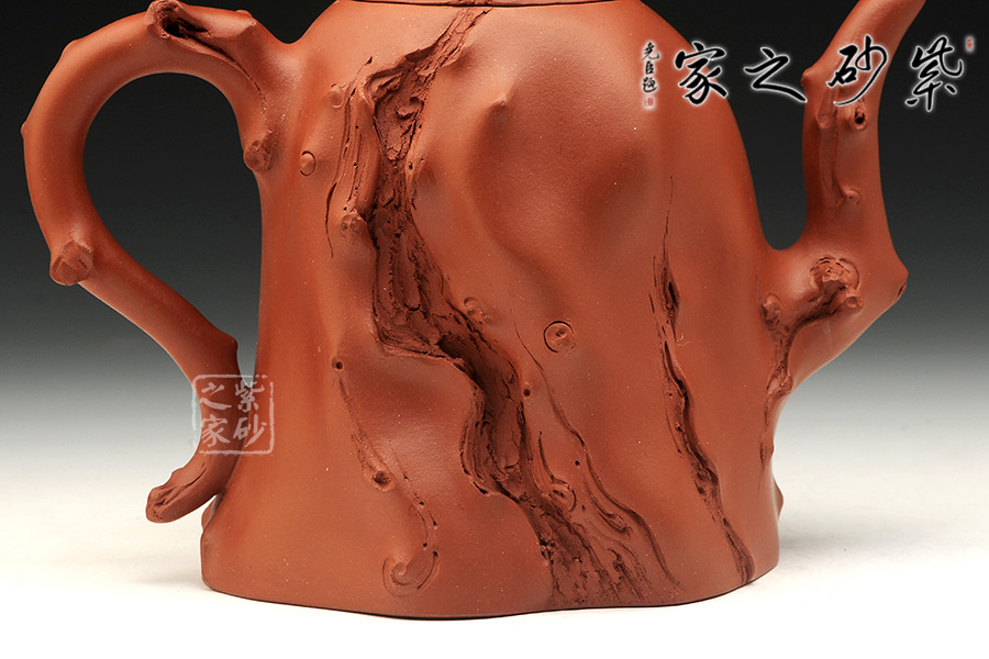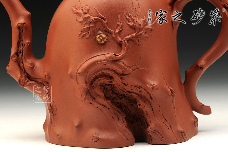 此作為景舟杯比賽作品,造型巧若天工,表現(xiàn)出精雕細(xì)工的高深制作功底。整器部分仿樹樁形態(tài),富有新藝,施藝嚴(yán)謹(jǐn),生氣勃勃。壺身下部為枯樹形狀,嘴、把、鈕以細(xì)條樹枝狀為形,雕琢逼真;一條條樹裂紋是歲月留下的痕跡,壺身與壺蓋之上各一只瓢蟲伏于上,小巧可愛,給人靜中有動的感覺。