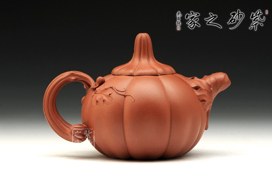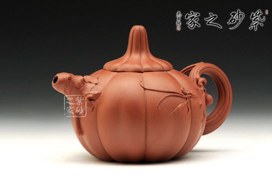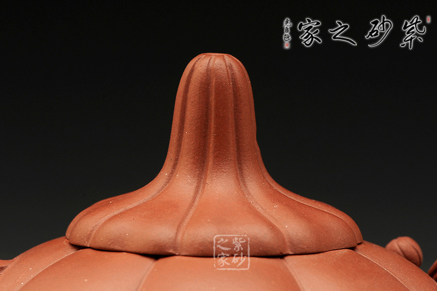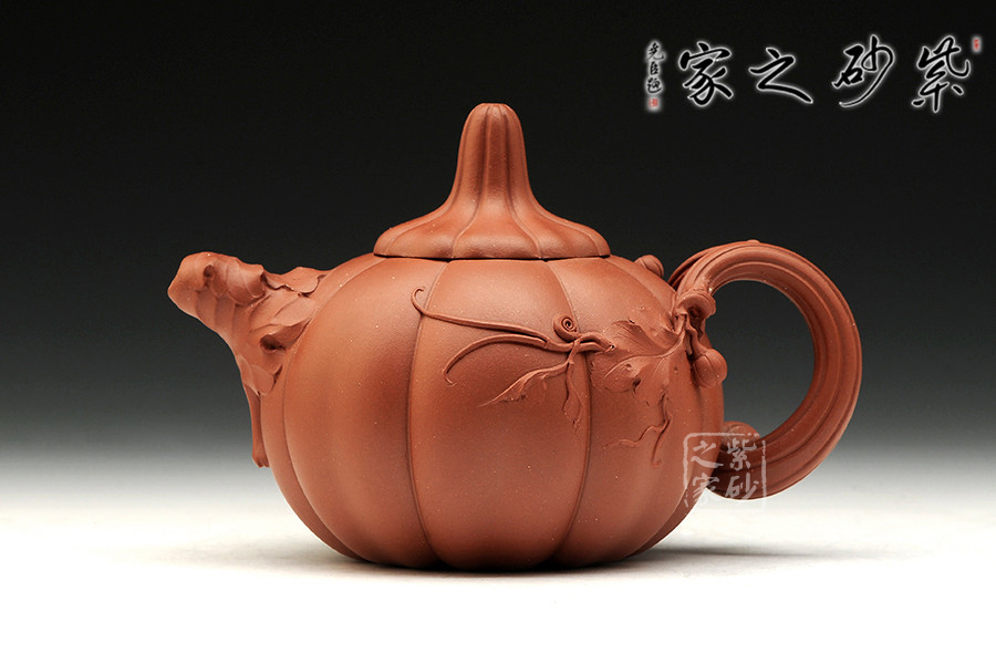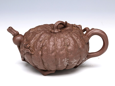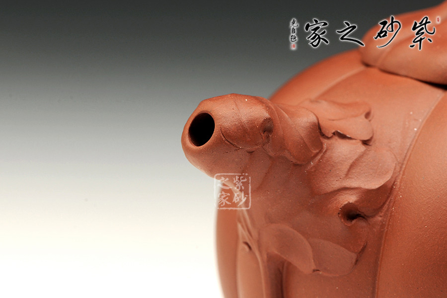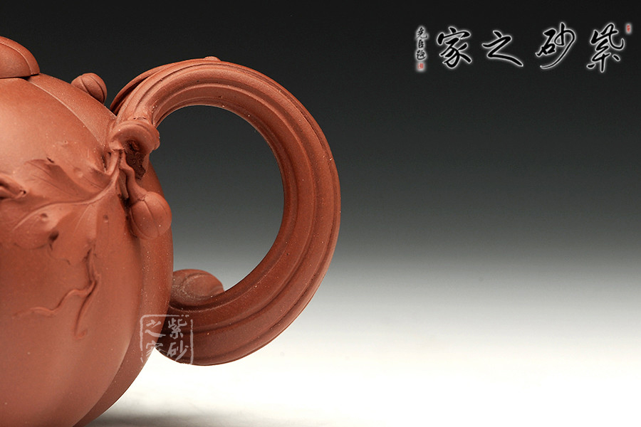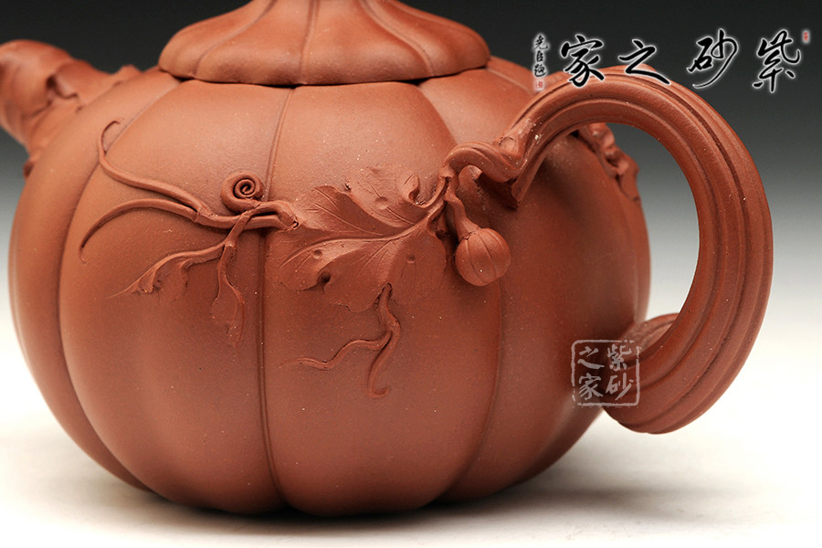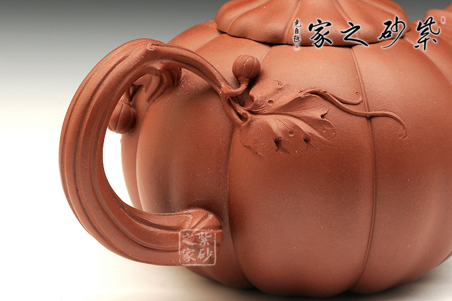 此南瓜壺做工精細(xì),泥料上乘,逸趣橫生,形象生動。是花塑器與筋紋器的結(jié)合,老師以其嫻熟的技藝,以及巧妙的設(shè)色,成功塑造出精致規(guī)整而富有生命的壺,展現(xiàn)出迷人風(fēng)姿。壺身由八瓣筋囊組成,飽滿潤澤,蘊(yùn)勢不露,以瓜葉包裹出短彎流,瓜藤為耳形把,瓜蒂為壺鈕,整器寓于和諧統(tǒng)一,生動形象。