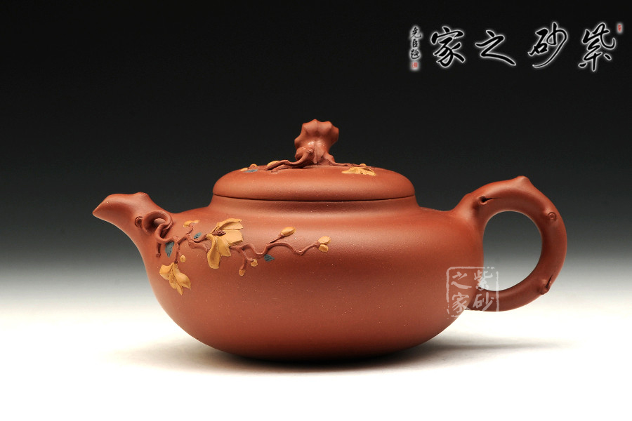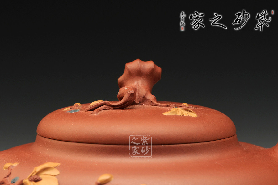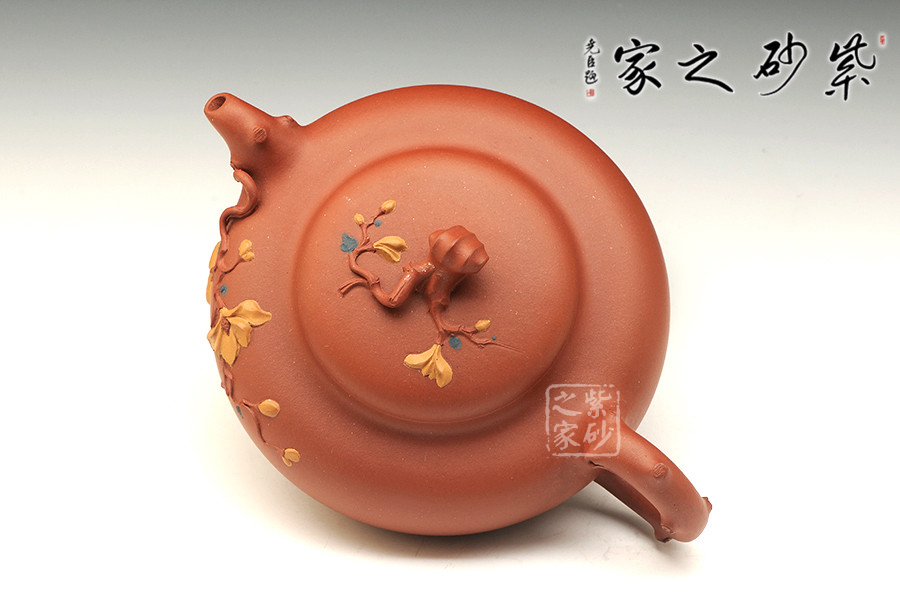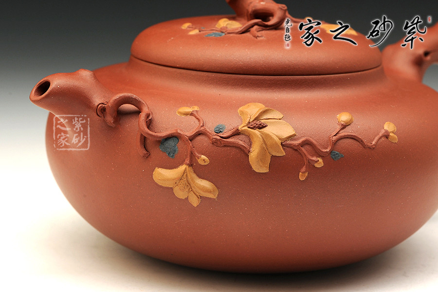 姹紫嫣紅,壺如其名,壺身泥繪花卉顏色各異,色彩豐富,形象逼真,筆畫(huà)細(xì)膩,刻畫(huà)深入。整壺扁圓,溜肩平坦,壺肩飽滿圓滑,上豐下斂,匯于壺底,口底呼應(yīng)。截蓋完美扣于壺口,蓋面微鼓,樹(shù)樁鈕形象,呼吁主題。整壺蘊(yùn)意美滿,是把玩泡養(yǎng)的佳作。