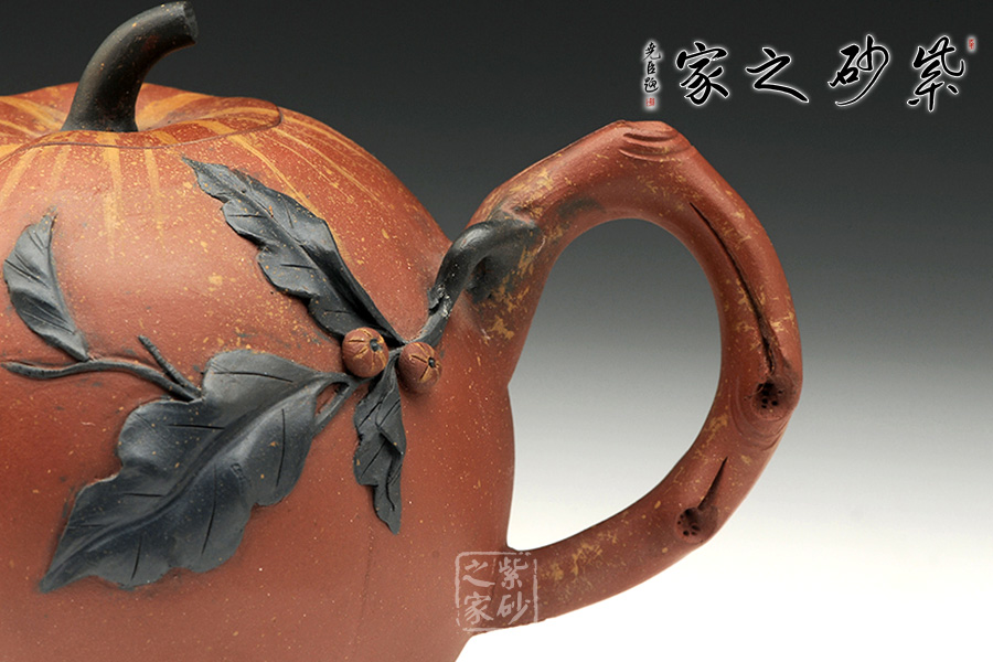 作品壺型整體似一只剛剛成熟蒂落的柿子,外形豐潤(rùn)飽滿,仿佛裝滿了厚實(shí)的果肉。壺身以豎線條裝飾出筋紋,豐富了柿子的表現(xiàn)力。壺嘴、壺鈕采用寫實(shí)的雕塑裝飾手法,將柿子的形象表現(xiàn)的淋漓盡致。壺鈕形如一只柿子蒂,彎轉(zhuǎn)自如,柿葉貼塑于壺身、蓋頂,生動(dòng)逼真。整件作品猶如一只玲瓏的秋柿,象征著碩果累累的金秋,并最終以“事事如意”來(lái)寓意,真切傳達(dá)如意心愿,升華了作品的內(nèi)在氣韻。