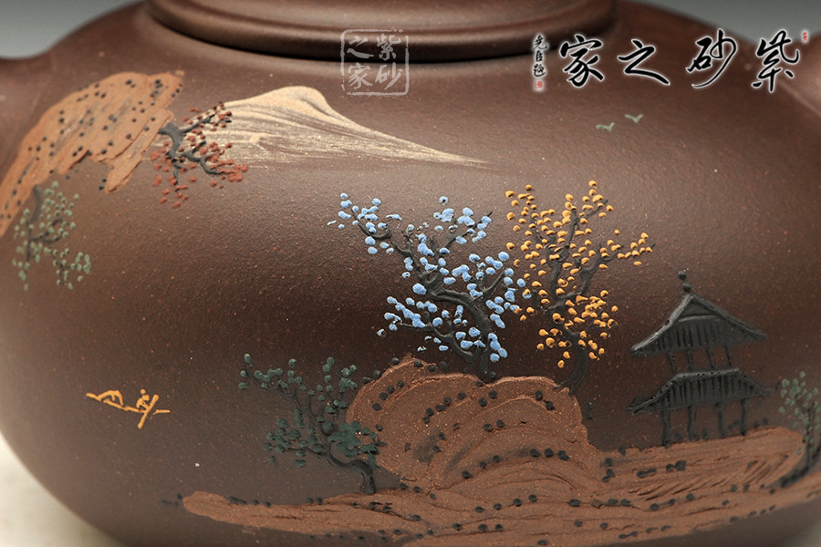 A面: 裝飾: 泥繪 裝飾者:萬俊峰 裝飾內(nèi)容: 亭臺(tái)樓閣,山巒迭起。