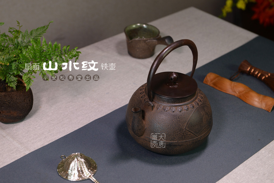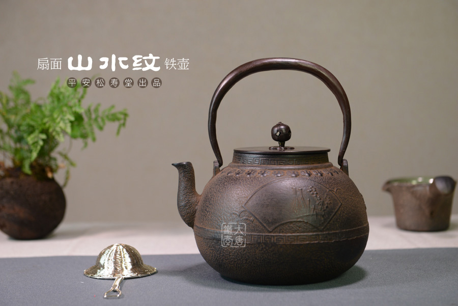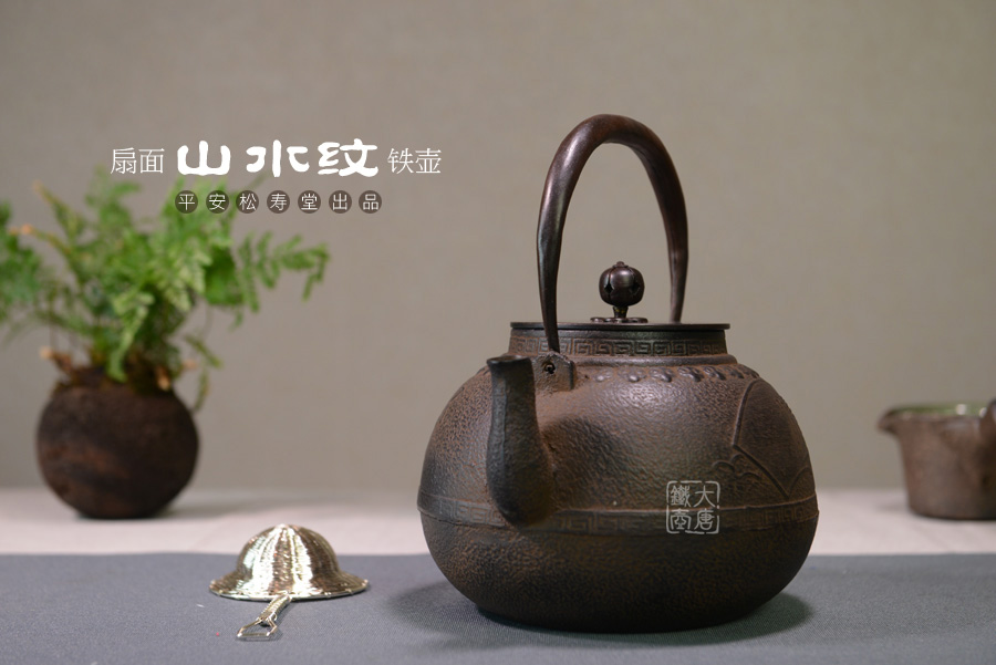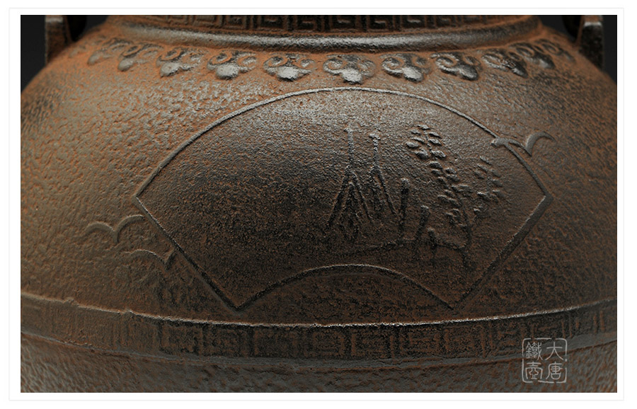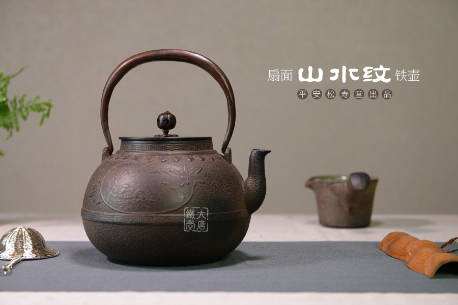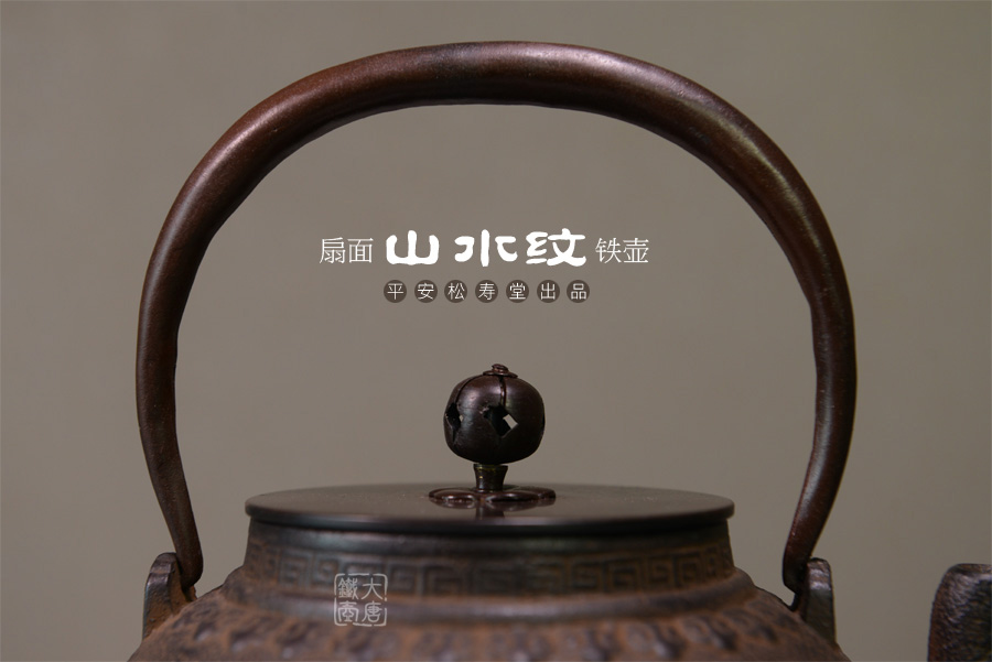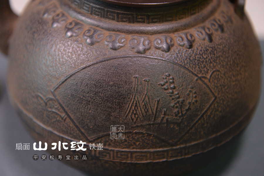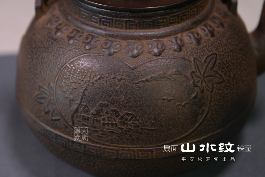 百年京都老堂號匠心手作,傳統(tǒng)手工砂鑄成型,雙面扇形開窗,經(jīng)典山水紋飾,壺底鳴金鑲嵌,整器渾厚古樸,雅致簡約。