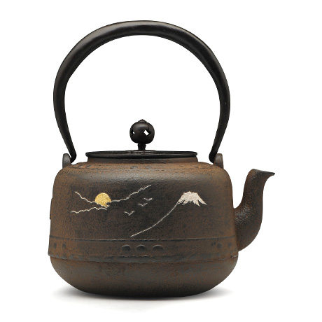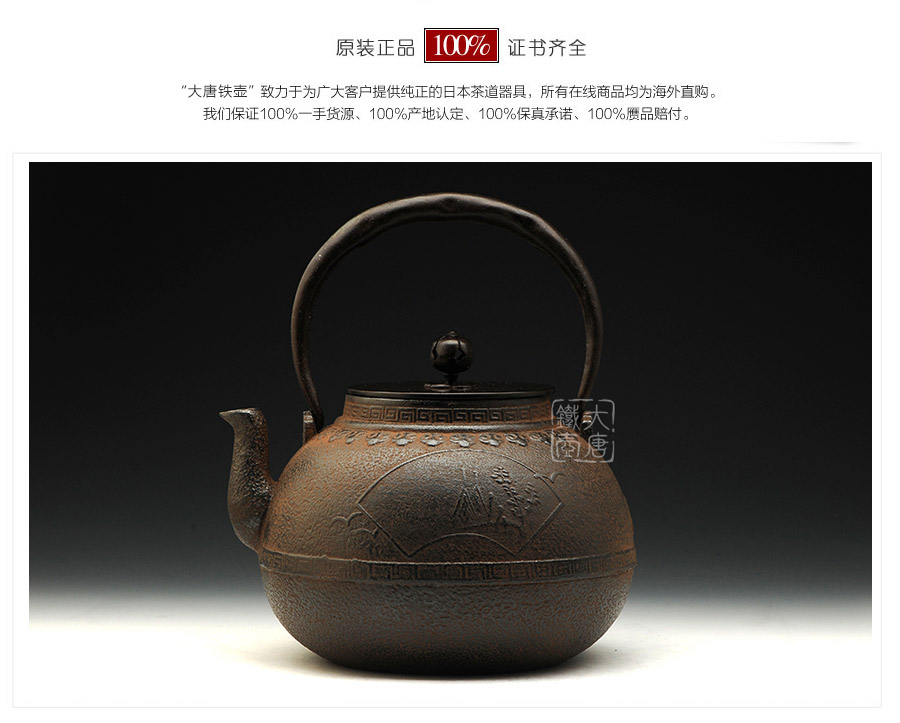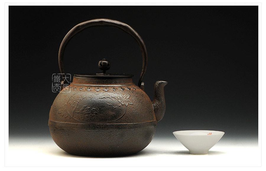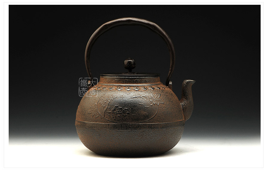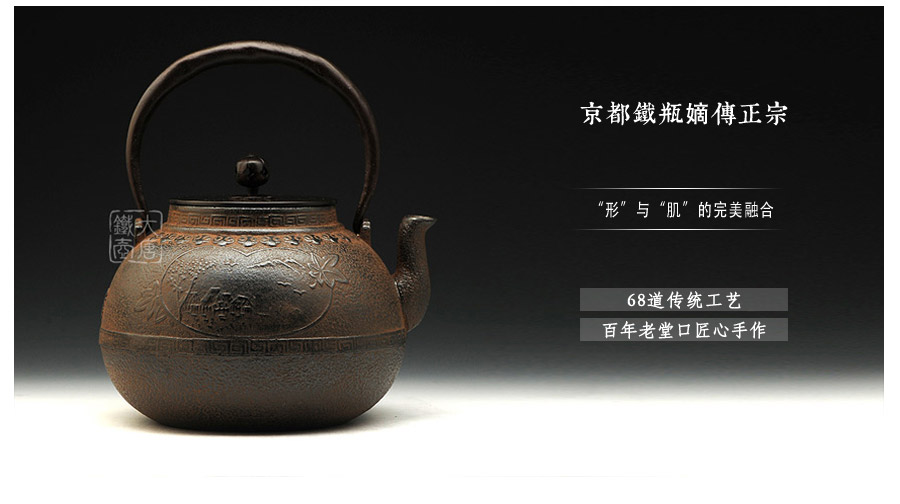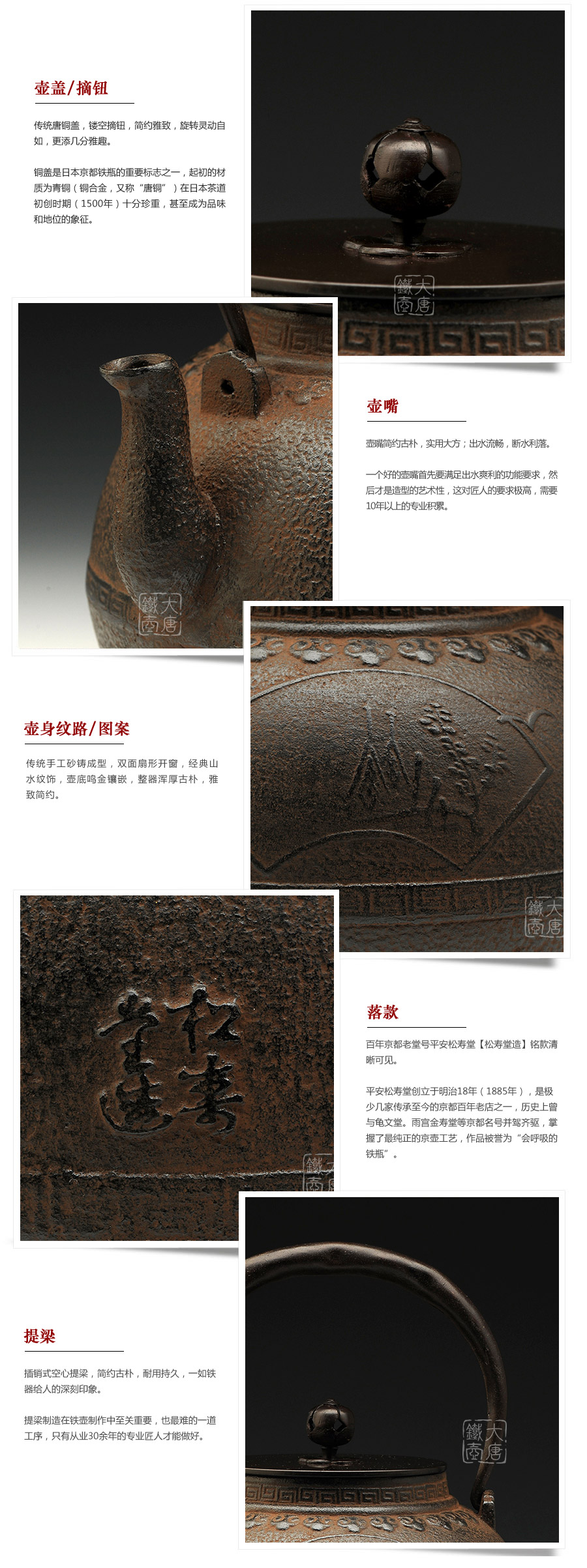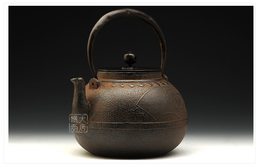 百年京都老堂號匠心手作,傳統(tǒng)手工砂鑄成型,雙面扇形開窗,經(jīng)典山水紋飾,壺底鳴金鑲嵌,整器渾厚古樸,雅致簡約。