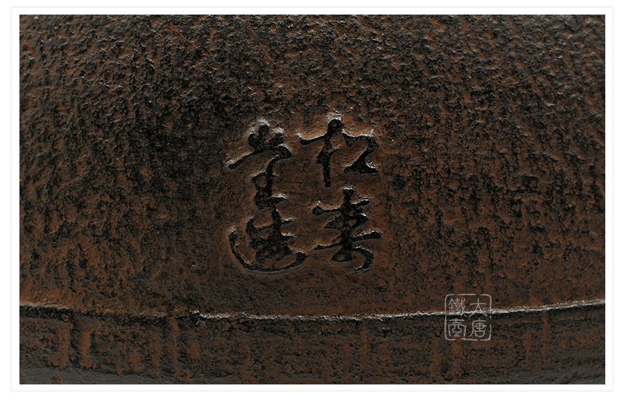 平安松壽堂(即松壽堂、西村松壽堂)是京都鐵瓶(也叫關(guān)西鐵壺)的典型代表,明治18年(1885年)由初代西村勝在京都寺町創(chuàng)建。平安松壽堂制作的鐵壺采用銅質(zhì)壺蓋,壺底內(nèi)側(cè)底部有板狀突起的“鳴金”,壺身或者提梁伴有金銀貴金屬鑲嵌的各式圖案或花紋,與京都寺町附近的龍文堂、雨宮金壽堂、云色堂等共同形成了獨特的京都鑲嵌特色。