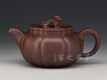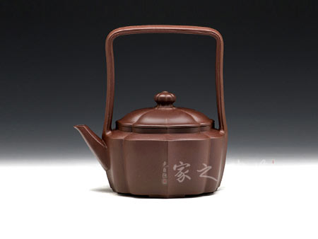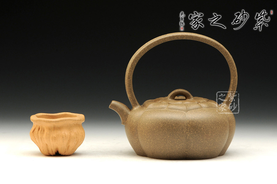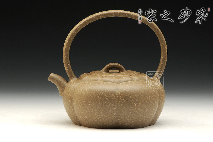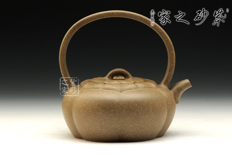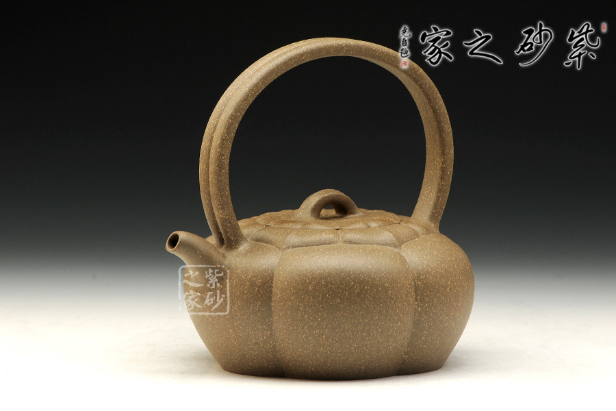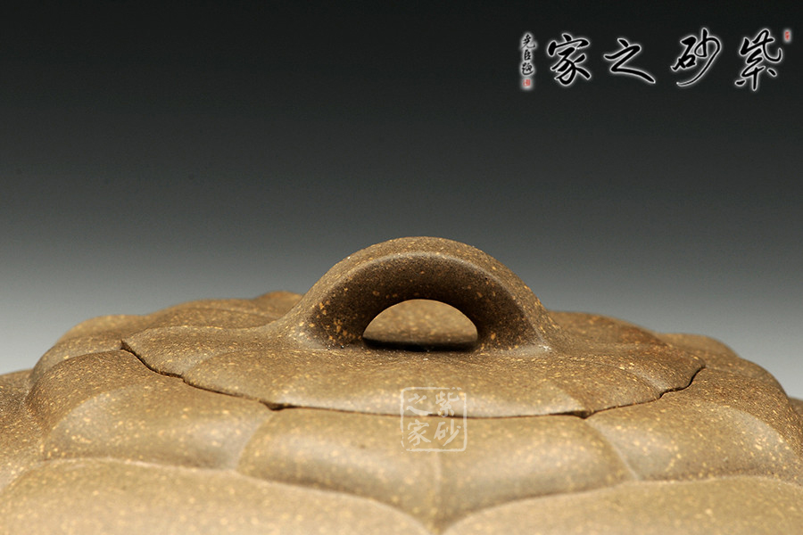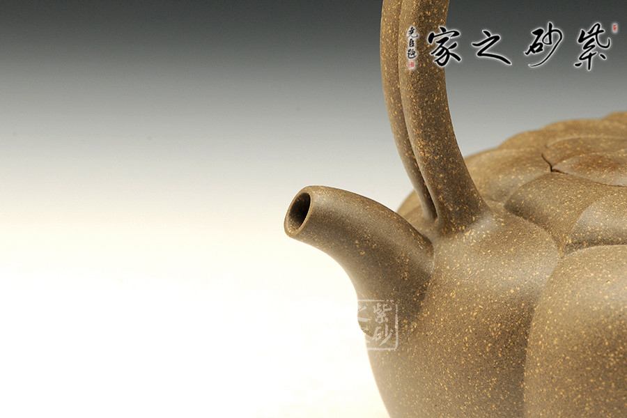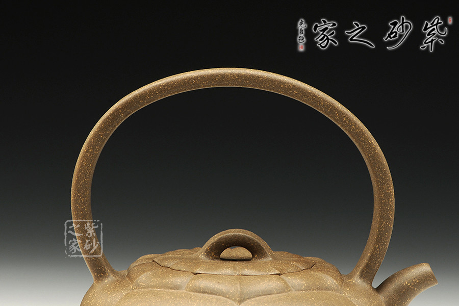該壺型仿錦葵花造型而來,選用稀有的青灰段泥為料,配比精細,泥料優(yōu)質(zhì),表現(xiàn)出清雅古樸的的色澤來。壺身筋紋清晰,鼓腹,鈕的筋紋與壺身渾然一體,銜接緊密,嚴絲合縫,氣密性極佳;以提梁為型,空間感更明顯,整個作品造型大方、穩(wěn)健,是實用收藏佳品。