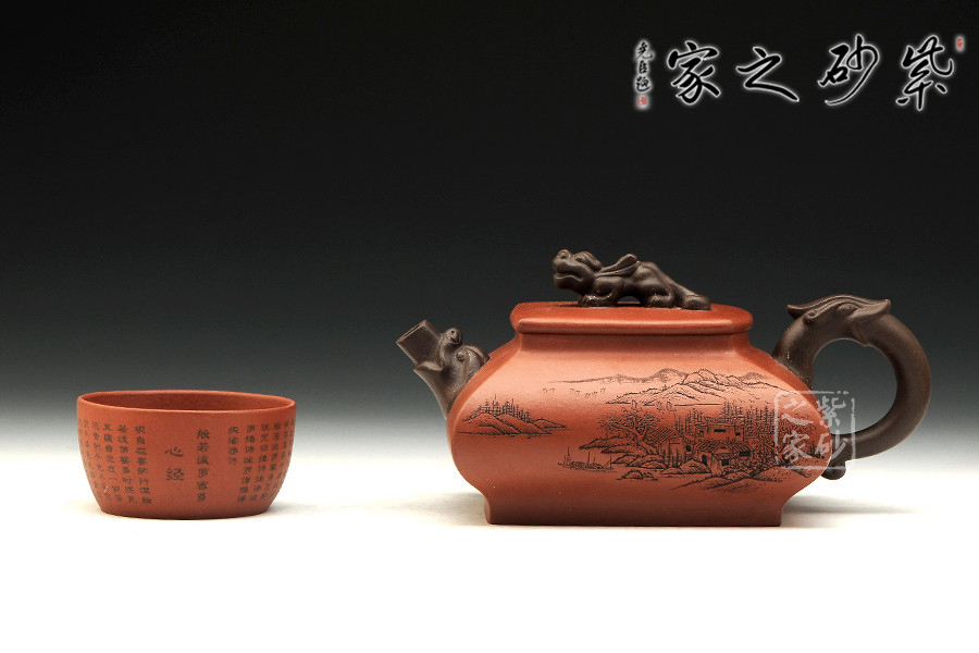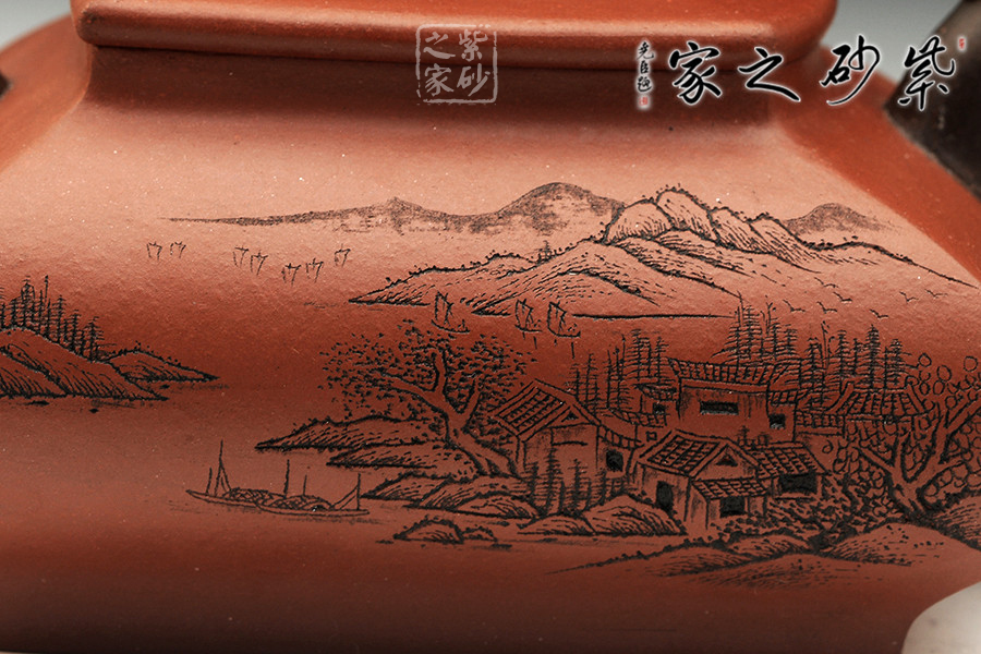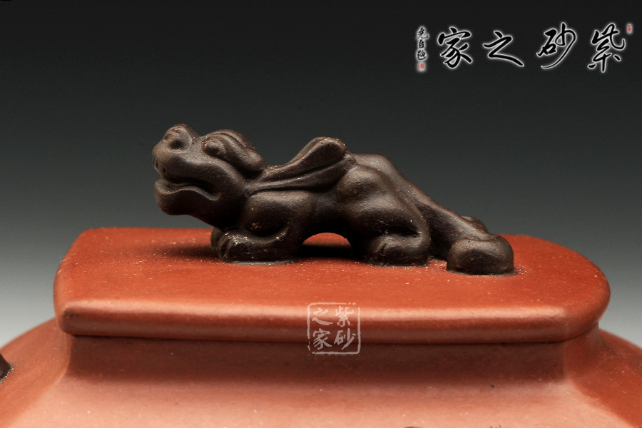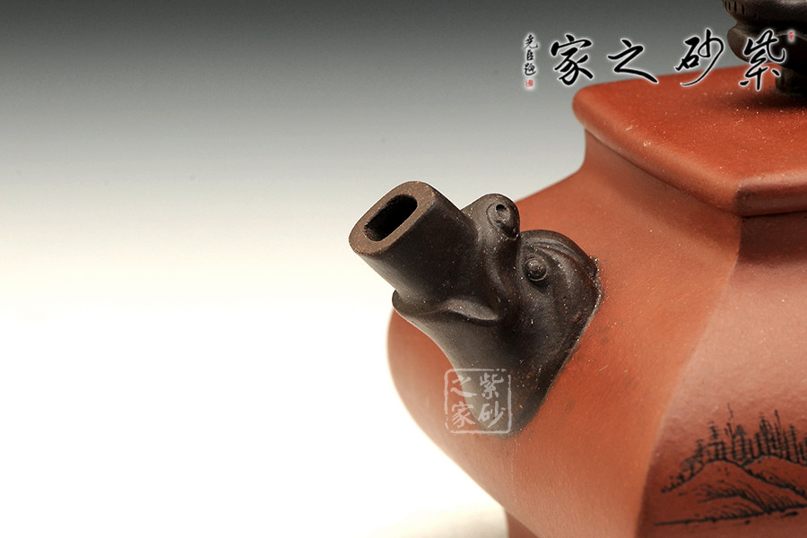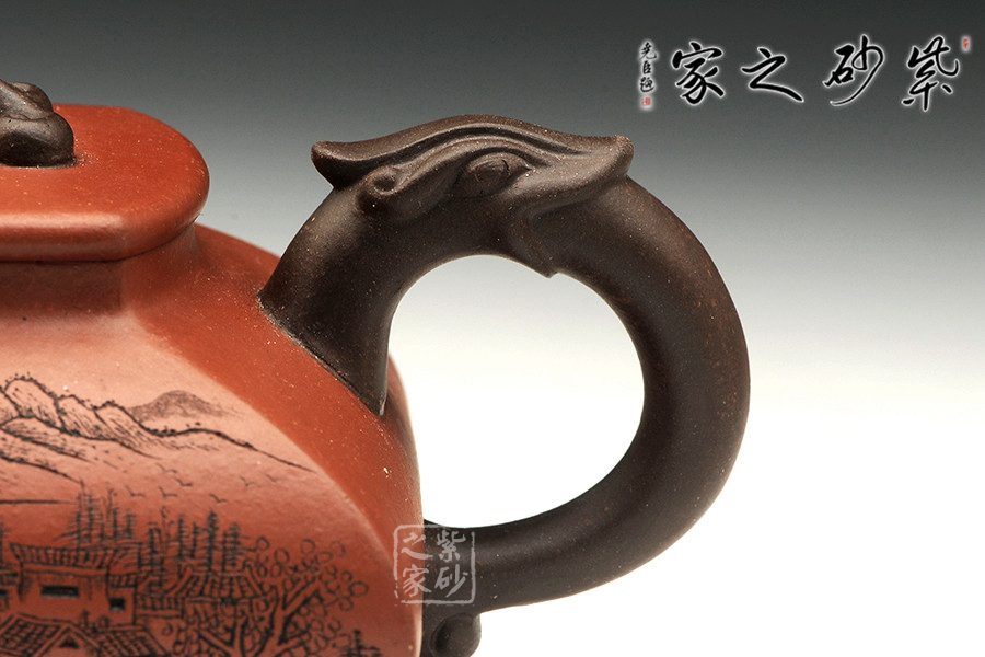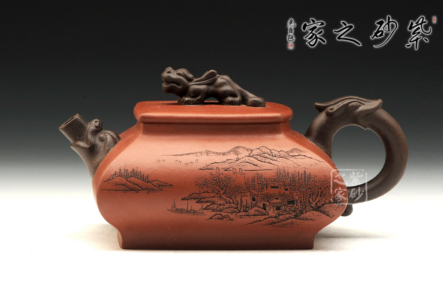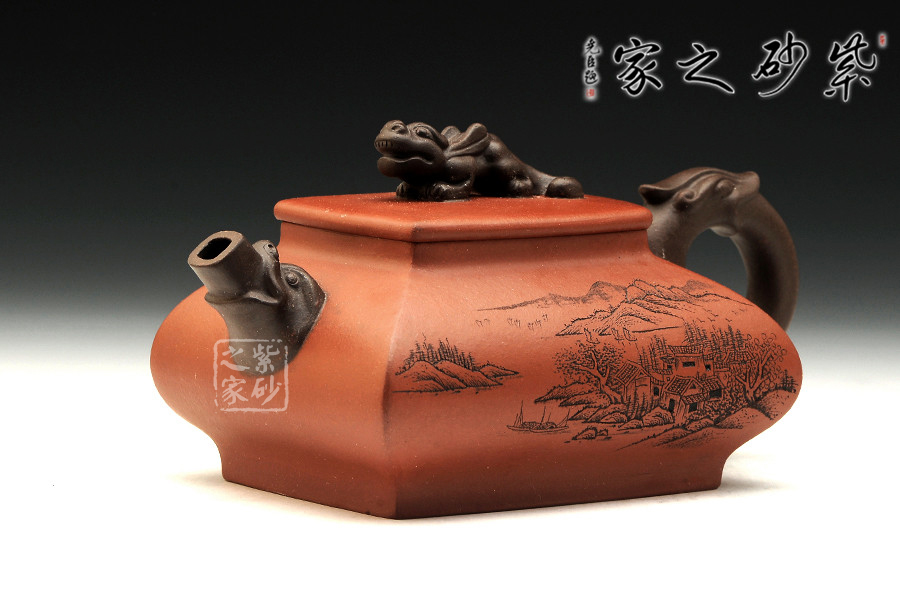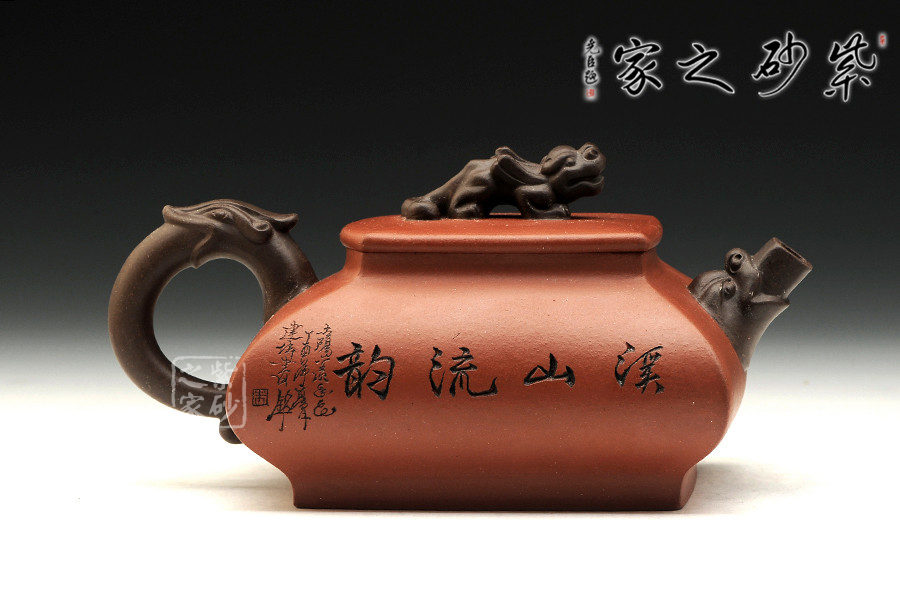 精品清水泥制成,壺色清呈,透亮溫潤,雙面刻繪刀法利落,情趣韻味高雅。此壺為方壺,壺身極扁,壺肚大向外突出,納福之相。細看此壺,可見壺身前后不一致,故意為之,正和方非一式,圓不一相。壺嘴、壺把、壺鈕為異色泥制作,龍形造型,刻畫生動形象,一吸一納間,威嚴自立,相互交映。是為佳作,值得收藏。