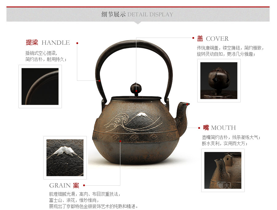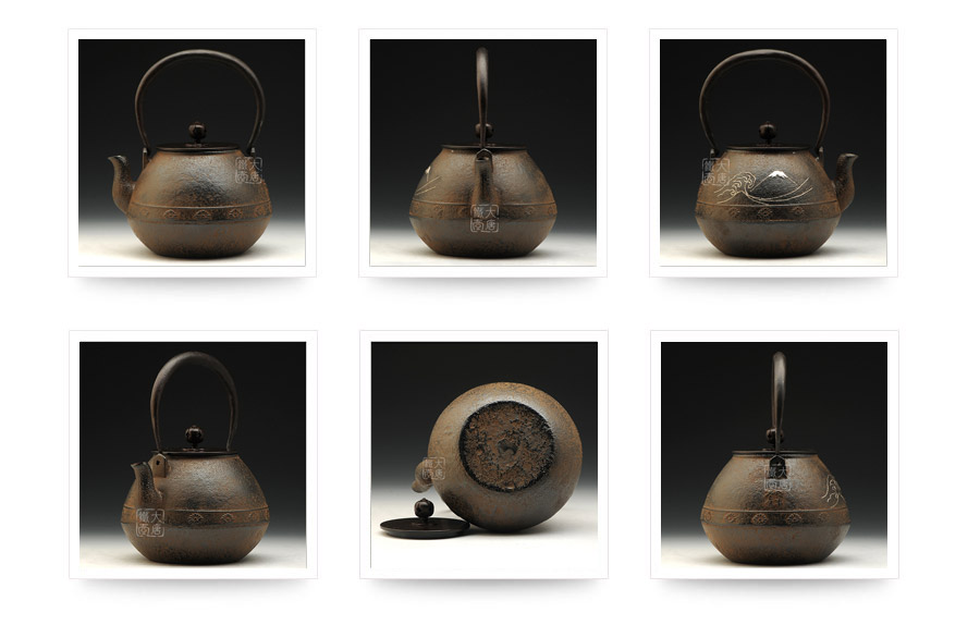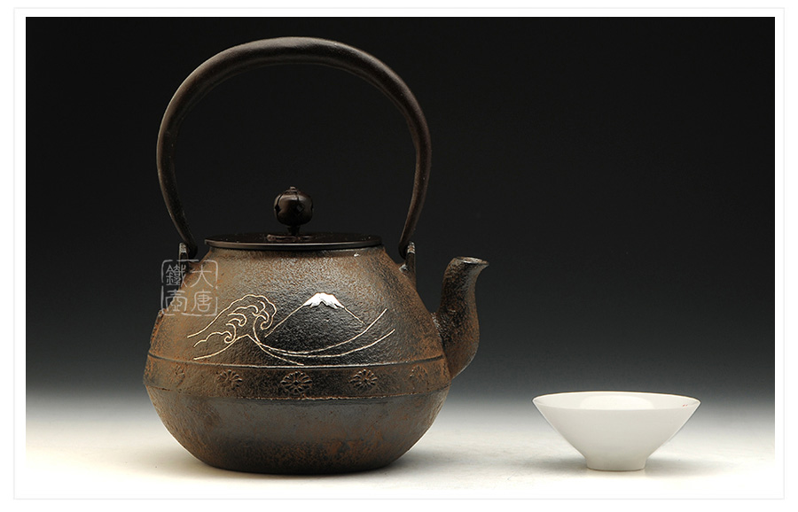 平安松壽堂匠心之作,此壺整體造型古樸典雅,做工精細(xì)美觀。通身的肌理細(xì)膩光滑,高肉、布目雙重技法,富士山、浪花,惟妙惟肖,展現(xiàn)出了京都特色金銀裝飾藝術(shù)的純熟和精湛。