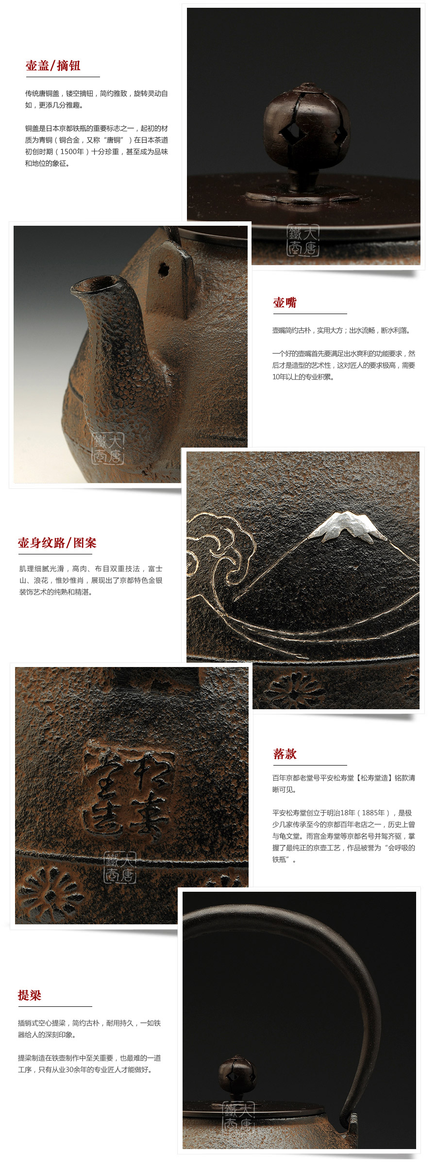 平安松壽堂(即松壽堂、西村松壽堂)是京都鐵瓶(也叫關(guān)西鐵壺)的典型代表,明治18年(1885年)由初代西村勝在京都寺町創(chuàng)建。平安松壽堂制作的鐵壺采用銅質(zhì)壺蓋,壺底內(nèi)側(cè)底部有板狀突起的“鳴金”,壺身或者提梁伴有金銀貴金屬鑲嵌的各式圖案或花紋,與京都寺町附近的龍文堂、雨宮金壽堂、云色堂等共同形成了獨(dú)特的京都鑲嵌特色。
