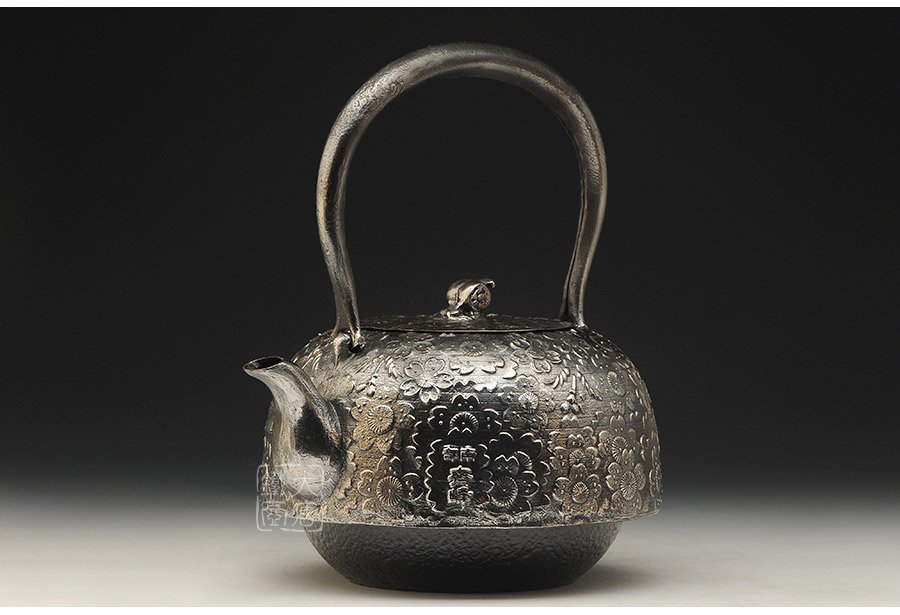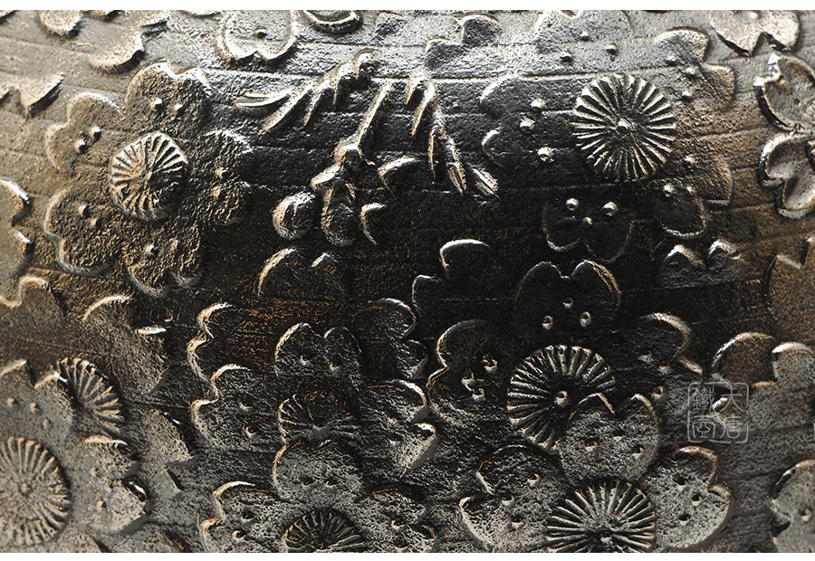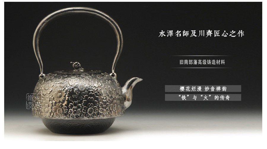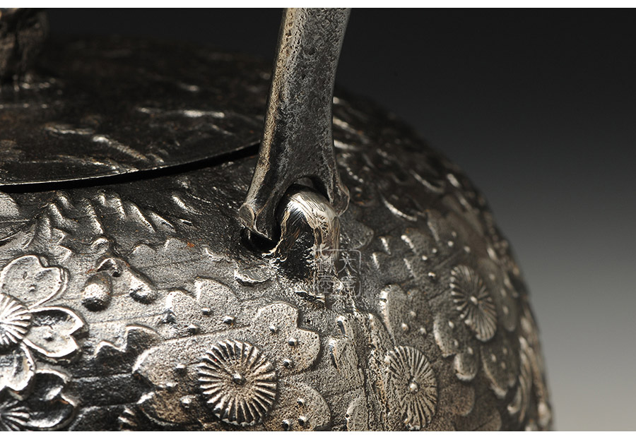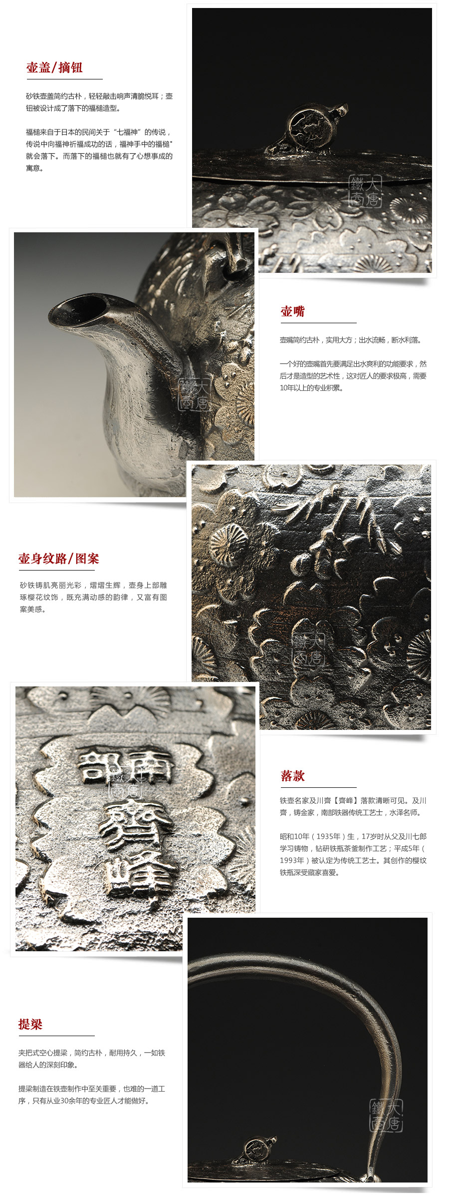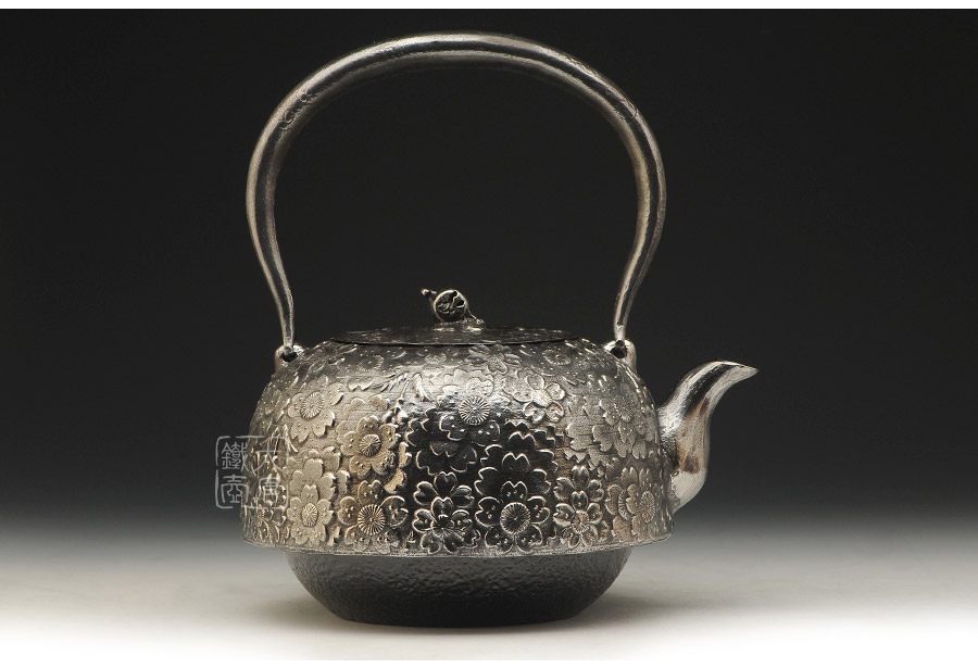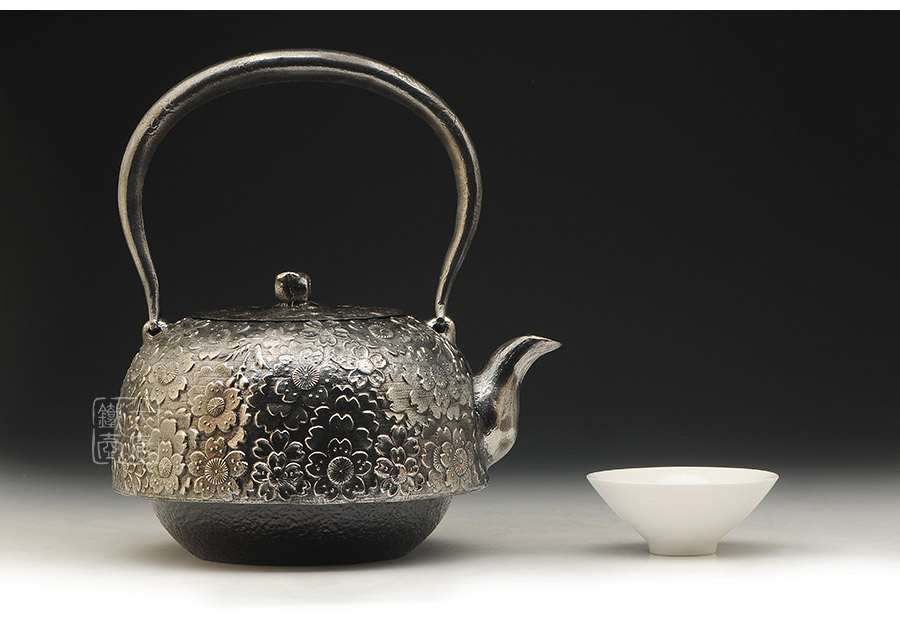 南部水澤名師及川齊作品,日本最高級砂鐵原料,砂鐵鑄肌亮麗光彩,熠熠生輝,壺身上部雕琢櫻花紋飾,既充滿動感的韻律,又富有圖案美感。