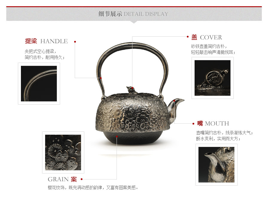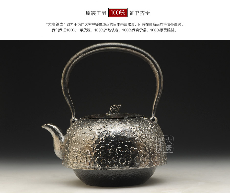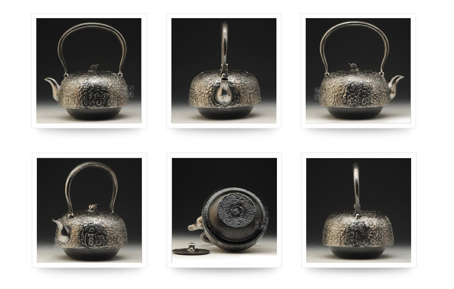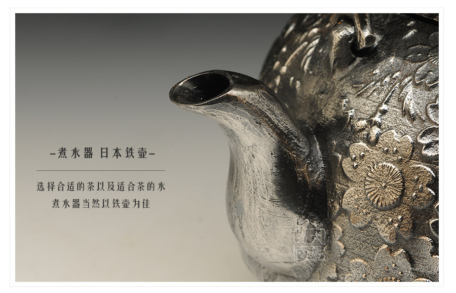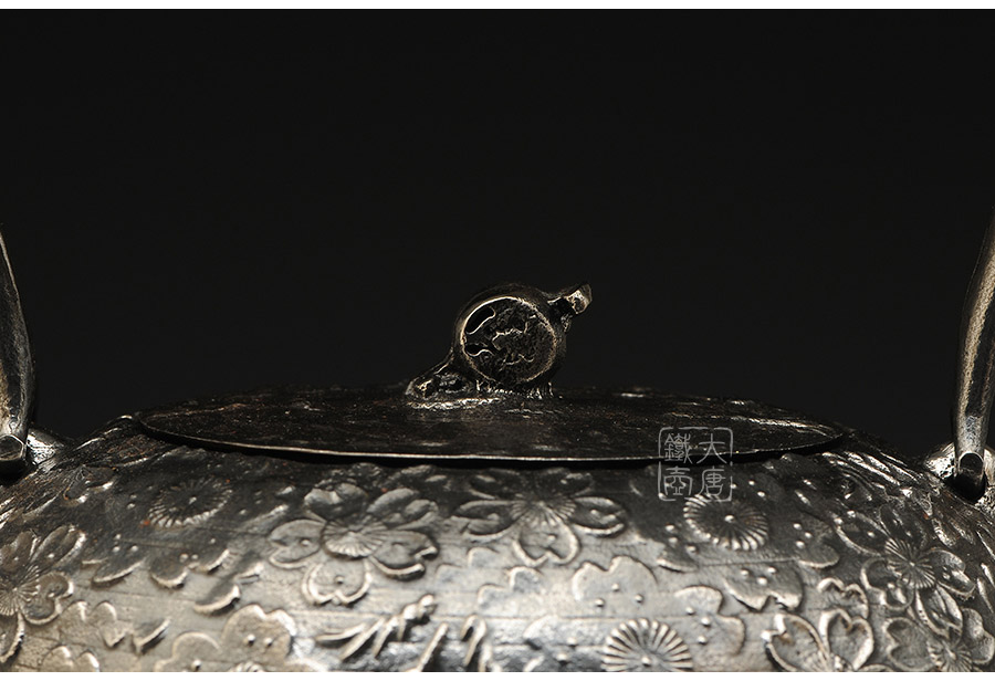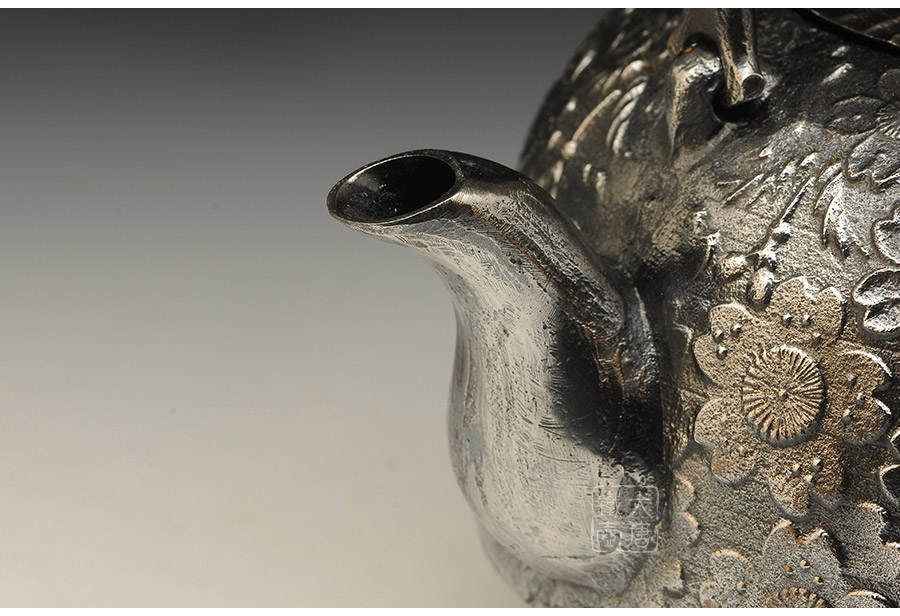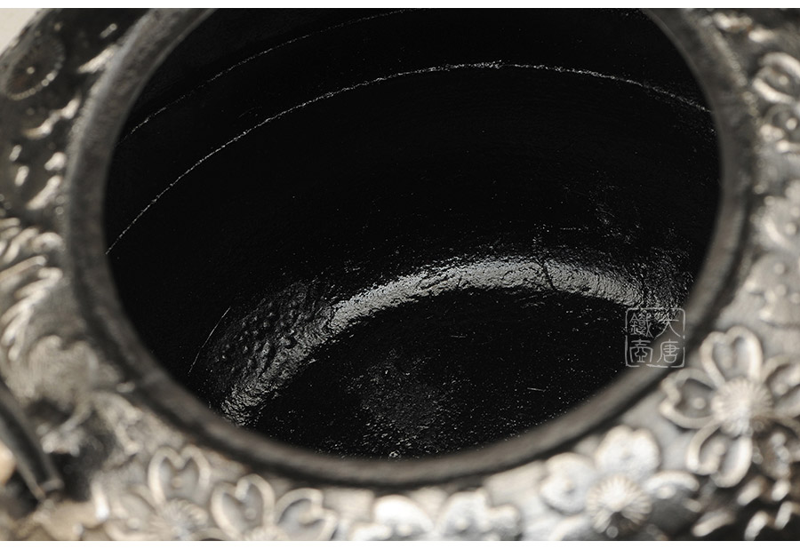 南部水澤名師及川齊作品,日本最高級砂鐵原料,砂鐵鑄肌亮麗光彩,熠熠生輝,壺身上部雕琢櫻花紋飾,既充滿動感的韻律,又富有圖案美感。