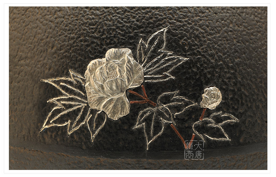 松壽堂 撫肩形牡丹銀鑲嵌鐵壺 [ 編號:53821 ]