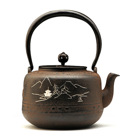 平安松壽堂(即松壽堂、西村松壽堂)是京都鐵瓶(也叫關(guān)西鐵壺)的典型代表,明治18年(1885年)由初代西村勝在京都寺町創(chuàng)建。平安松壽堂制作的鐵壺采用銅質(zhì)壺蓋,壺底內(nèi)側(cè)底部有板狀突起的“鳴金”,壺身或者提梁伴有金銀貴金屬鑲嵌的各式圖案或花紋,與京都寺町附近的龍文堂、雨宮金壽堂、云色堂等共同形成了獨特的京都鑲嵌特色。