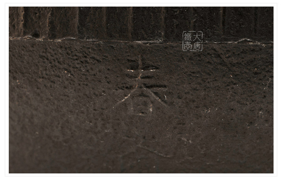 鐵瓶內(nèi)底被稱之為“鳴金”的響片使得水燒開之后的煮沸聲更為悅耳。鐵瓶下側(cè)的“春齋”刻印以及共箱蓋子的題字都是作者親筆所寫。此為檢驗春齋鐵瓶真?zhèn)蔚臉酥局弧?/p>