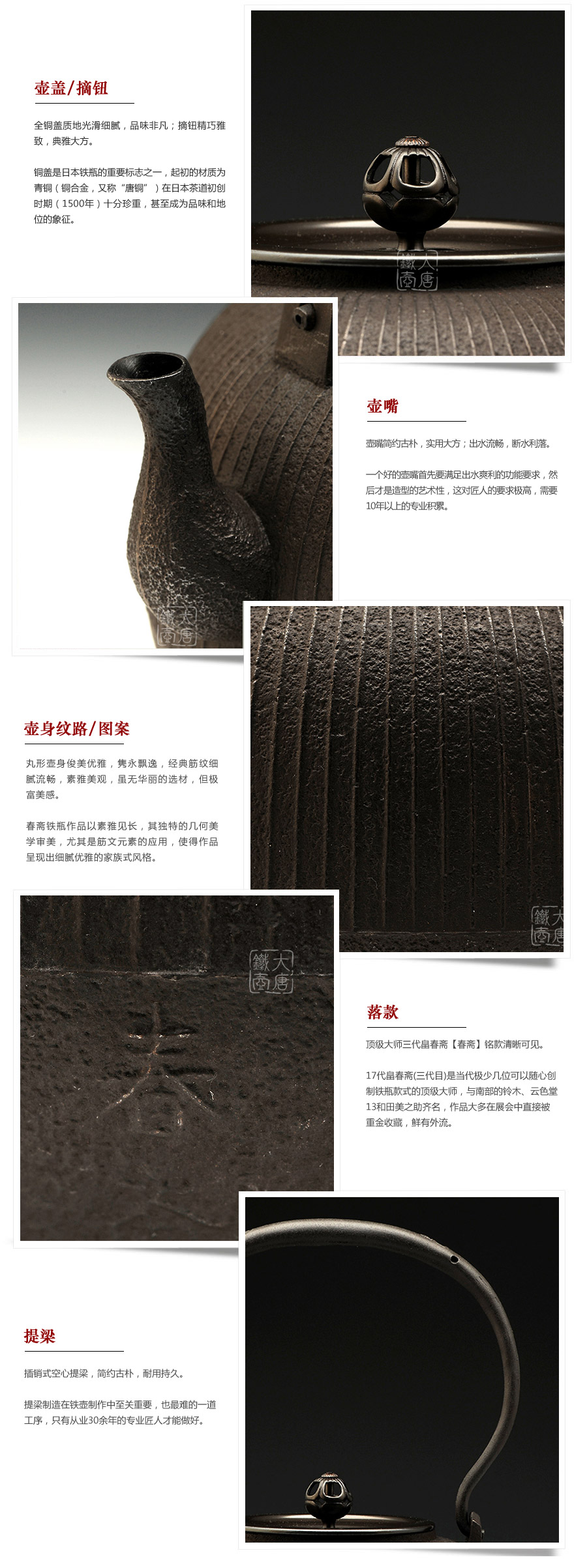 春齋的鐵瓶使用的都是1模1具的方法制作的純手工作品。與一般的量產(chǎn)品不同,通常制作這樣一個純手工作品,需要花費數(shù)月時間才能完成。因此在某種程度上可以說春齋的鐵瓶是兼具實用性的藝術(shù)品。