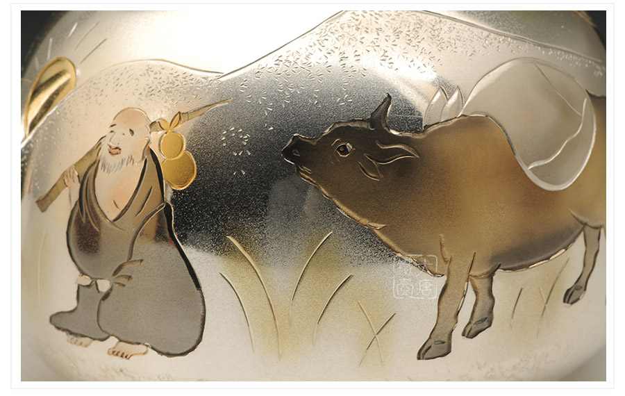 大淵銀器的作品以祥瑞擺件,餐具,佛具,金屬畫為多,主要題材有金龍,金雞,貓頭鷹,七福神,梅蘭松竹,鴛鴦,神龜,仙鶴,布袋和尚,天皇,金太郎等等。輝煌華麗,精工細(xì)作,展示了純手工超越時(shí)代的閃耀風(fēng)格。