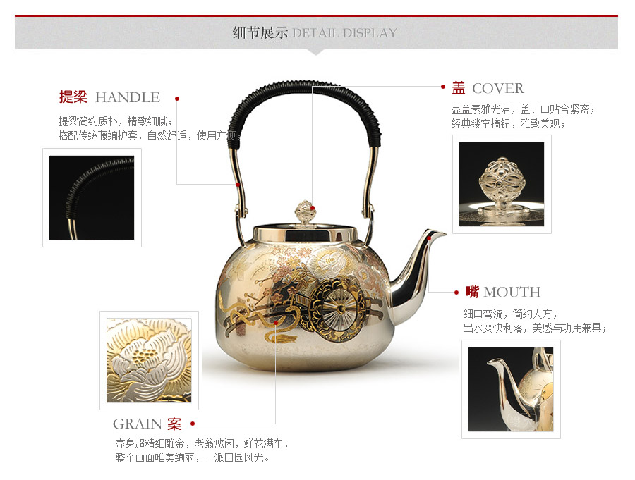 日本第一銀器品牌大淵銀器匠心之作,一鏨一刻盡彰傳統(tǒng)手工藝之美;壺身超精細(xì)雕金,老翁悠閑,鮮花滿車,整個(gè)畫面唯美絢麗,一派田園風(fēng)光。