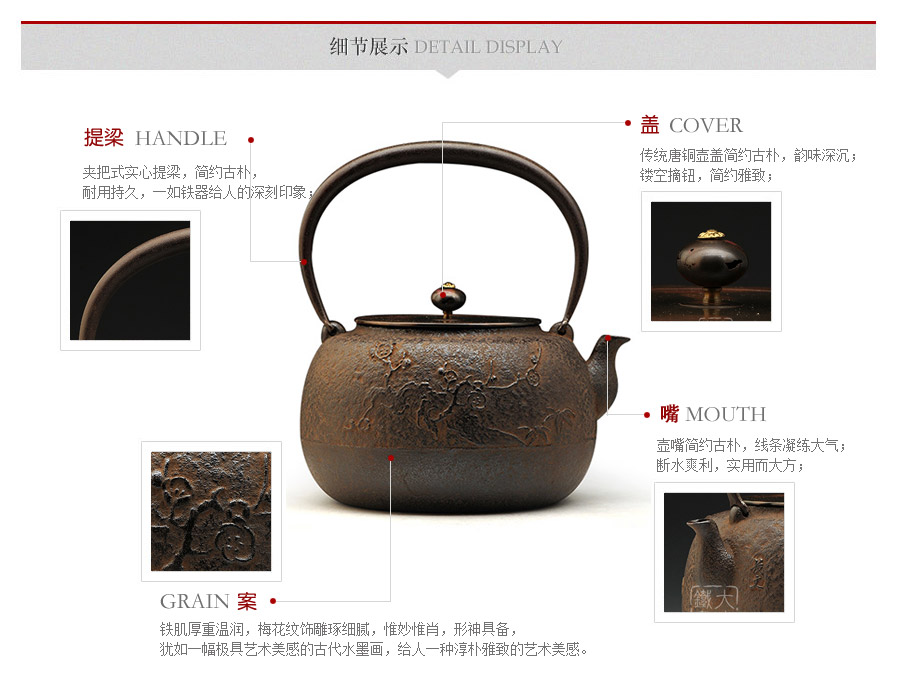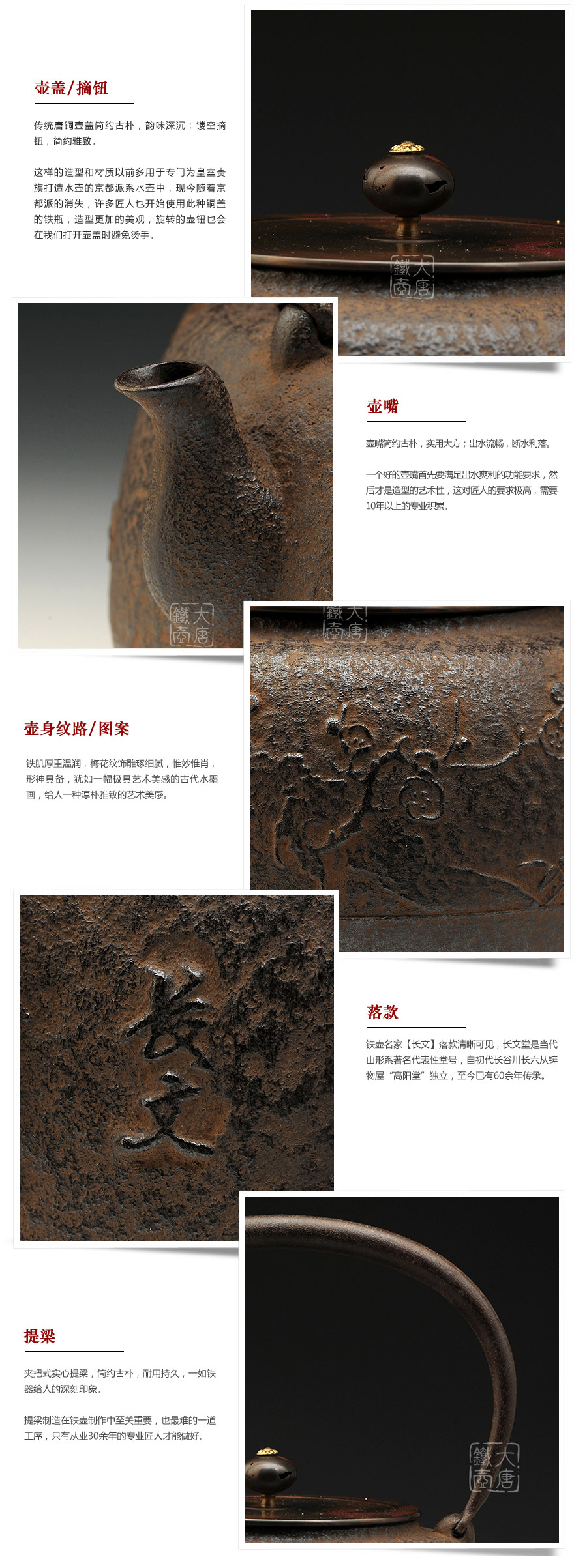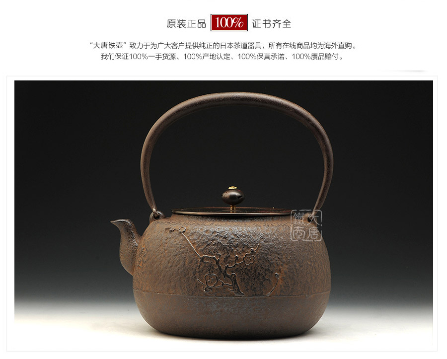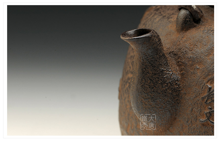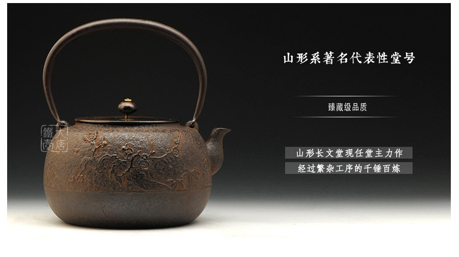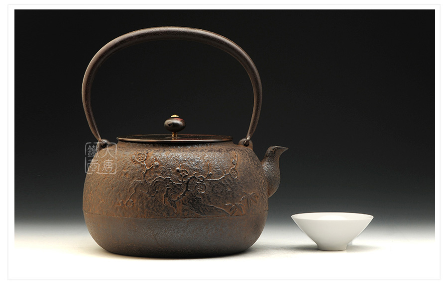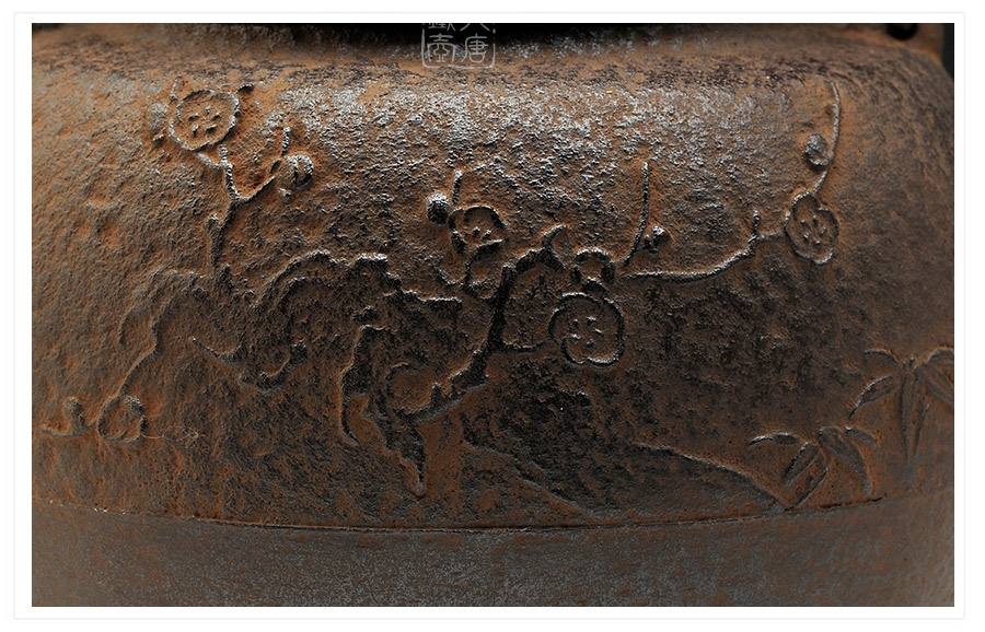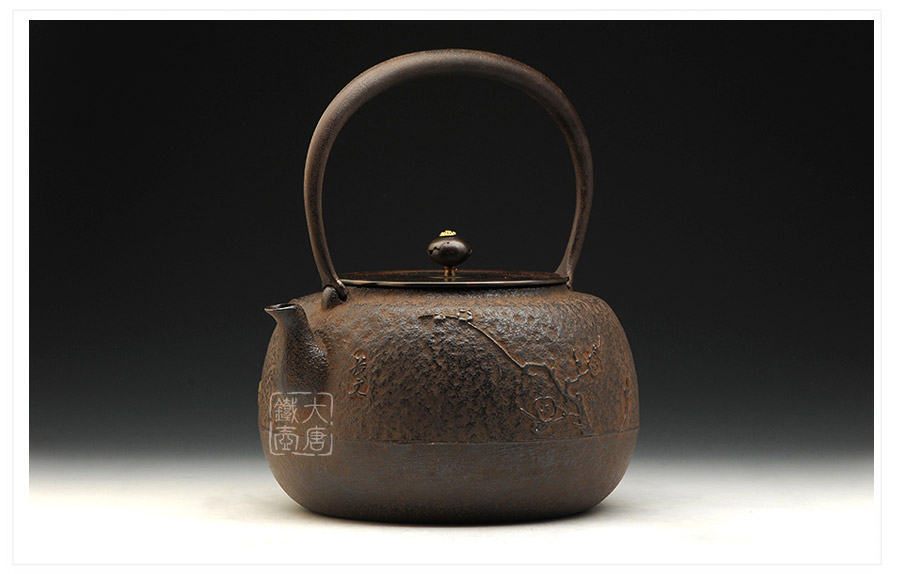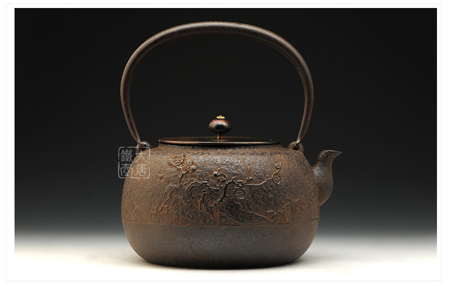 山形長(zhǎng)文堂現(xiàn)任堂主,長(zhǎng)谷川光昭作品,燒型制法,一模一具,壺身造型沉穩(wěn)古樸,鐵肌厚重溫潤(rùn),梅花紋飾雕琢細(xì)膩,惟妙惟肖,形神具備,猶如一幅極具藝術(shù)美感的古代水墨畫(huà),給人一種淳樸雅致的藝術(shù)美感。