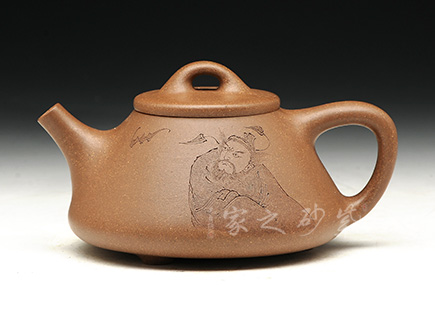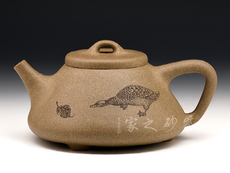 存世量較少的降坡泥為料,泥料做一少,特別珍貴;作品自制自銘,古樸內(nèi)斂,實(shí)用性佳。其形與扁西施近似,泥色內(nèi)斂,養(yǎng)用適手。整個(gè)壺身圓潤(rùn)飽滿,玉雪可愛,壺身略扁更添敦厚古樸精神。壺嘴彎曲向上,線條流暢而協(xié)調(diào),嵌蓋圓鈕,氣密性好而珠圓玉潤(rùn)。此壺,一手把玩品賞,最得天趣也。
