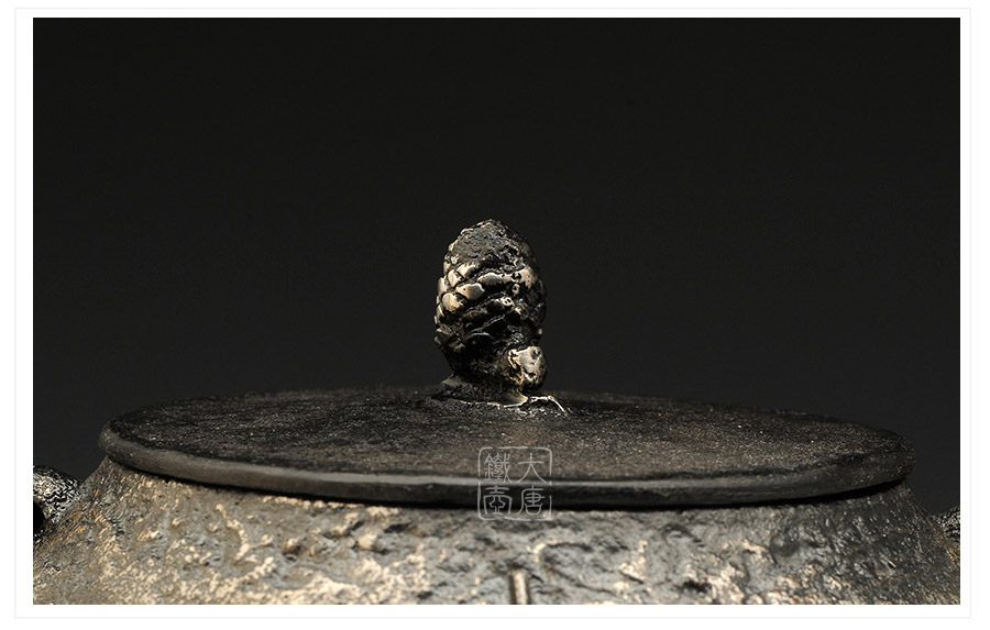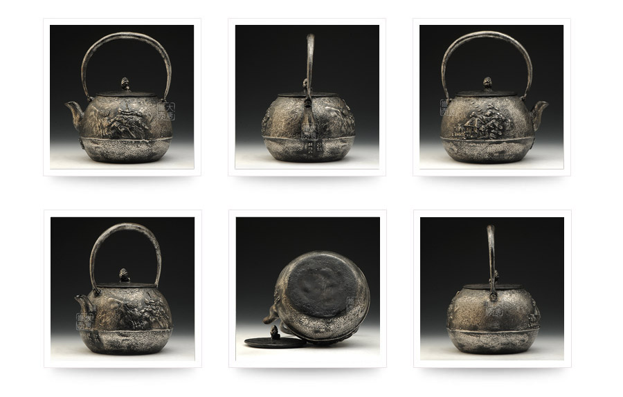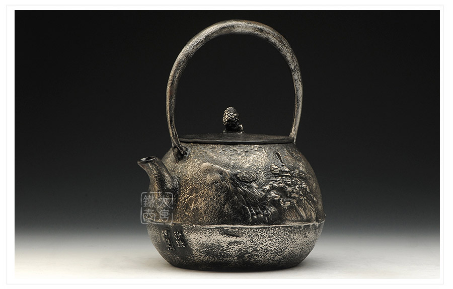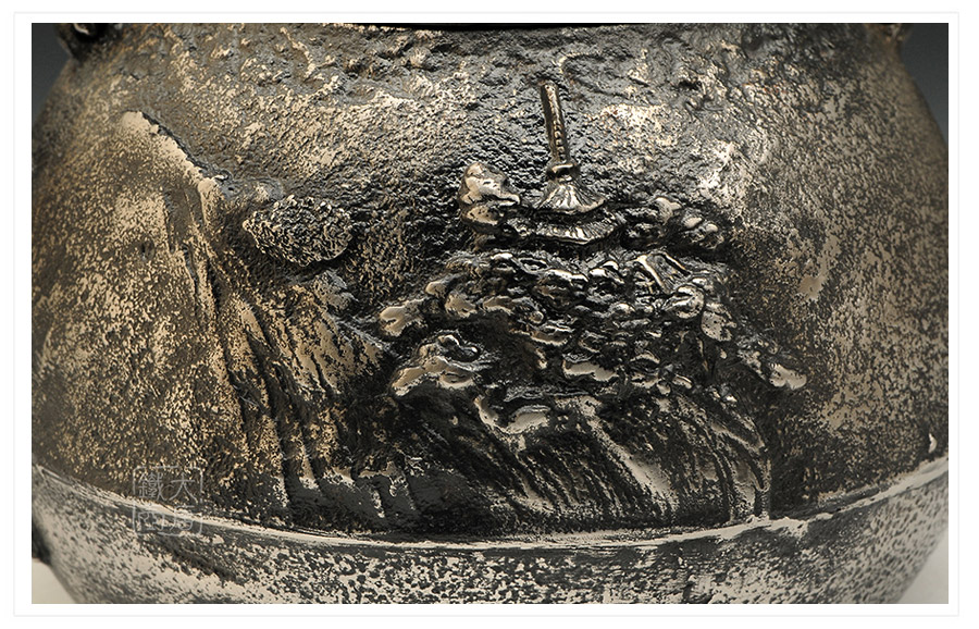 荒井工房的鐵瓶除了在鑄造工藝上有嚴格的規(guī)范和體系,在鐵瓶裝飾技術(shù)上也頗有建樹。除了傳統(tǒng)的印刻技術(shù)外,荒井工房還掌握了非常出色的金銀鑲嵌技藝,尤其以大片的鏨刻銀片最為出眾,這在山形當?shù)靥每谥歇殬湟粠谩?/p>