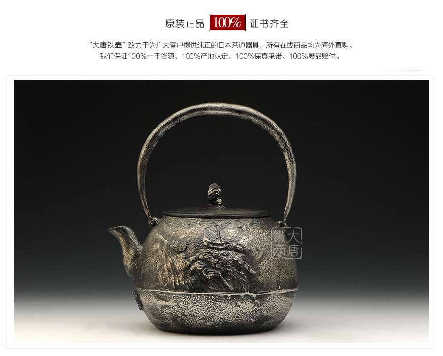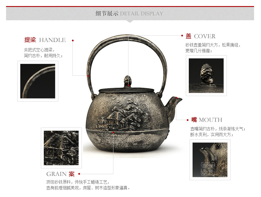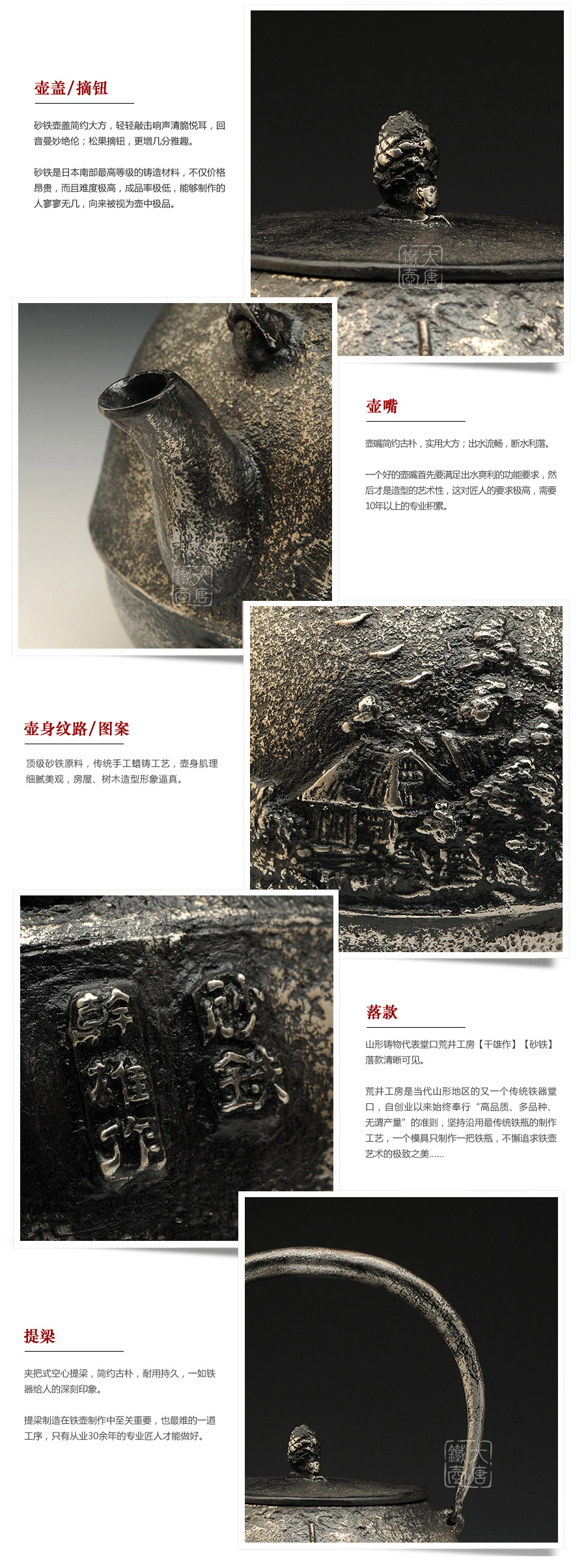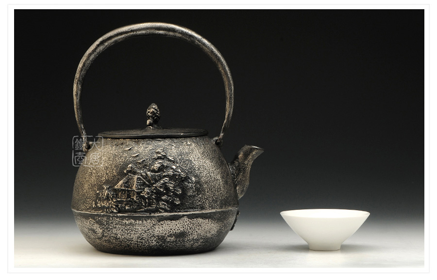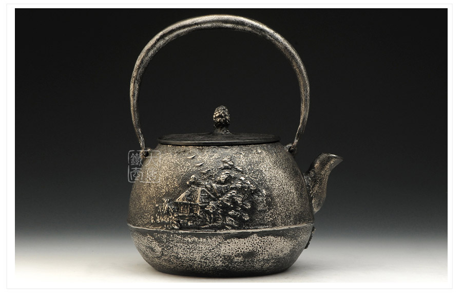 日本山形鑄物名堂荒井工房匠心之作,頂級砂鐵原料,傳統(tǒng)手工蠟鑄工藝,壺身肌理細膩美觀,房屋、樹木造型形象逼真。