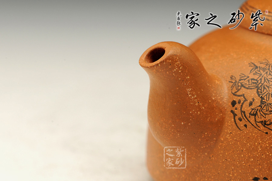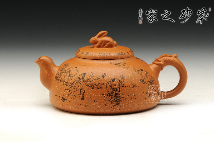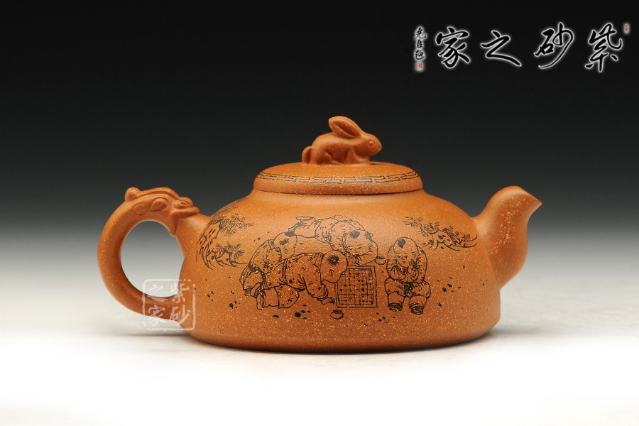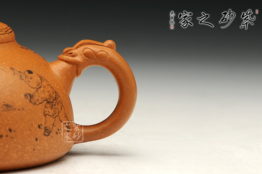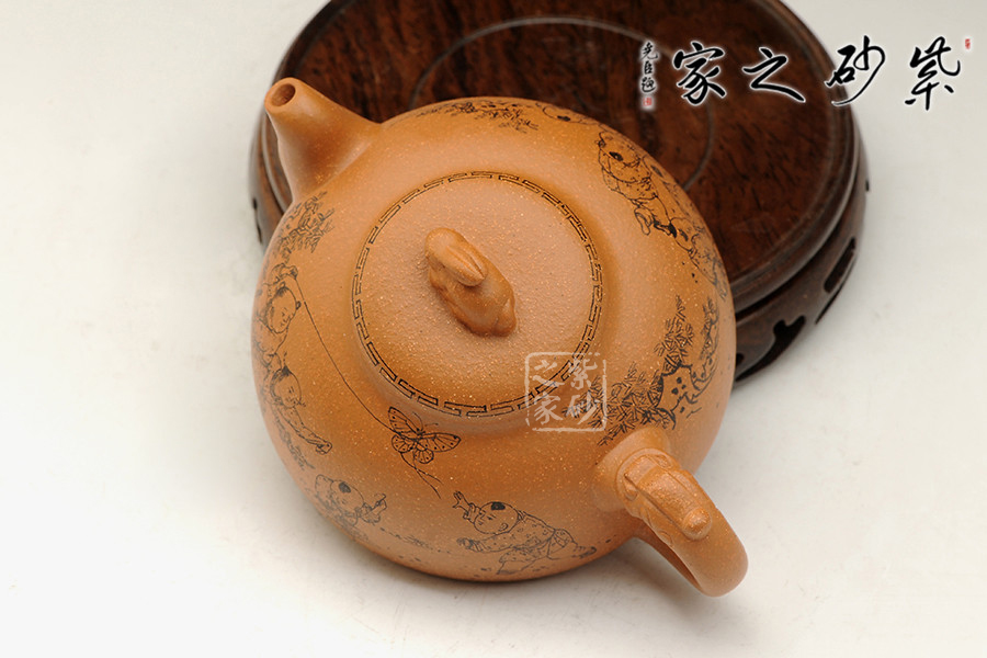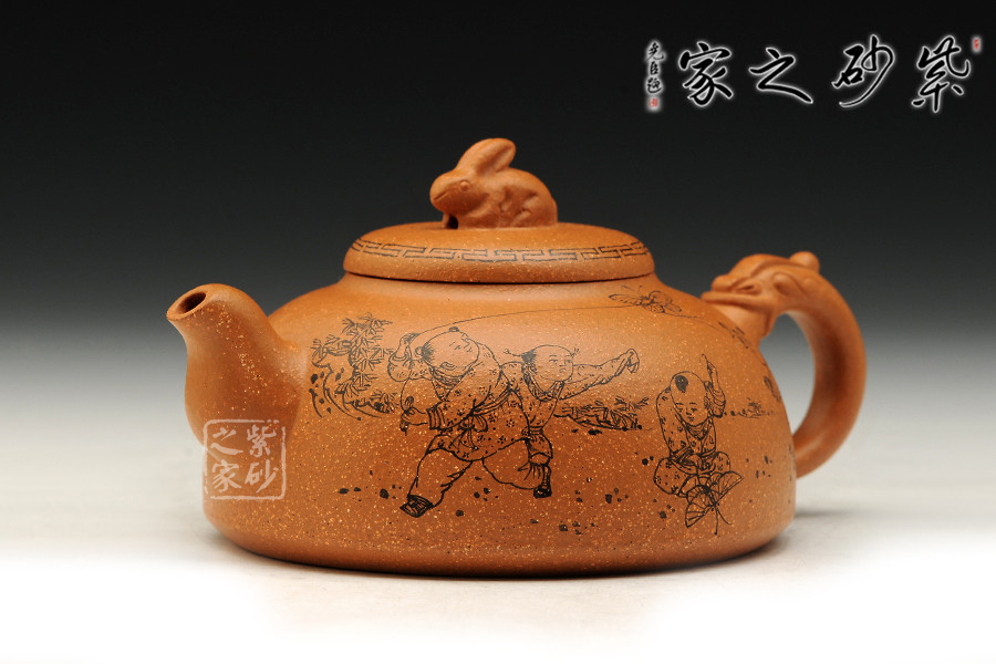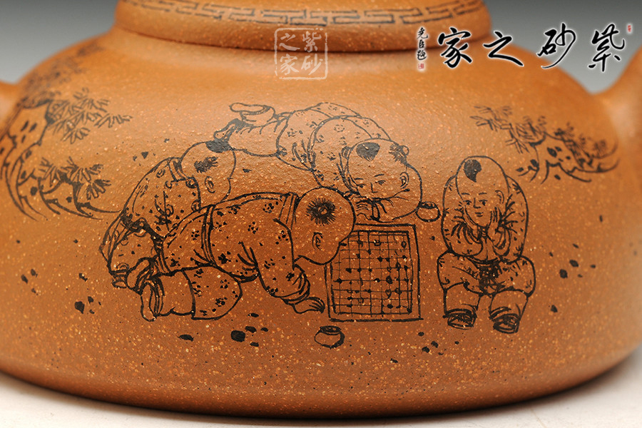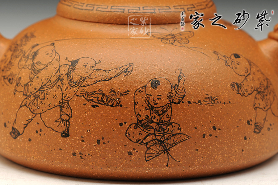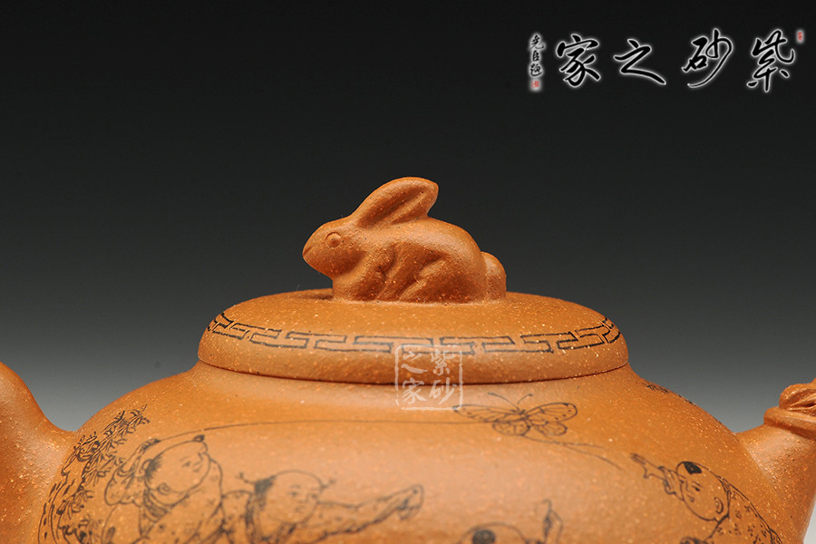 該作品泥料選擇與主題搭配完美,選用存量較為稀少的黃金段泥為料,色澤金黃富貴,砂粒豐富,同時(shí)也詮釋了“紫玉金砂”的概念。壺身飽滿呈半月形,形制端莊。截蓋密實(shí),鈕以一只精靈可愛(ài)兔子設(shè)計(jì),突顯主題,又增加樂(lè)趣;壺把以龍形設(shè)計(jì);彎秀嘴自由生展,身姿優(yōu)雅。身、蓋、鈕比例恰當(dāng),整體簡(jiǎn)練大方,端莊秀麗,文雅古樸。通身篆刻童趣圖,表現(xiàn)出當(dāng)下平安和諧社會(huì)之風(fēng)。