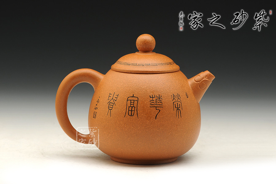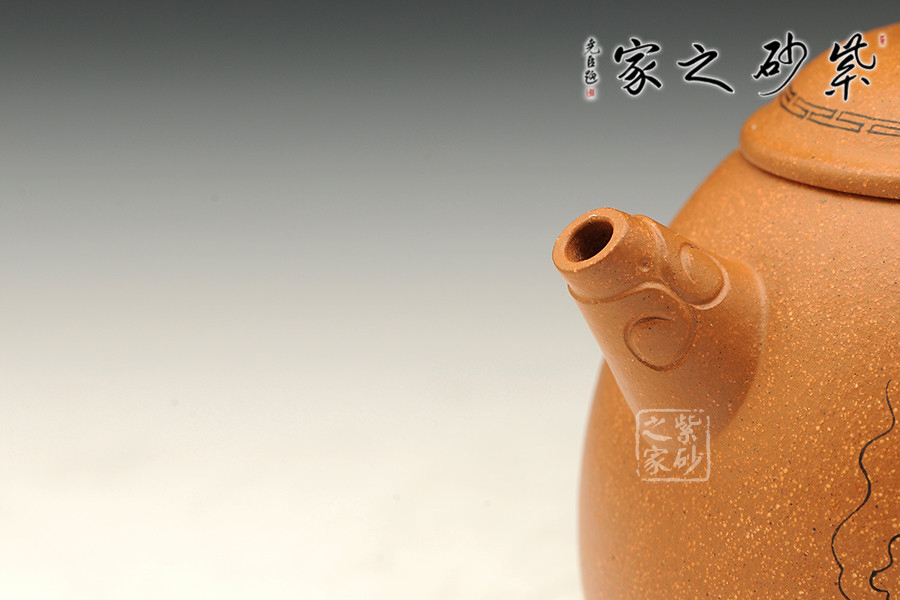 此壺式度朗朗,形貌偉岸。壺身圓渾飽滿,錐形直流飾以抽象龍首,執(zhí)把厚實,長弧下曲,形若耳狀,珠形壺鈕精秀小巧。小小的器型秀巧中見霸氣,穩(wěn)重中不失挺拔,流暢處尤帶含蓄,胎土、做工、火候皆屬上乘,為龍蛋壺式的典范造型。