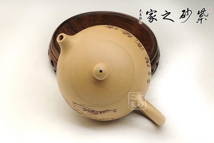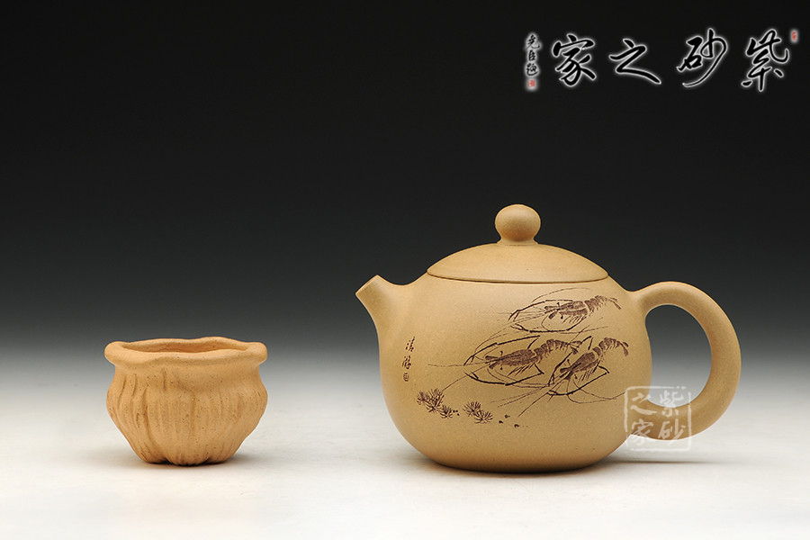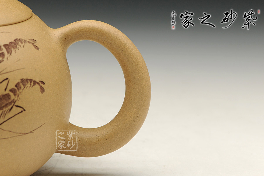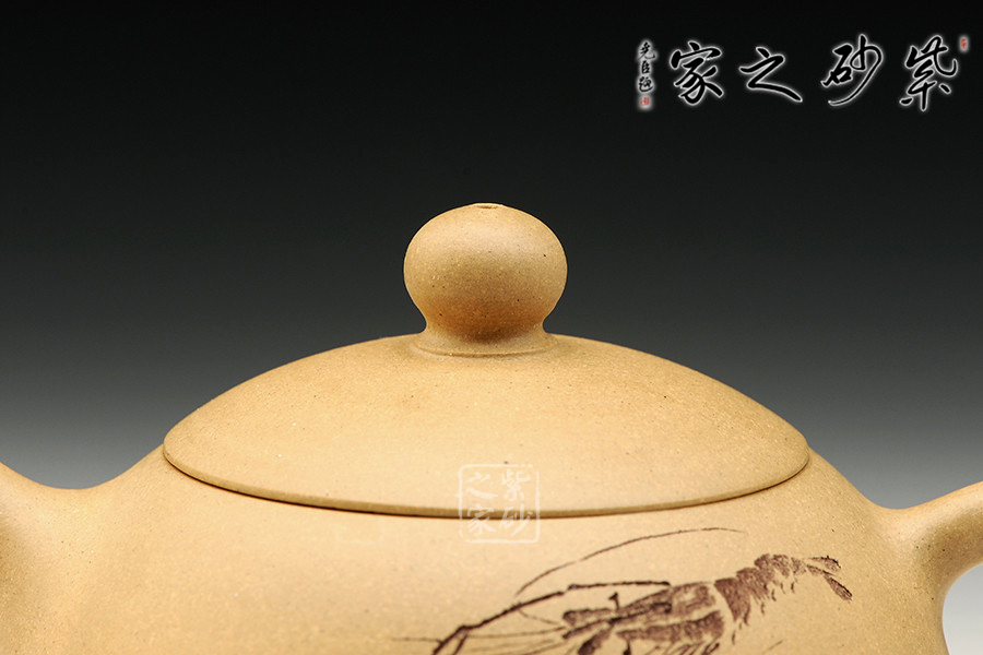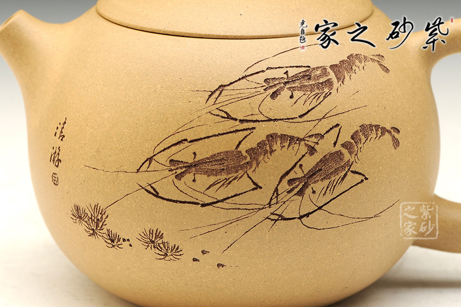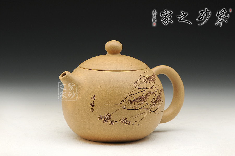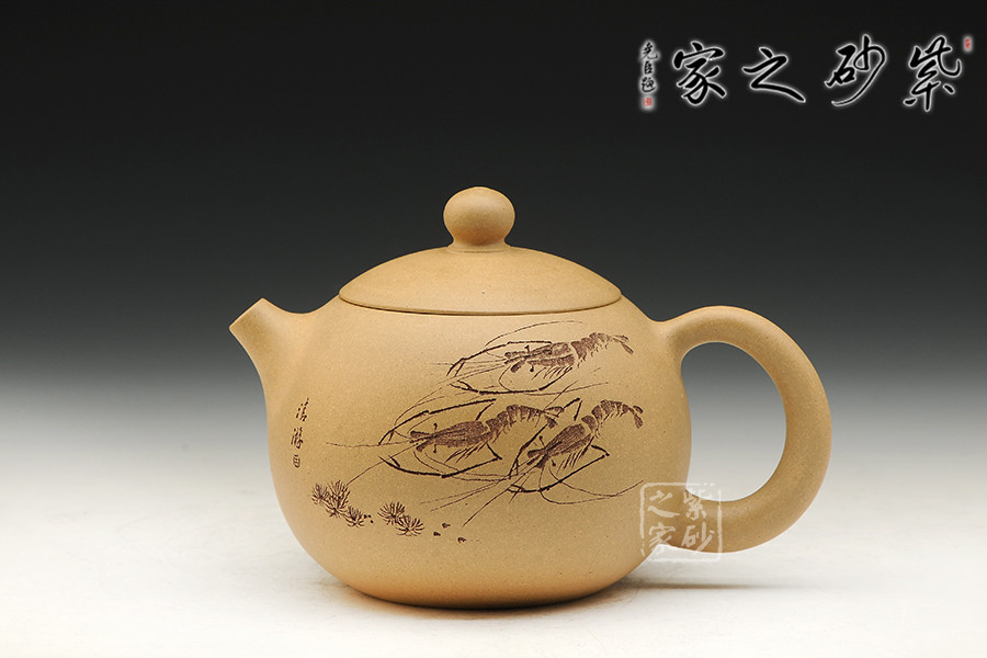 此作如西施一樣的美麗動人,亦如西施壺一樣嬌小可人,其憨厚,小巧,精致,清新的造型總是容易打動每一個人的心。該壺色澤溫婉不張揚,婉如一個秀色的少女溫柔可人,作為傳統(tǒng)器型中的經(jīng)典之作,西施總是不斷的被更新創(chuàng)作中,亦成為時代潮流中不落的“明星”,細看西施,你會發(fā)現(xiàn)其小巧形象就如同在演繹著一個豐滿誘人體態(tài)的少女,令無數(shù)人競折腰。壺身篆刻的游蝦圖寓意極佳,寓意生活事業(yè)游刃有余,又表示力爭上游、勇攀高峰。