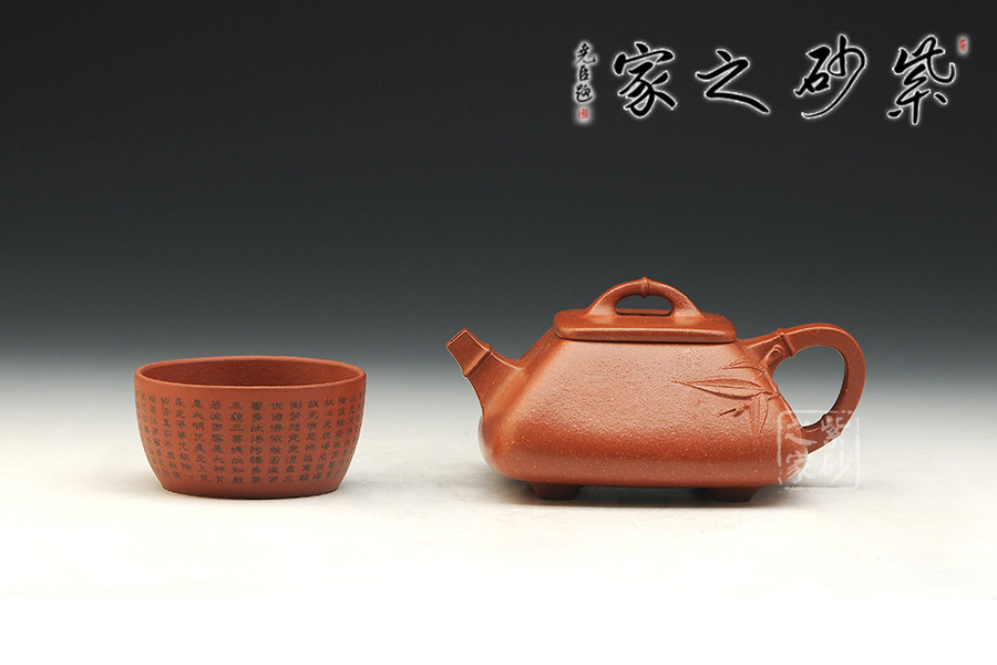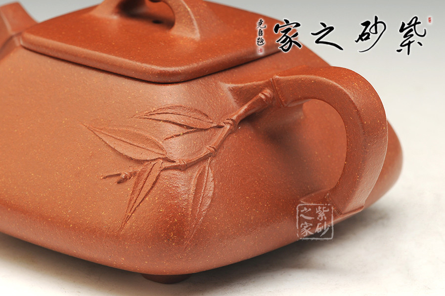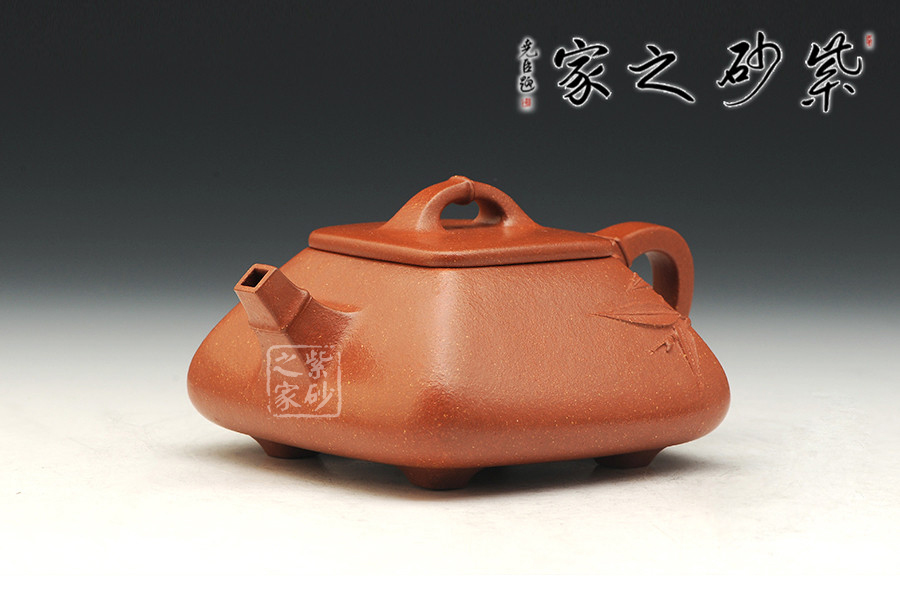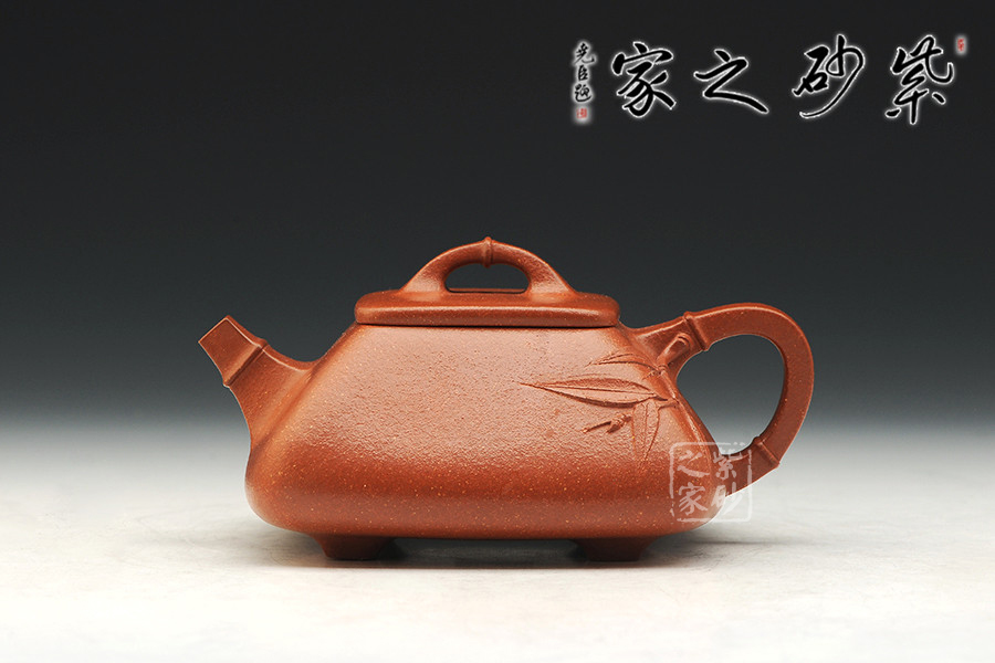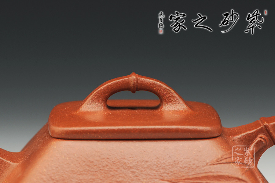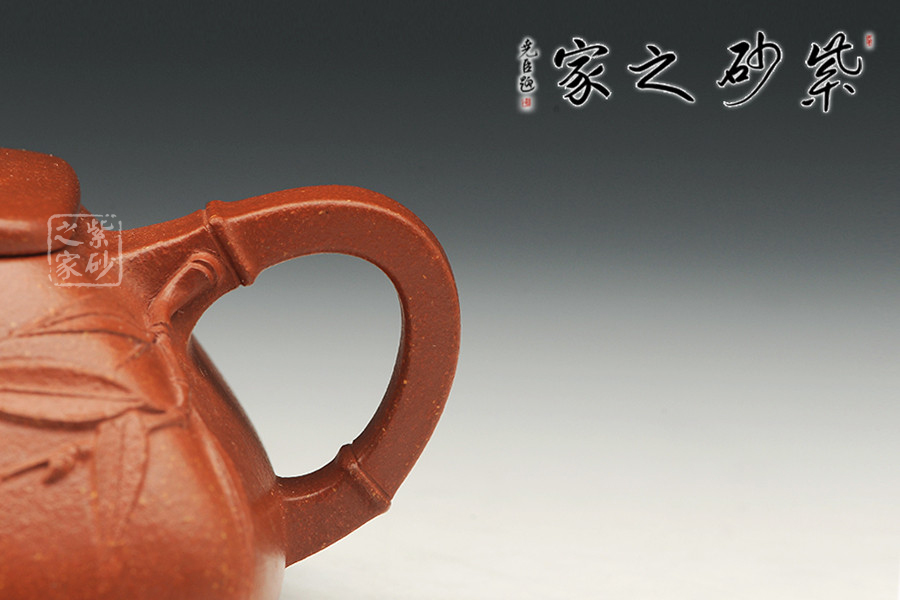 此壺器型優(yōu)美而雅致,壺面砂質(zhì)隱玉,手感細膩潤滑,氣韻高潔,肌理溫潤。壺身呈梯形,嘴、把與鈕皆以竹節(jié)為形,將竹的氣節(jié)與高雅完美展現(xiàn)。這把壺最別致的地方,是石瓢與竹節(jié)的巧妙結(jié)合。非常彰顯傳統(tǒng)的文人追求和趣味。壺鈕、壺嘴、壺把的地方分別用竹段做裝飾,雖曲而不柔,既展現(xiàn)了竹這一自然物的生長態(tài)勢,又蘊含了不屈的生命力。暗接直流嘴上翹角度很高出水十分有勁道,三角壺把折轉(zhuǎn)有力,端握舒適,無處不吐露出渾厚的氣息,更是一種大氣風范。