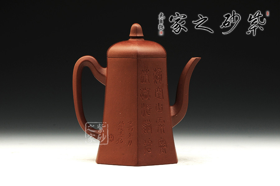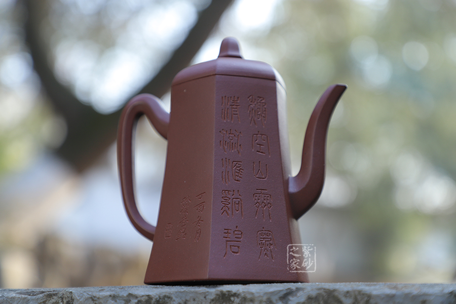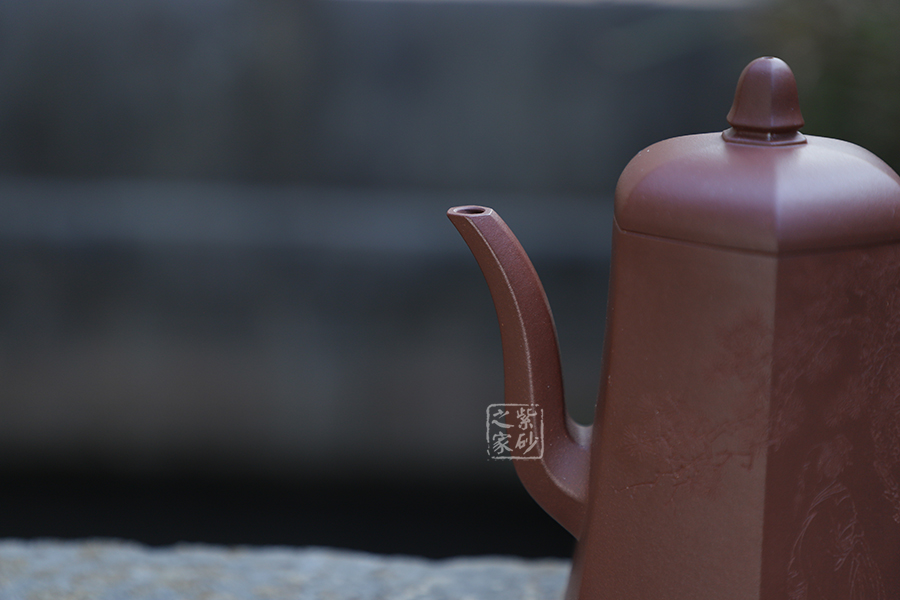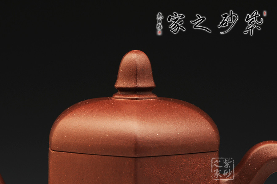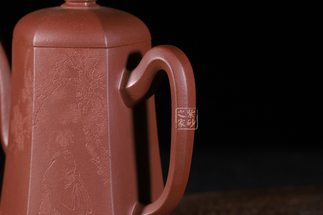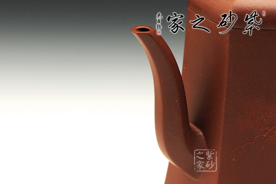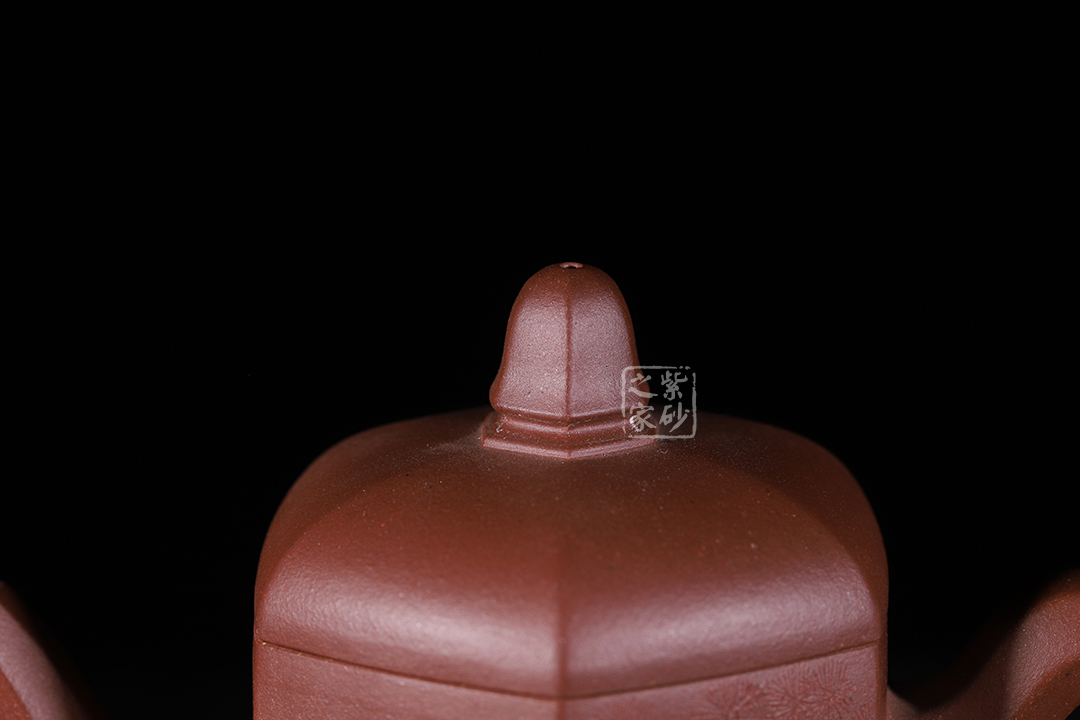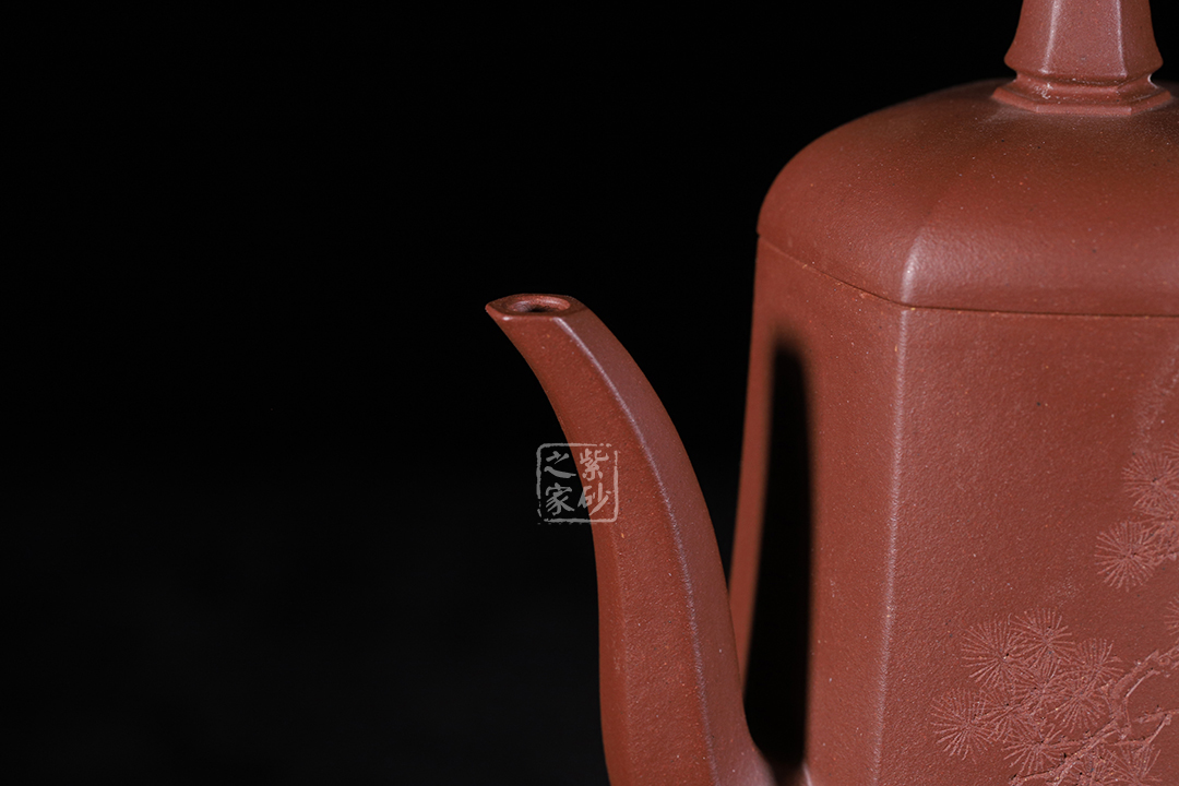 整器以金鐘為型,形制規(guī)整,壺身呈六方造型,并向下漸漸擴(kuò)張,六方平蓋與壺身融為一體,有如一氣呵成;耳形把方中寓圓,把握舒適;流呈六方有棱,修長三變,出水利落。鈕、蓋、把、流、身筒都極具鮮明的幾何特色,很有視覺沖擊力,做工嚴(yán)謹(jǐn)。作品直露中有迂回,深緩處有起伏,無論折高折遠(yuǎn)或置陳布勢的變化,凝重中不失輕巧的藝術(shù)效果。