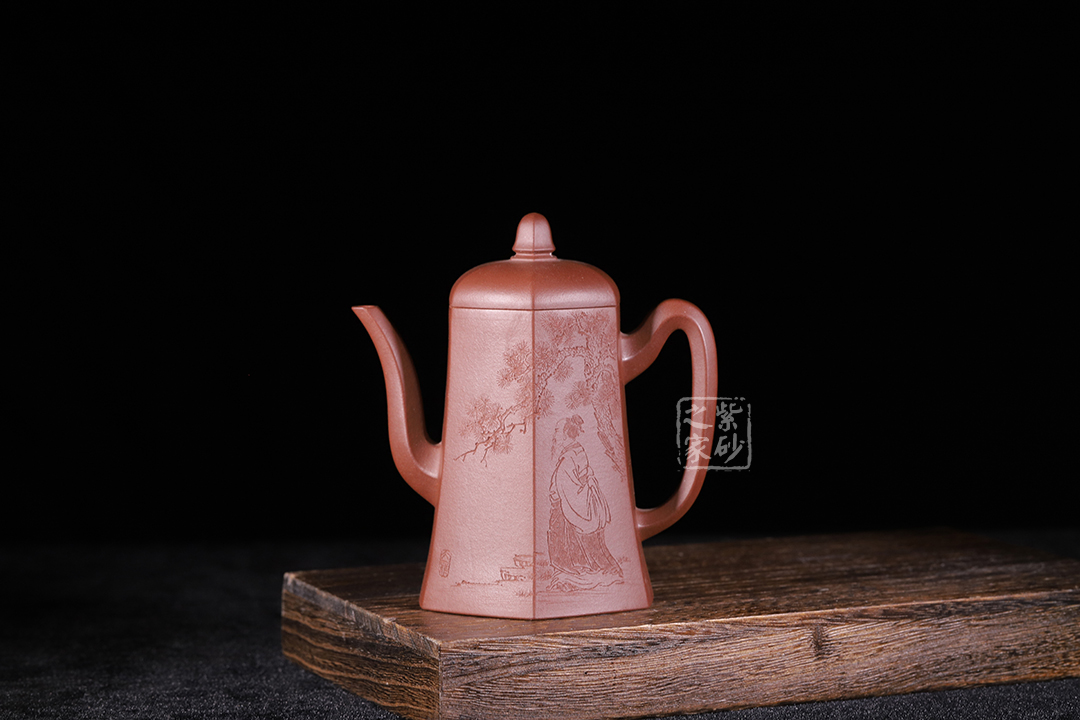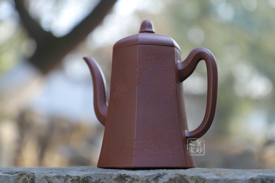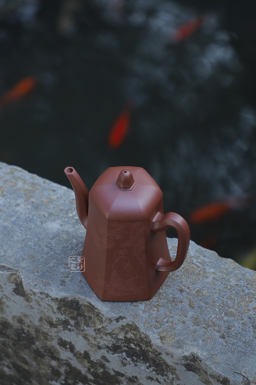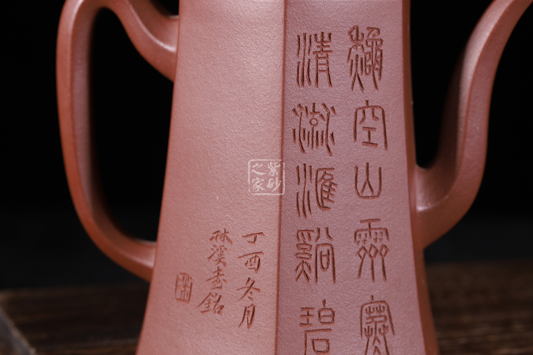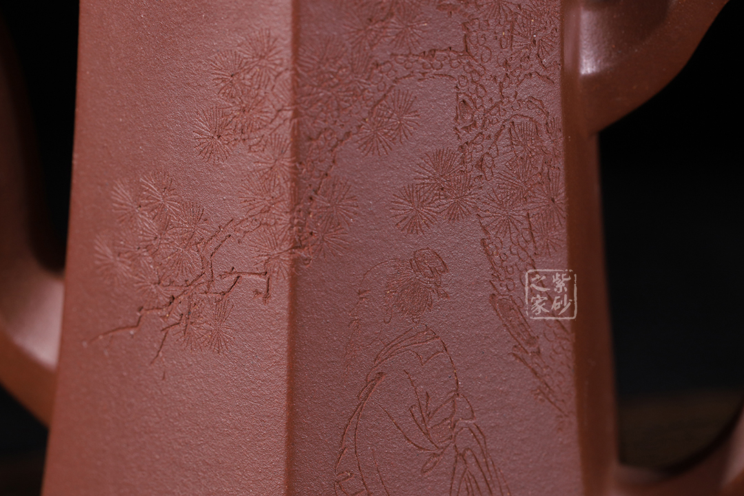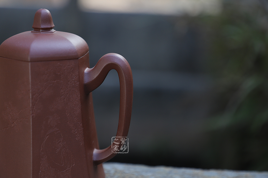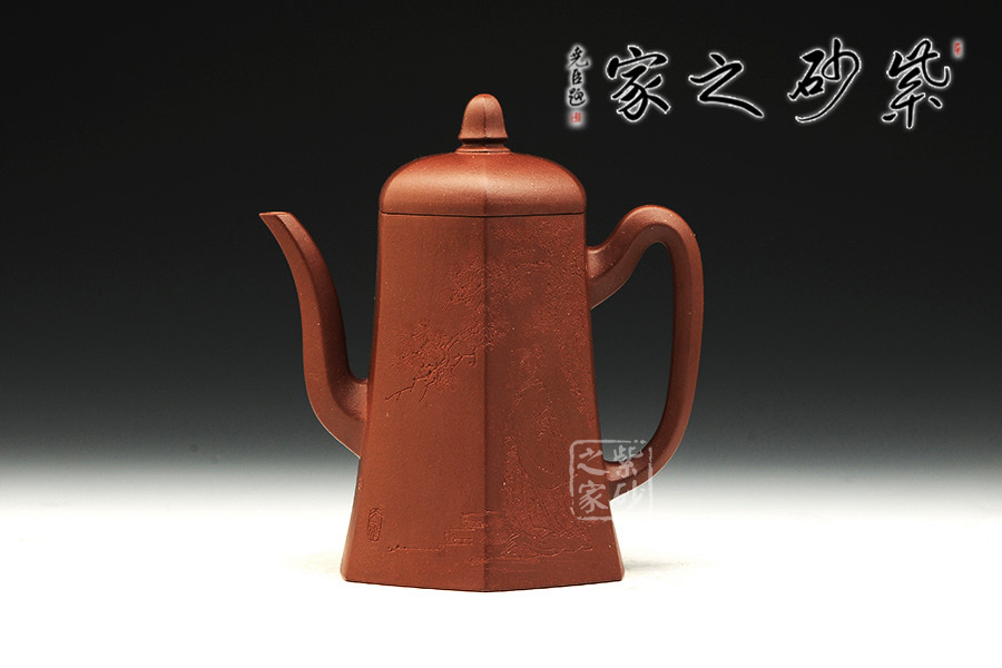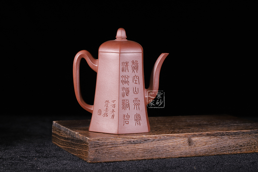 整器以金鐘為型,形制規(guī)整,壺身呈六方造型,并向下漸漸擴(kuò)張,六方平蓋與壺身融為一體,有如一氣呵成;耳形把方中寓圓,把握舒適;流呈六方有棱,修長三變,出水利落。鈕、蓋、把、流、身筒都極具鮮明的幾何特色,很有視覺沖擊力,做工嚴(yán)謹(jǐn)。作品直露中有迂回,深緩處有起伏,無論折高折遠(yuǎn)或置陳布勢的變化,凝重中不失輕巧的藝術(shù)效果。