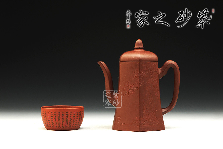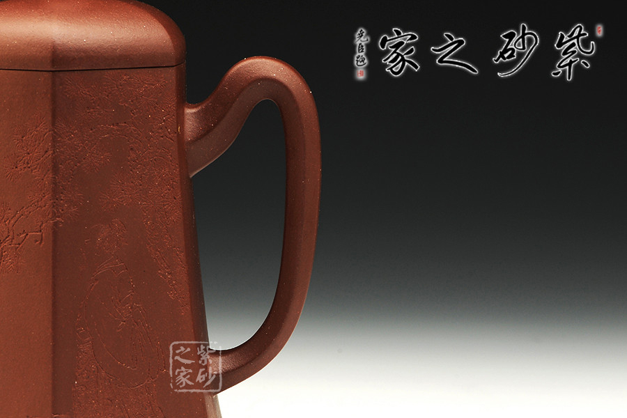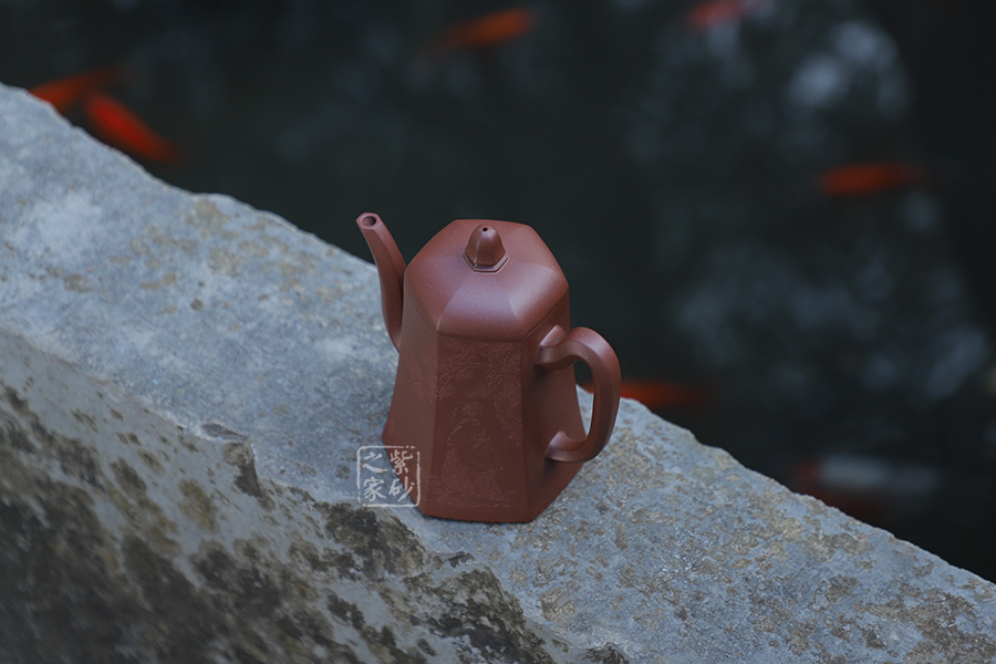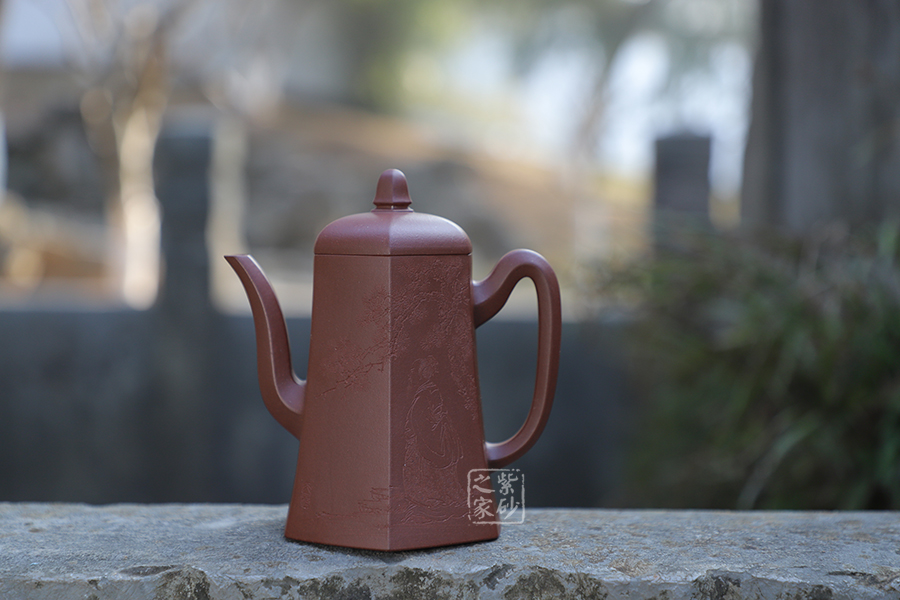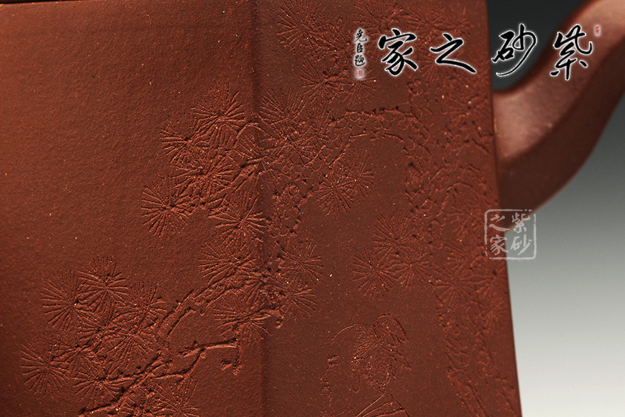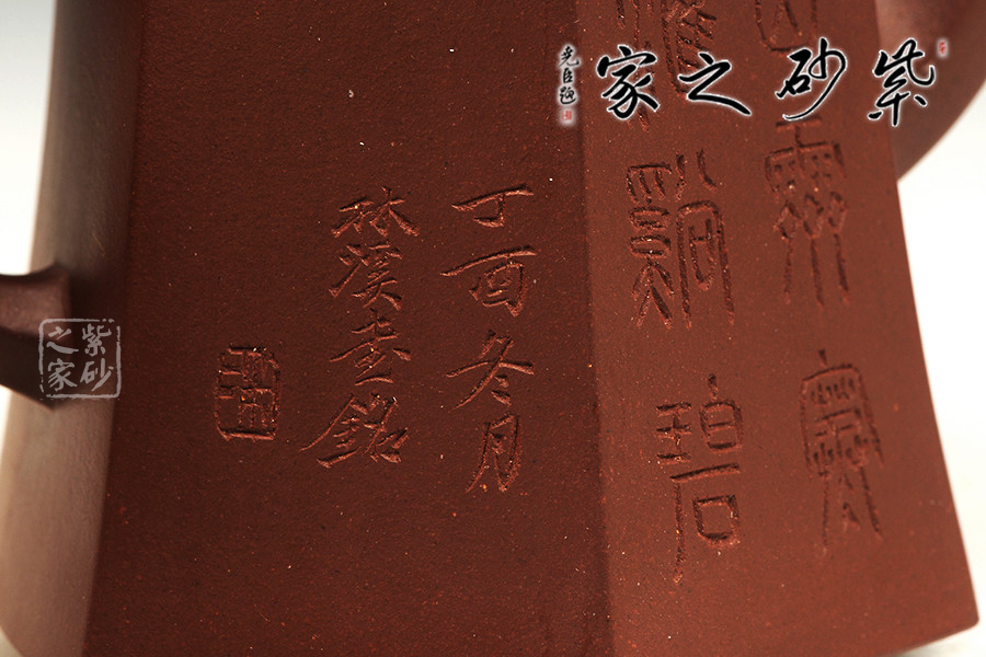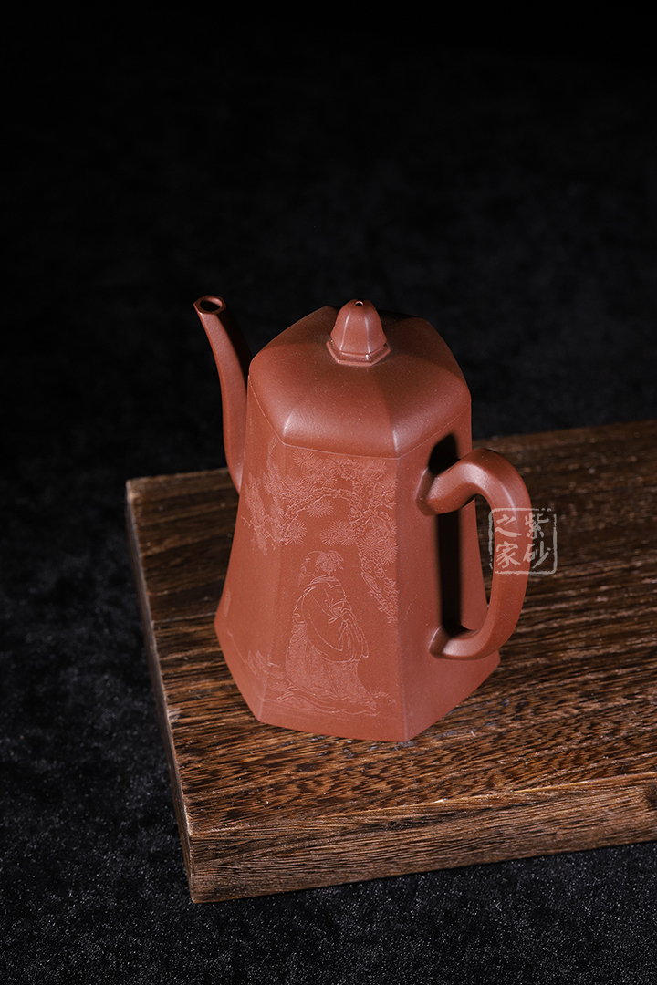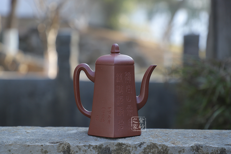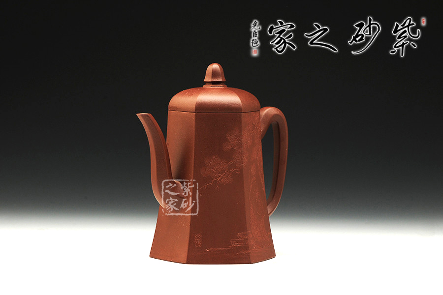 整器以金鐘為型,形制規(guī)整,壺身呈六方造型,并向下漸漸擴(kuò)張,六方平蓋與壺身融為一體,有如一氣呵成;耳形把方中寓圓,把握舒適;流呈六方有棱,修長三變,出水利落。鈕、蓋、把、流、身筒都極具鮮明的幾何特色,很有視覺沖擊力,做工嚴(yán)謹(jǐn)。作品直露中有迂回,深緩處有起伏,無論折高折遠(yuǎn)或置陳布勢的變化,凝重中不失輕巧的藝術(shù)效果。