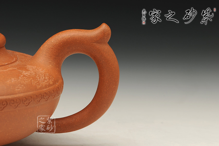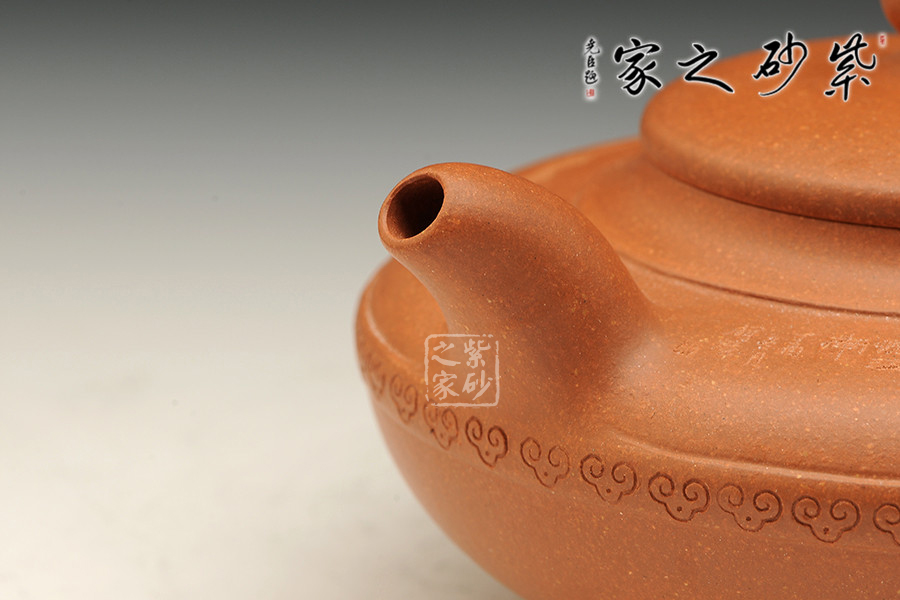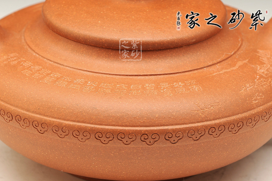 行話“造型扁一分,成型難一分”,此件作品以簡練的線條構成淳樸凝重的形體,深厚且具神韻,設計上空間明快,虛實和諧,提攜舒適,線條柔和,整體雄渾肅穆。作品做工精細,無不體現(xiàn)老師技藝精湛,手法高超,此壺壺口朝天,壺把流暢,壺蓋向上鼓起,壺鈕也是精雕細琢的如意造型,整個壺體顯得大氣而又不失雅態(tài)。壺腹的祥云圖案,寓意吉祥如意。