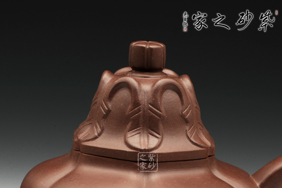 作品以芝麻果為題材經(jīng)提煉加工而成,器身分為六瓣筋紋,瓣面大小如一,凹凸有序,腴而不腫,且表面張力于角,自上而下貫通一氣,通暢自然,韻律節(jié)奏感十分貼切。壺肩到壺身的轉(zhuǎn)角呈渾方狀,鈍而不圓,呈現(xiàn)出勻稱豐腴的實相,壺底,口,蓋均以六棱筋紋貫成一體,工藝精致。口蓋轉(zhuǎn)換自如,壺鈕恰似一粒頂珠,以頂珠為中心,一組芝麻葉自然垂落,覆于蓋面之上。整器莊重古樸之中又不乏飄逸優(yōu)美,清秀雅麗,使人有耳目一新之感覺。